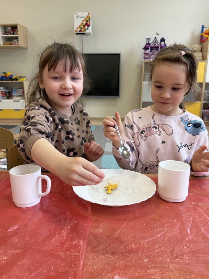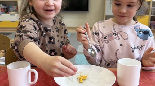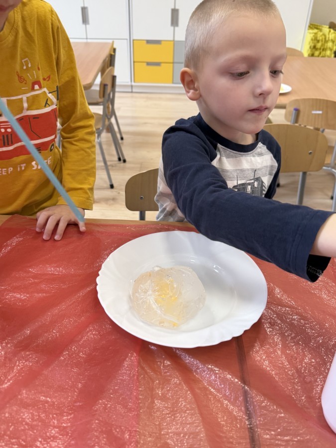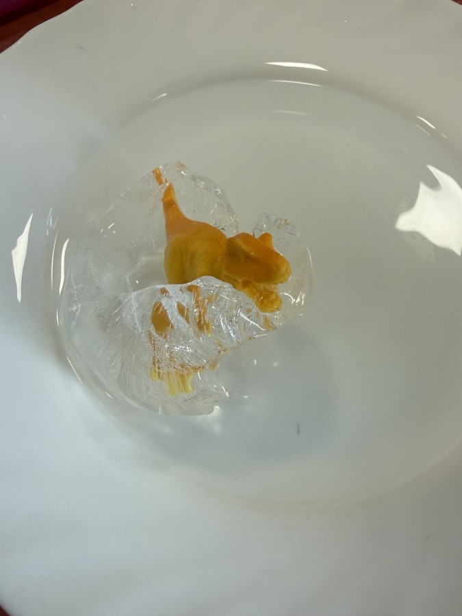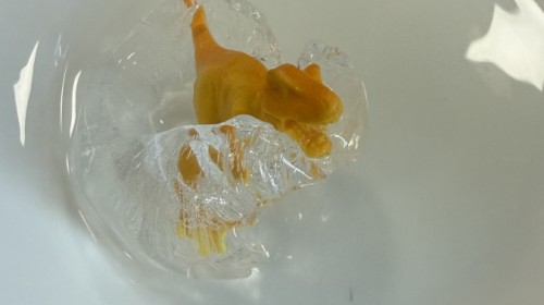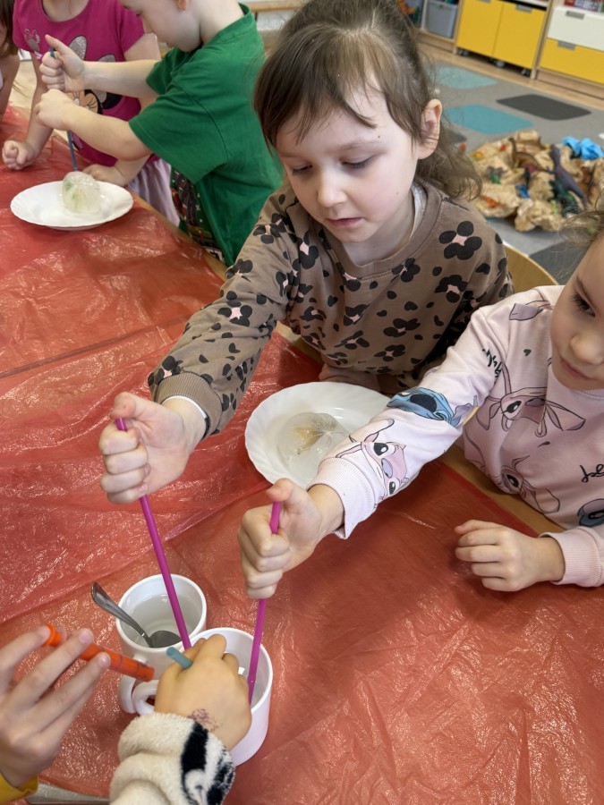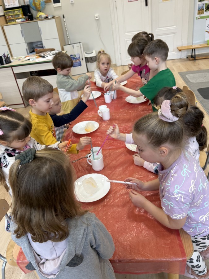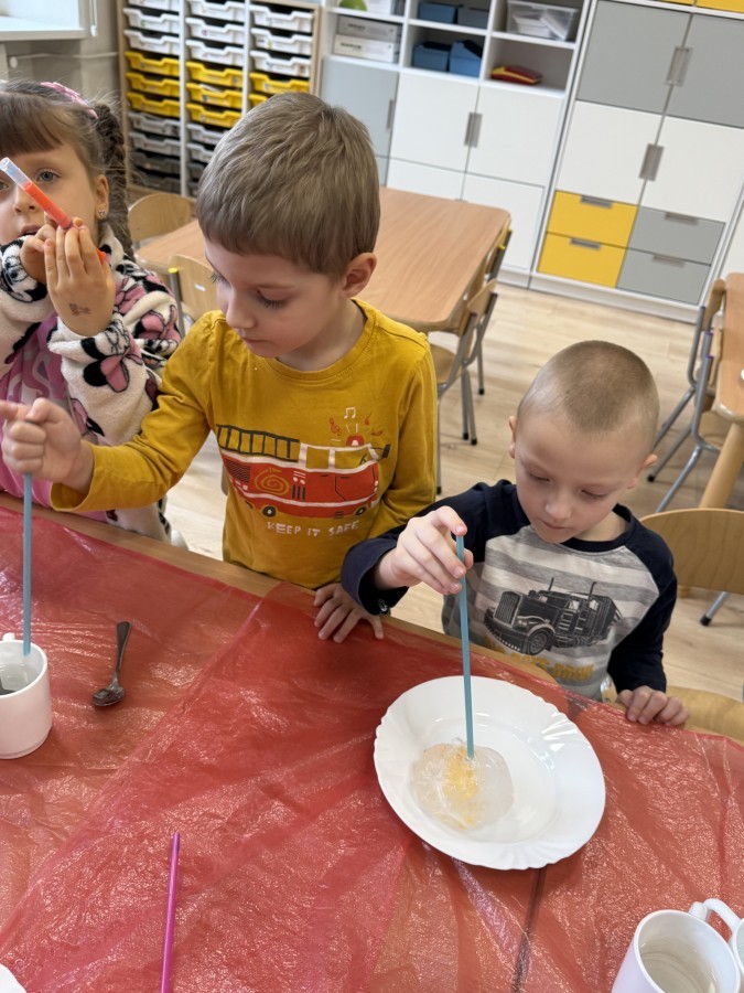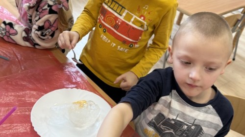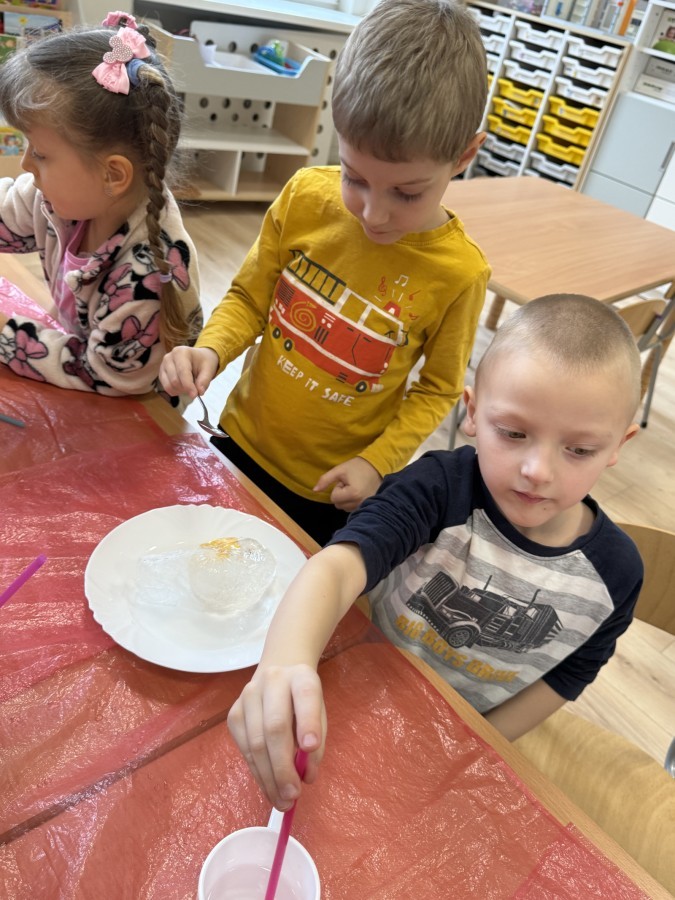Najwięcej emocji wzbudziło doświadczenie z lodowymi jajami dinozaurów. W zamrożonych bryłach lodu ukryte były małe figurki, które dzieci próbowały uwolnić. Do dyspozycji miały zimną wodę, letnią wodę, wodę z solą oraz samą sól. Dzięki temu mogły sprawdzić, co najszybciej rozpuszcza lód.