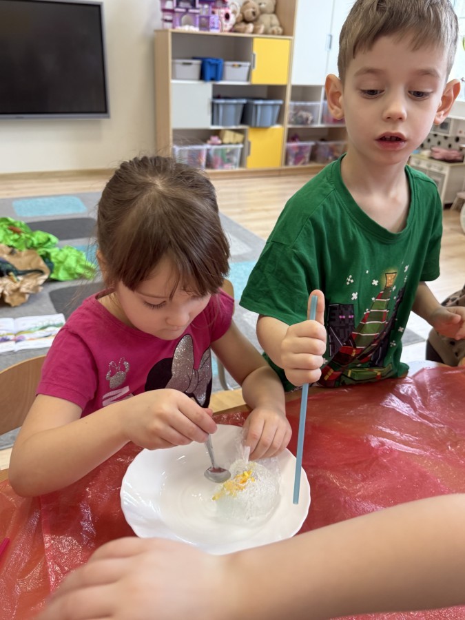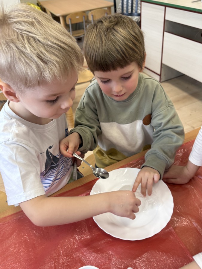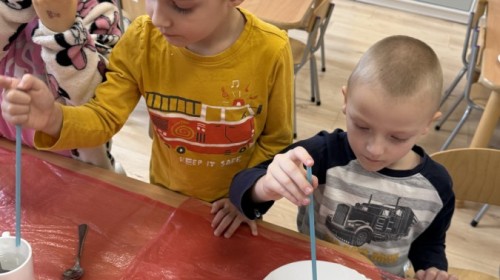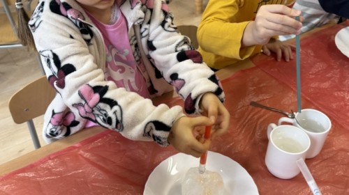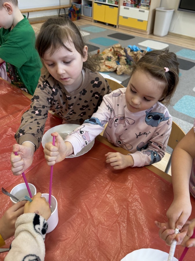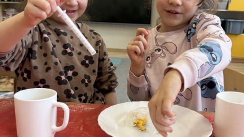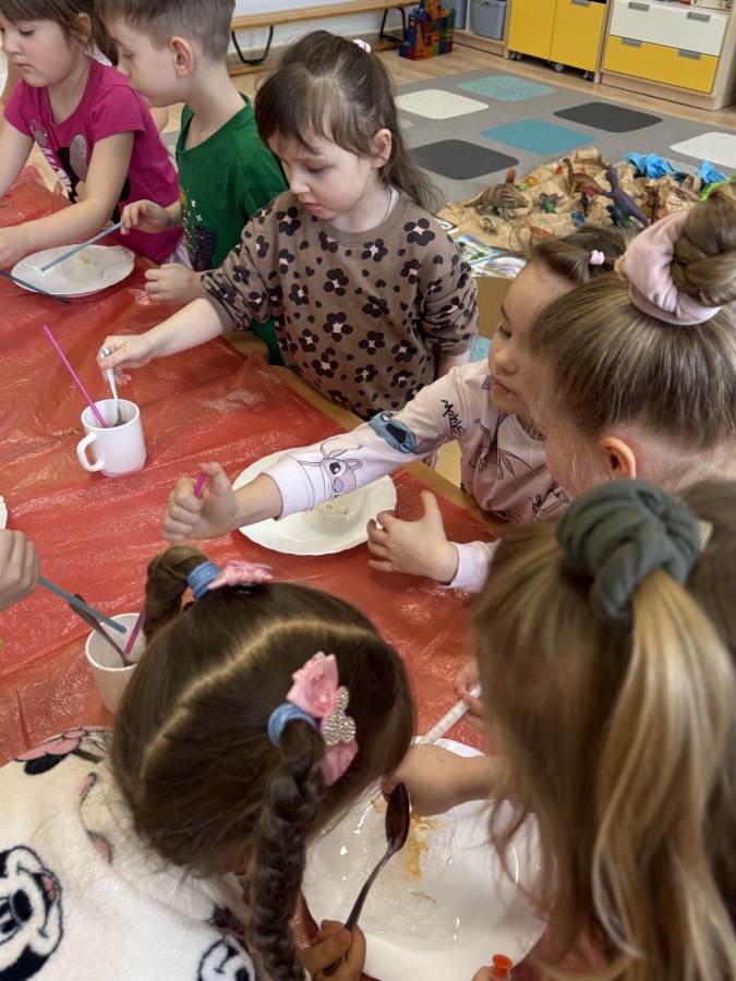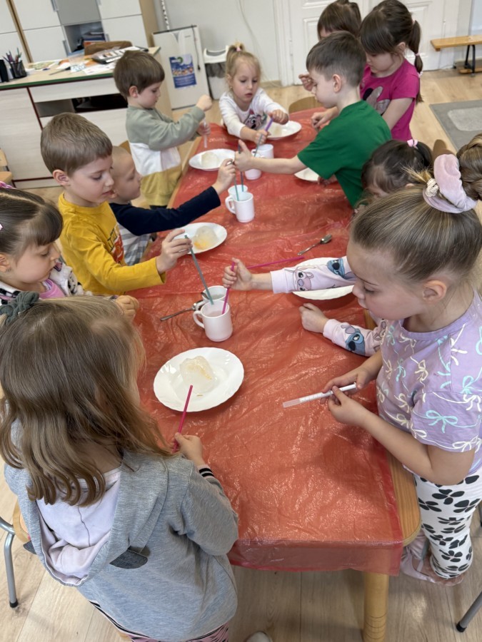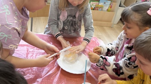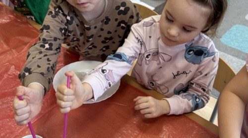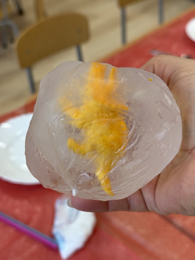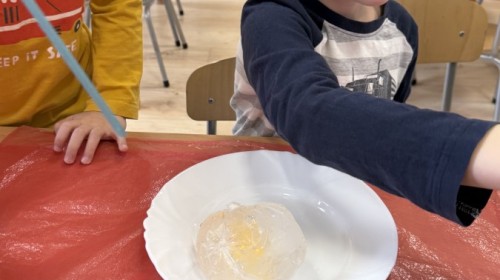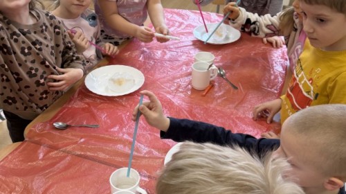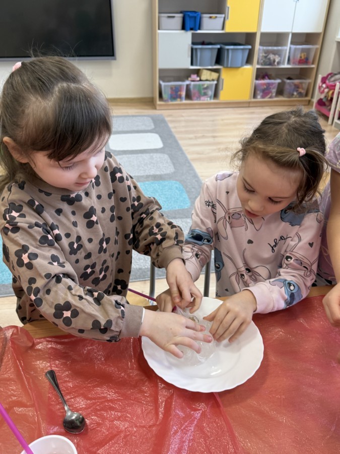 Najwięcej emocji wzbudziło doświadczenie z lodowymi jajami dinozaurów. W zamrożonych bryłach lodu ukryte były małe figurki, które dzieci próbowały uwolnić. Do dyspozycji miały zimną wodę, letnią wodę, wodę z solą oraz samą sól. Dzięki temu mogły sprawdzić, co najszybciej rozpuszcza lód.