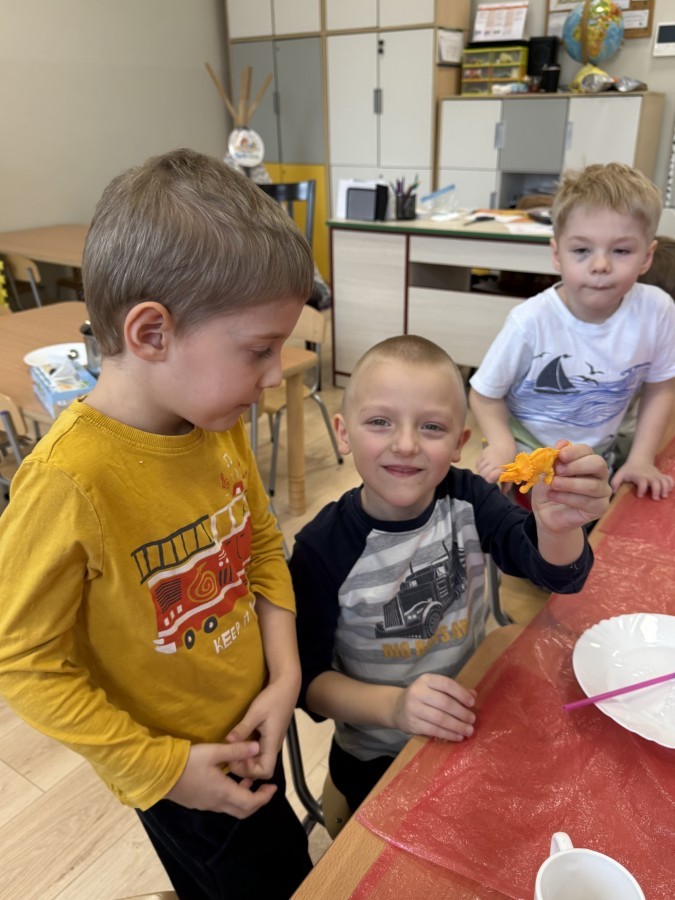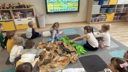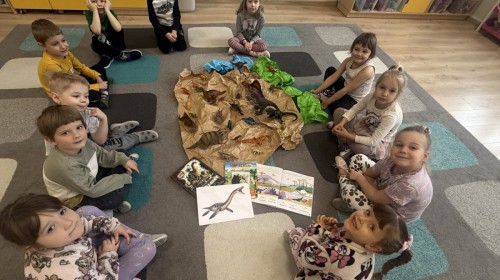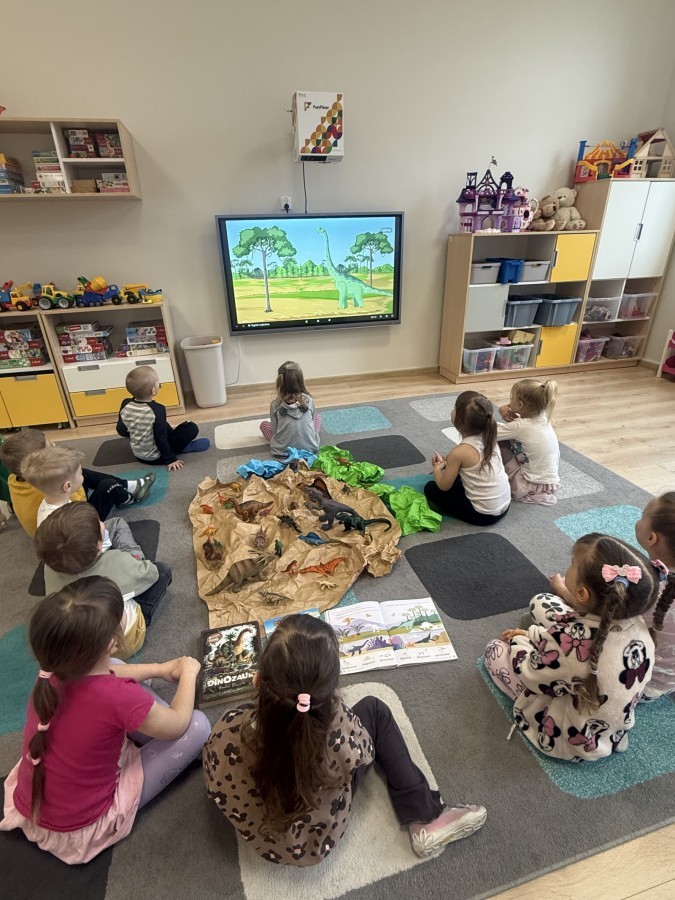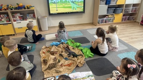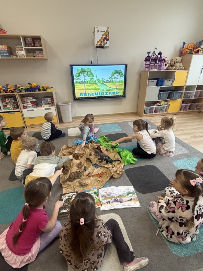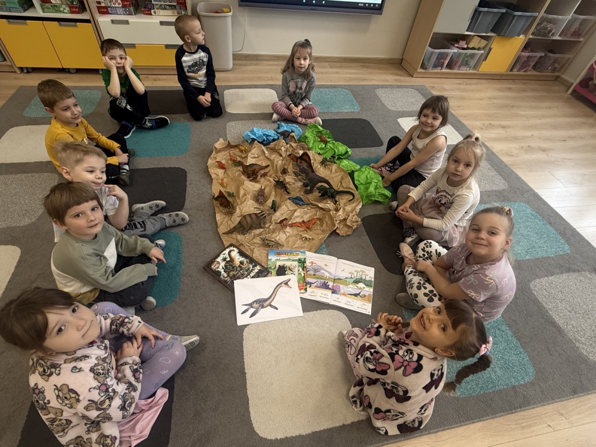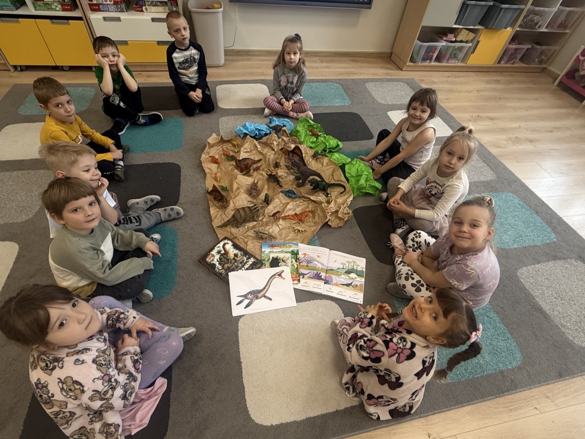 W naszej grupie Średniaków obchodziliśmy wyjątkowy Dzień Dinozaura. Była to doskonała okazja, aby przenieść się do odległych czasów, gdy po Ziemi chodziły ogromne prehistoryczne gady. Podczas zajęć dzieci poznały krótką historię dinozaurów – dowiedziały się, kiedy żyły i jak wyglądał świat sprzed milionów lat. Z dużym zainteresowaniem oglądały także książki o dinozaurach oraz obejrzały film edukacyjny przybliżający życie tych niezwykłych zwierząt.