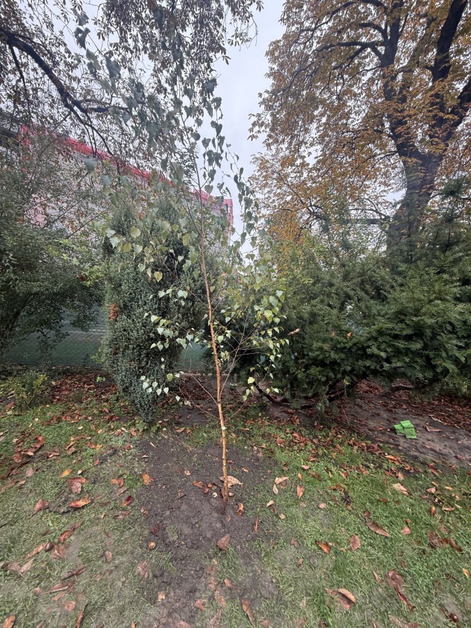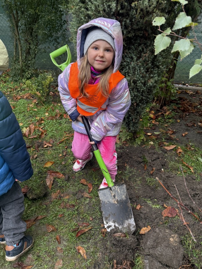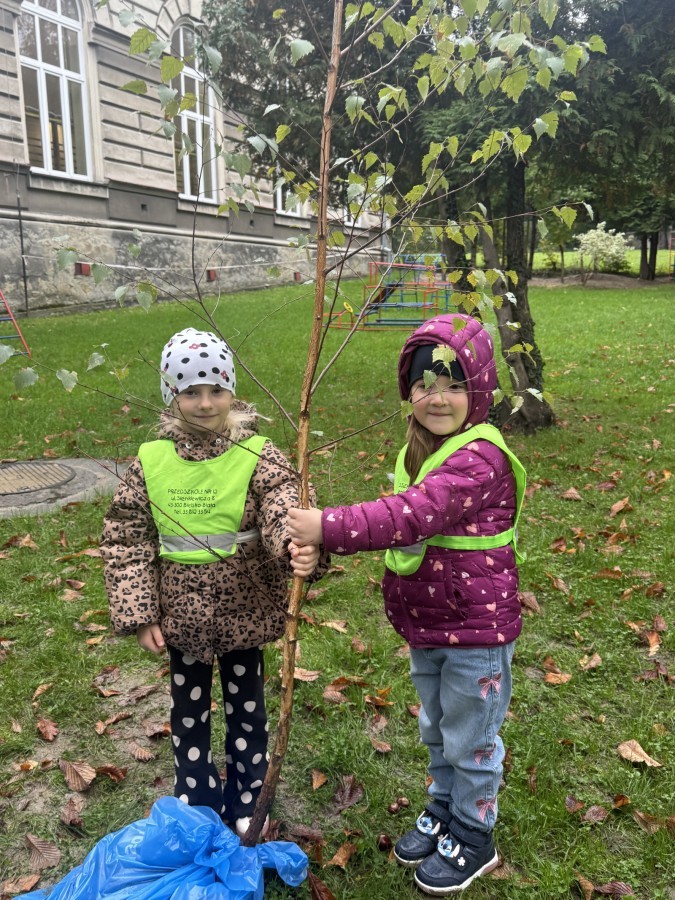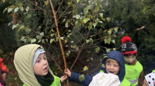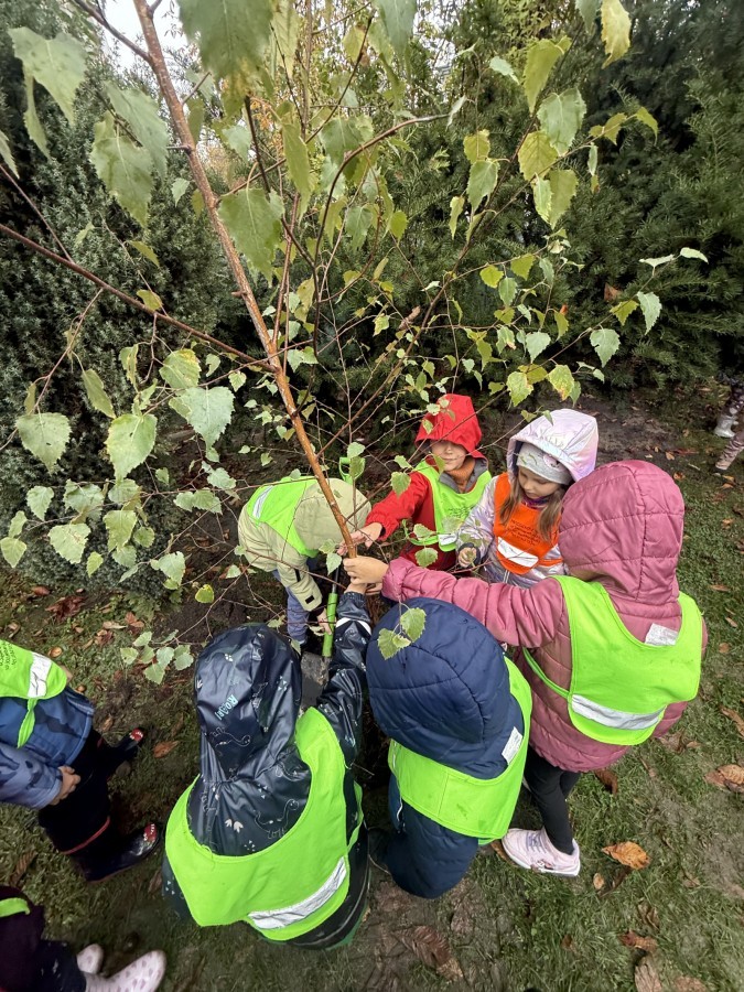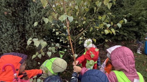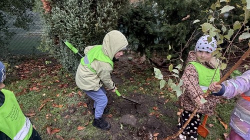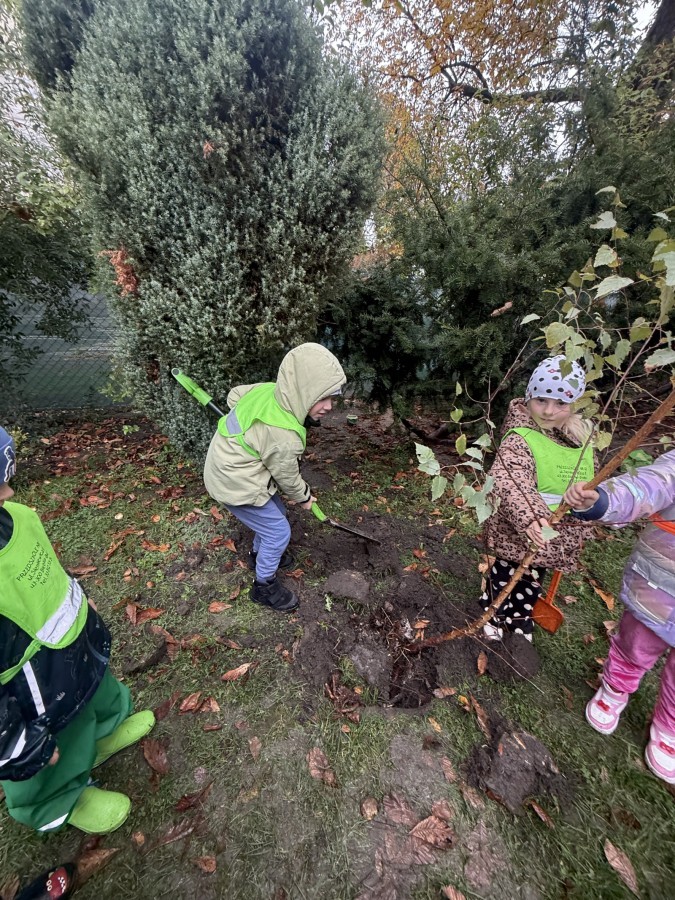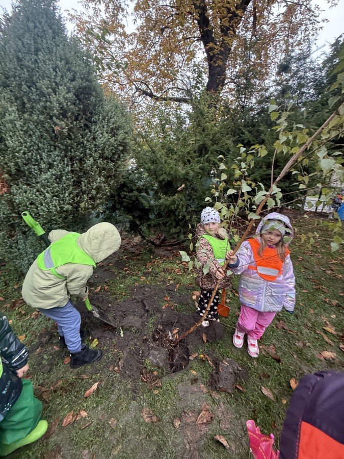 Grupa Średniaków wspólnie posadziła drzewko w ogrodzie przedszkolnym – młoda brzoza to symbol troski o naszą planetę i odpowiedzialności za środowisko.