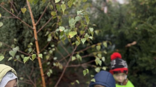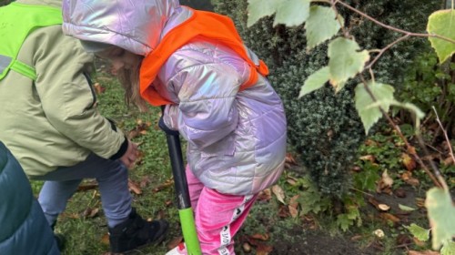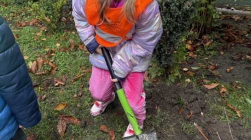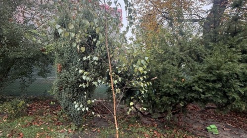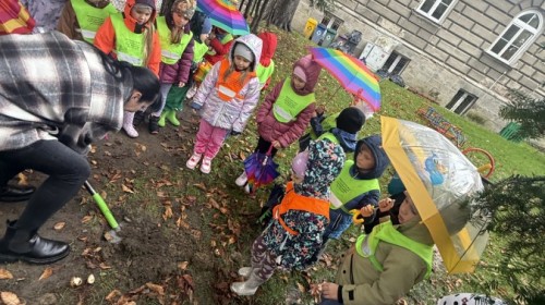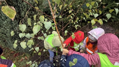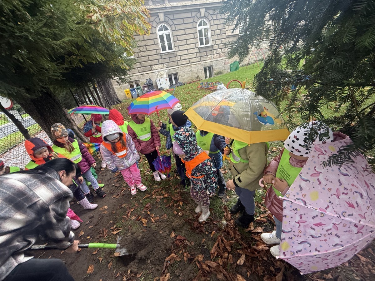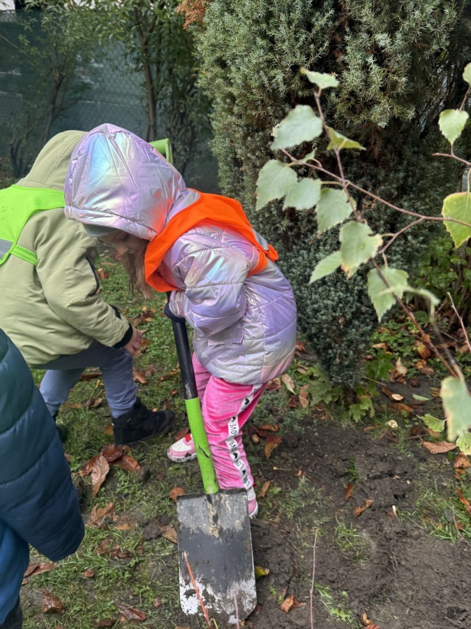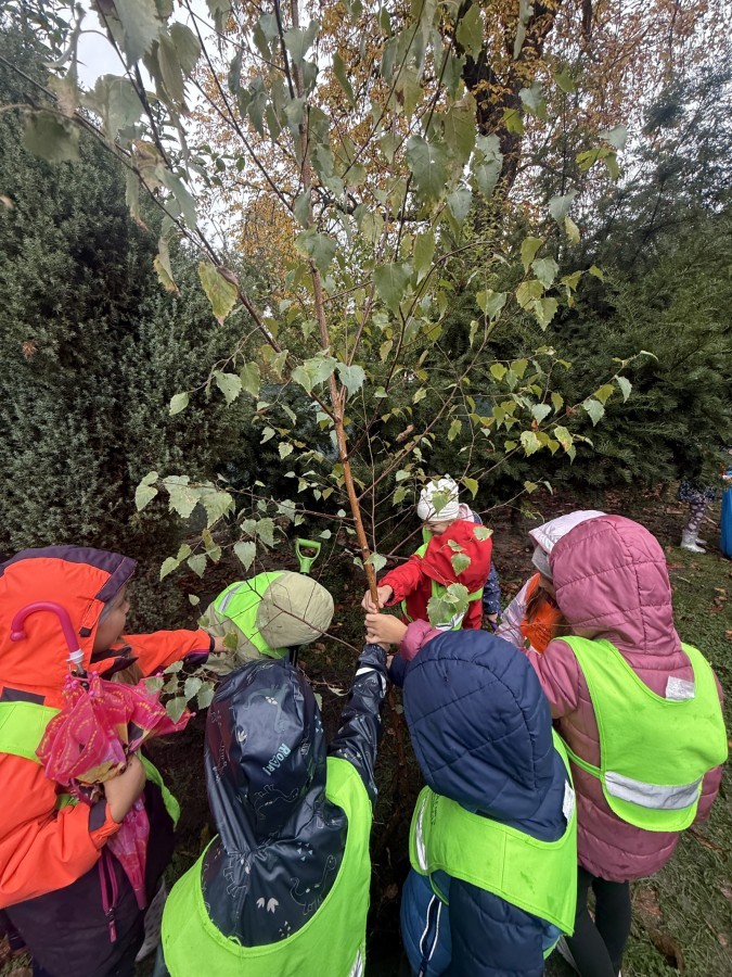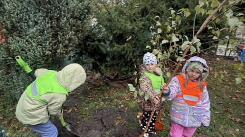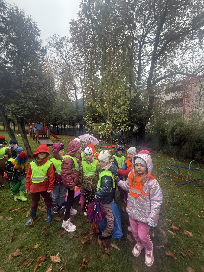 Grupa Średniaków wspólnie posadziła drzewko w ogrodzie przedszkolnym – młoda brzoza to symbol troski o naszą planetę i odpowiedzialności za środowisko.