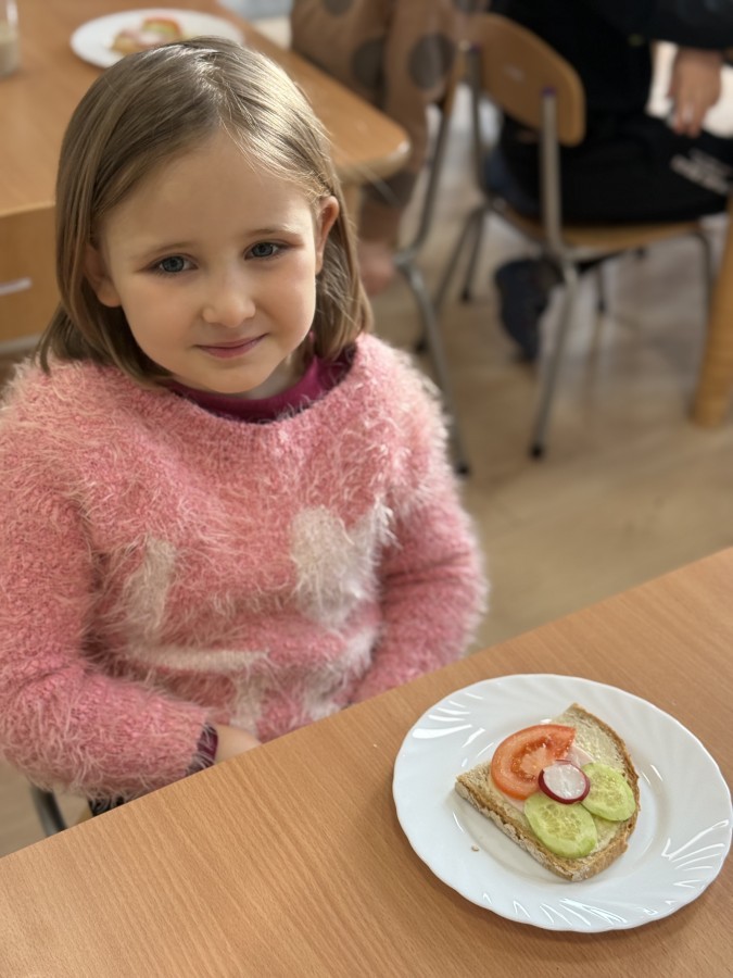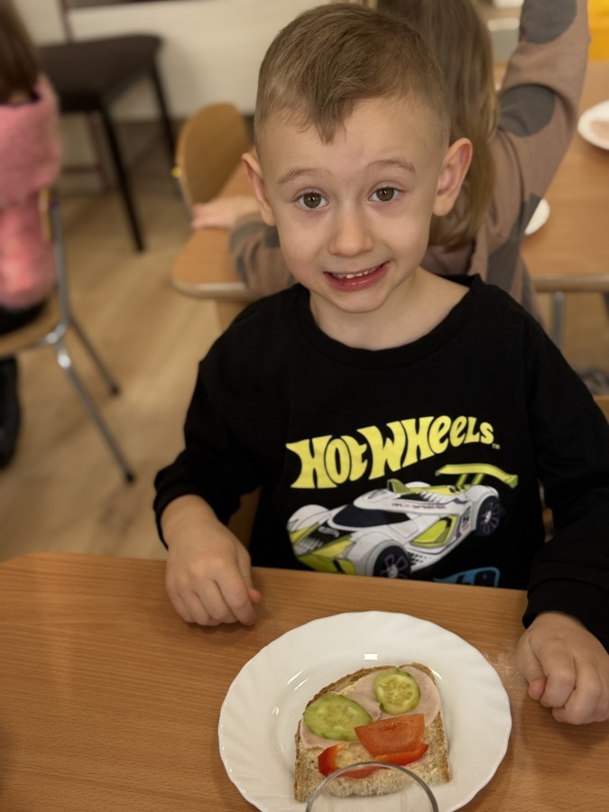 Na stołach pojawiają się świeże warzywa, pełnoziarniste pieczywo oraz wartościowe dodatki. Dzieci z ogromnym zaangażowaniem tworzą własne kulinarne kompozycje – powstają kanapkowe motylki, uśmiechnięte buzie i prawdziwe tęczowe dzieła sztuki.