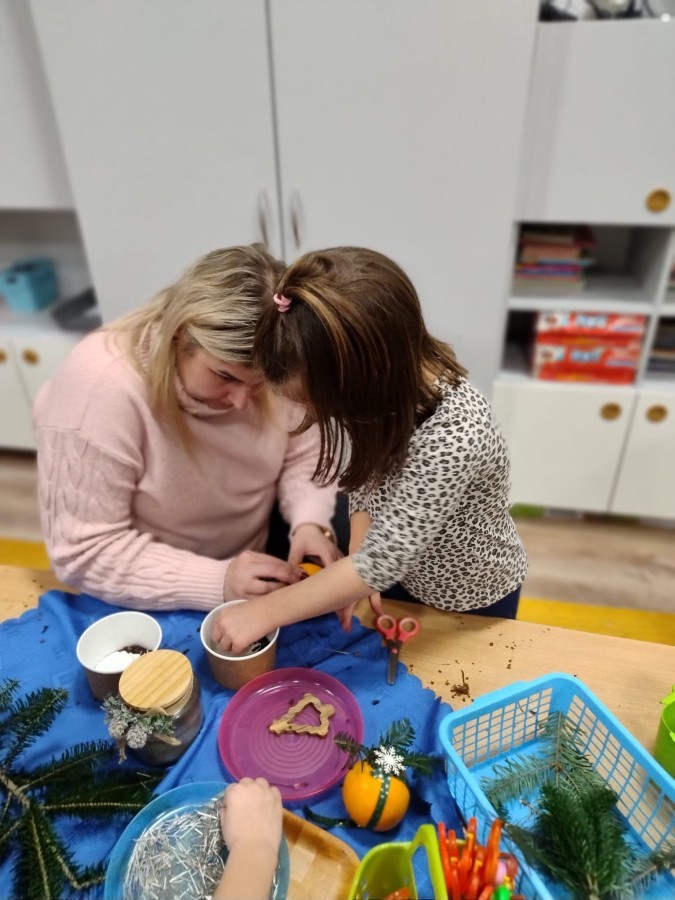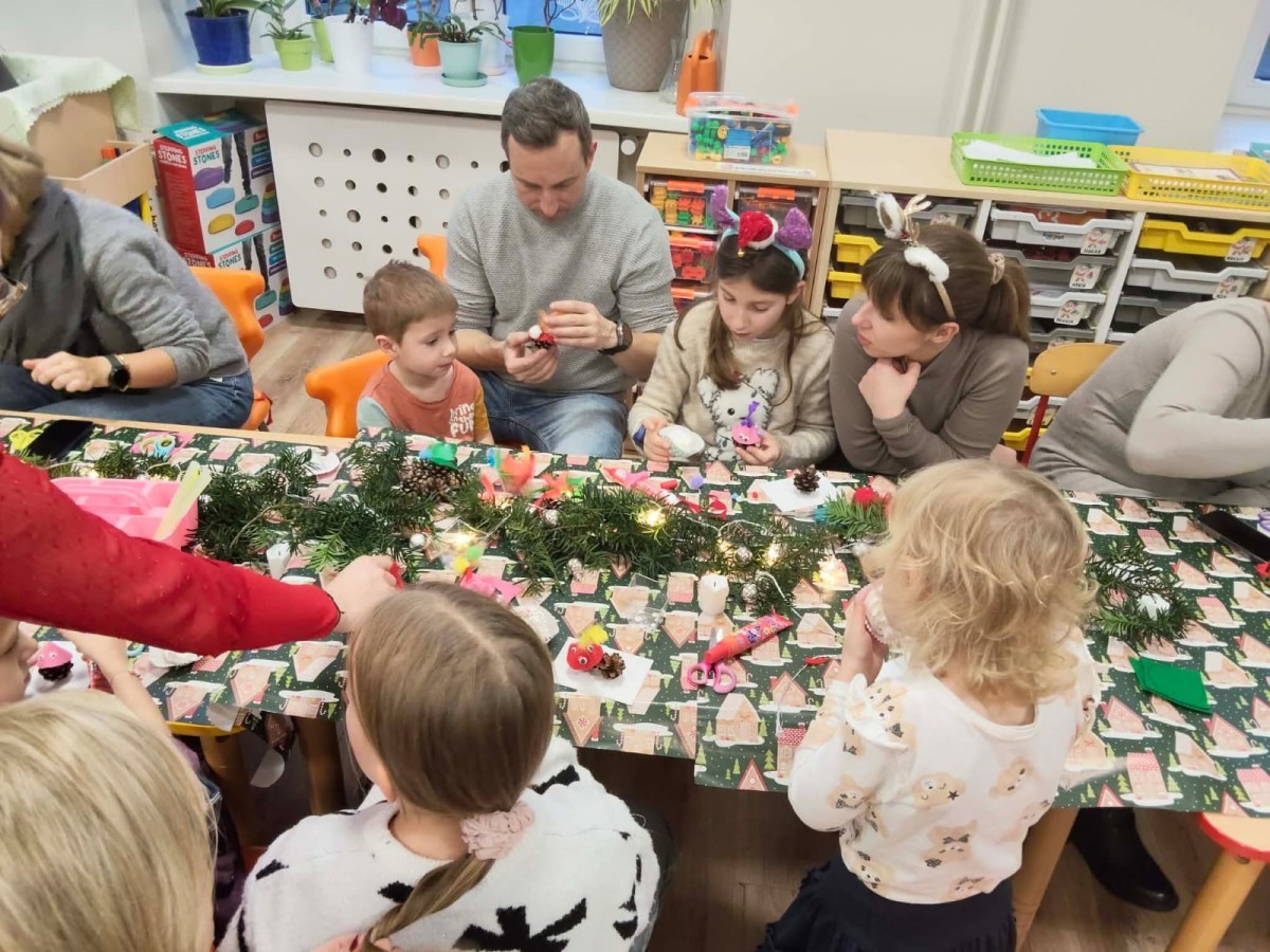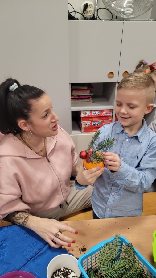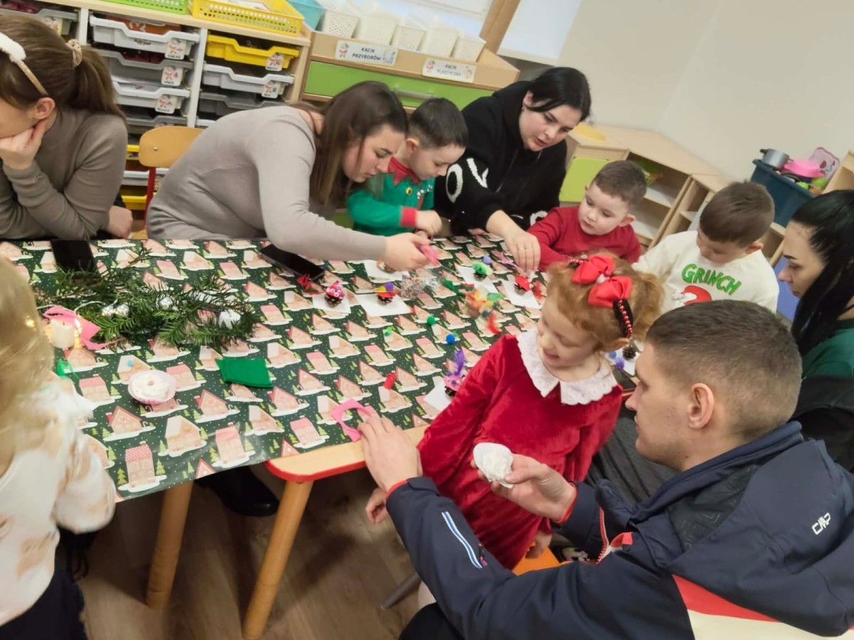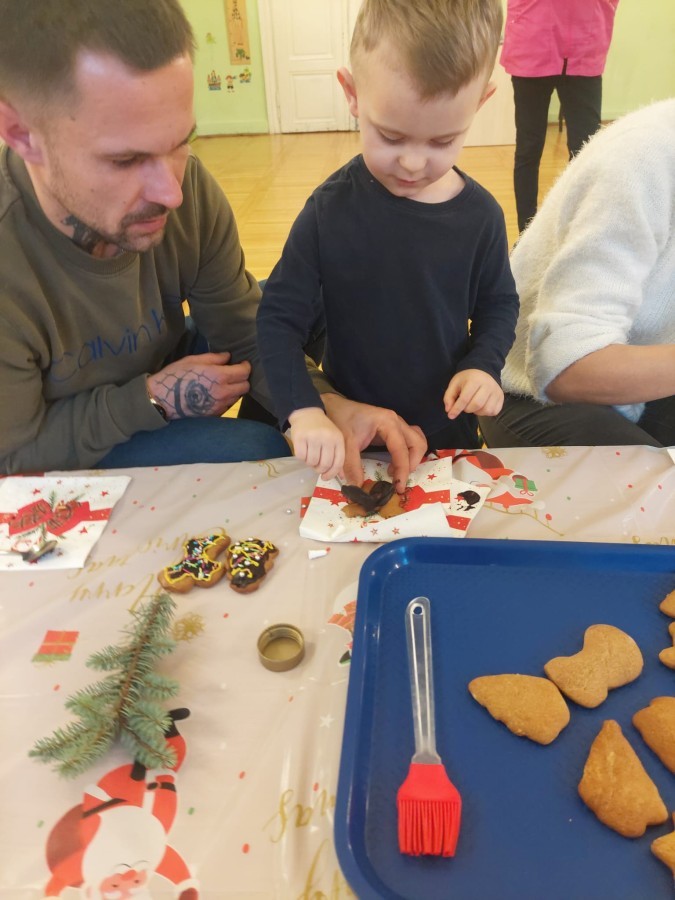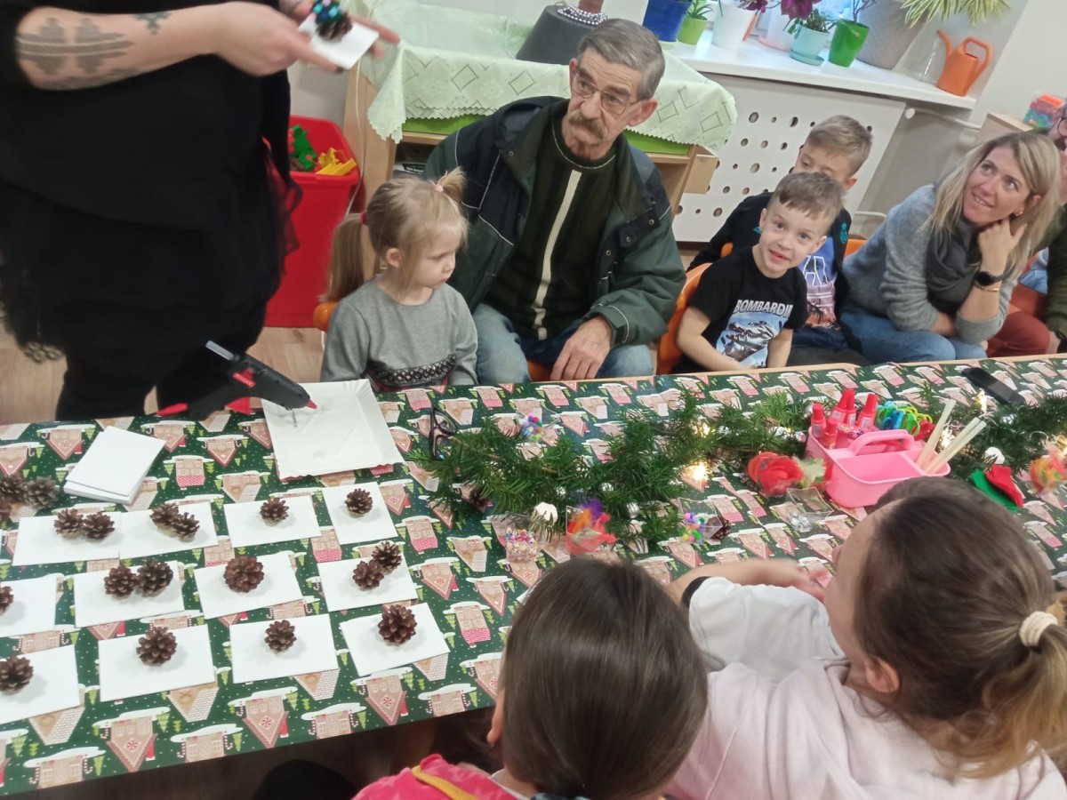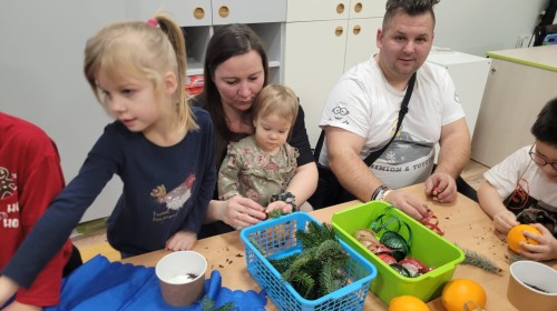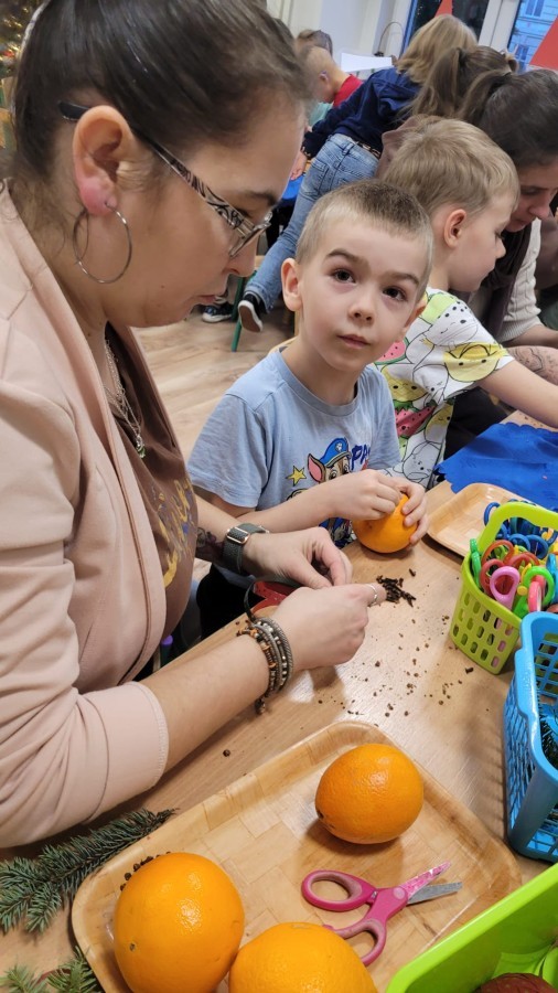 W naszej placówce odbyły się świąteczne warsztaty, które na długo pozostaną w pamięci dzieci i rodziców. Spotkanie rozpoczęło się wspólnym śpiewaniem piosenek i kolęd, tworząc ciepłą, świąteczną atmosferę. Następnie uczestnicy wzięli udział w twórczych aktywnościach – ozdabiali pomarańcze goździkami, dekorowali pierniczki, malowali gipsowe choinki oraz wykonywali papierowe łańcuchy i ludziki z szyszek. Był to czas radości, rozmów i wspólnego tworzenia, który sprzyjał integracji i pozwolił poczuć prawdziwego ducha nadchodzących świąt.