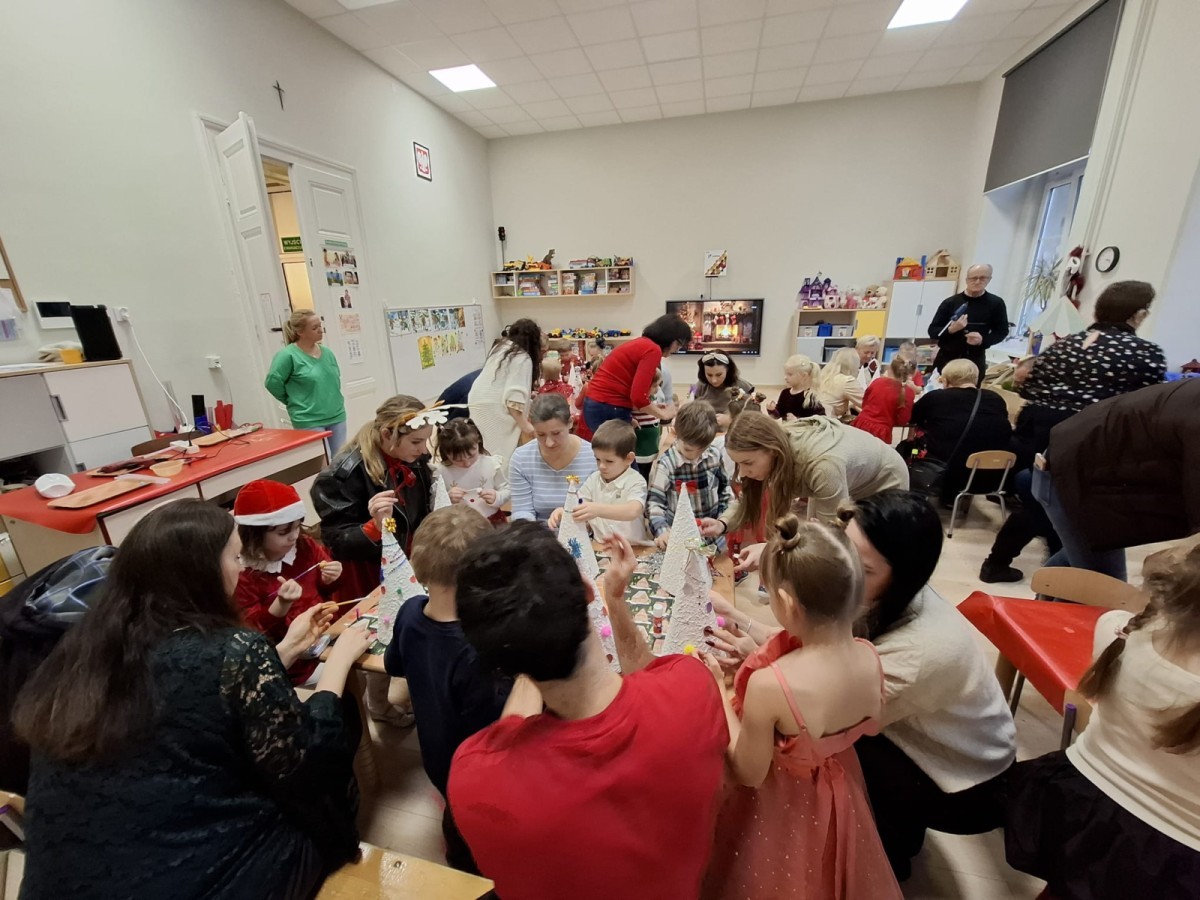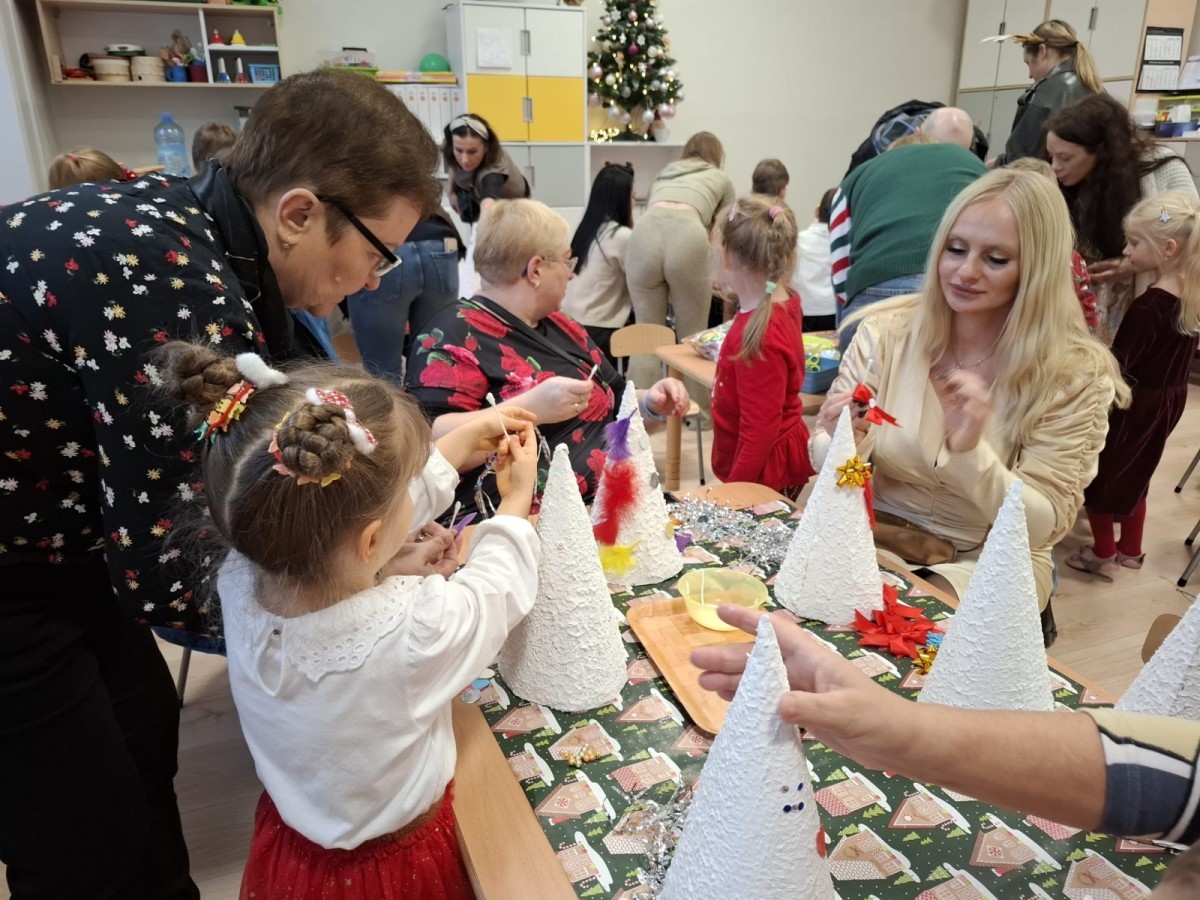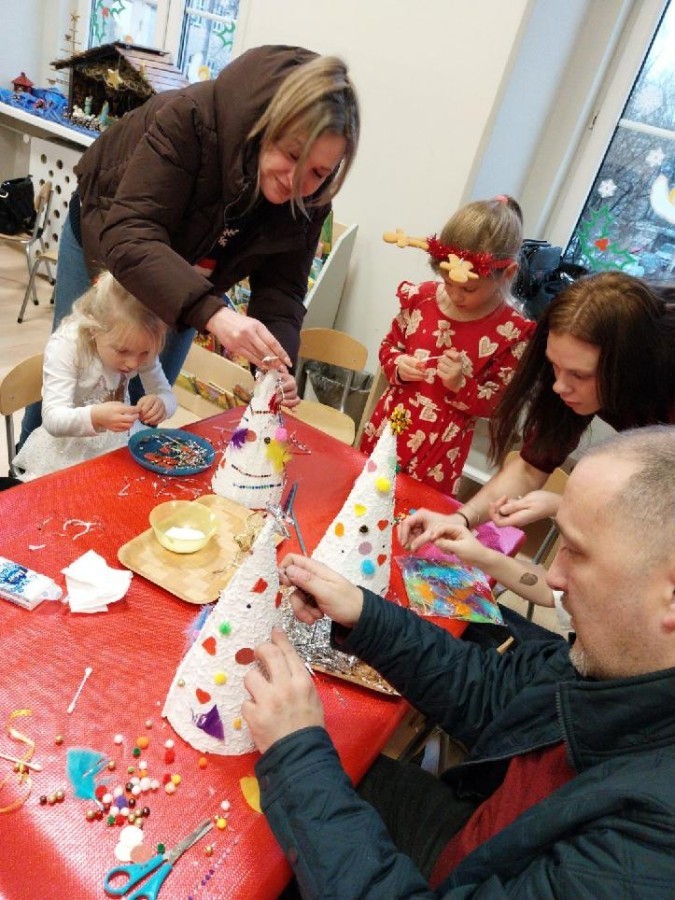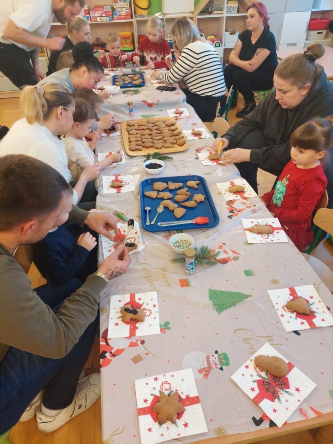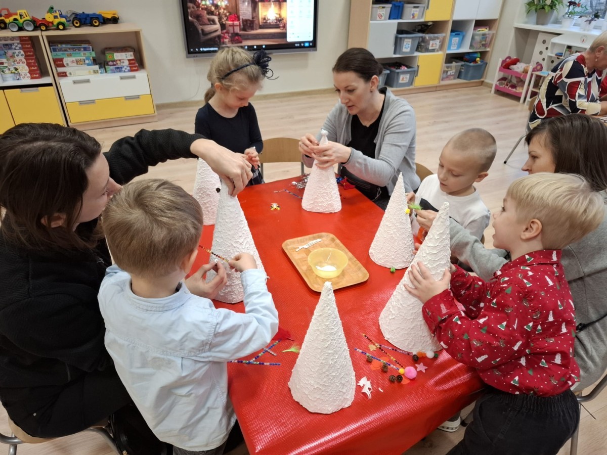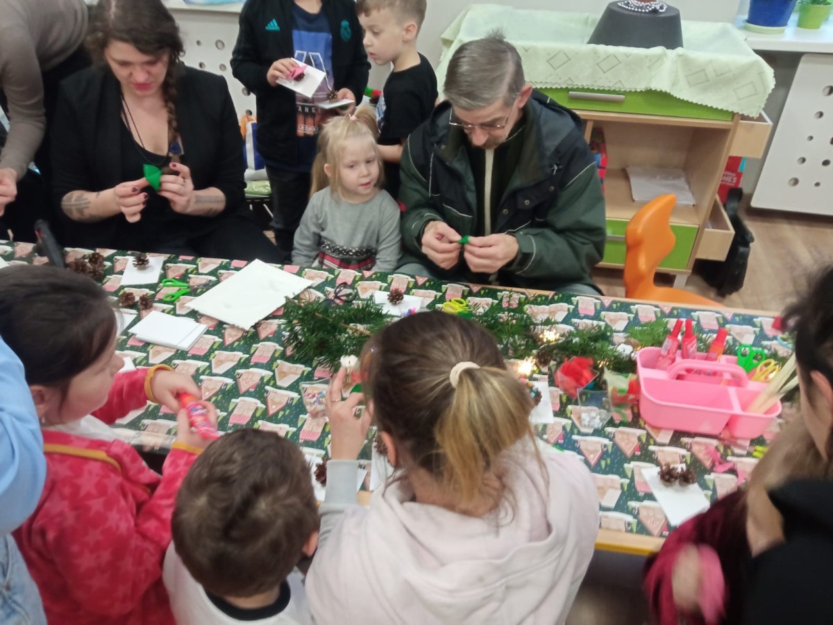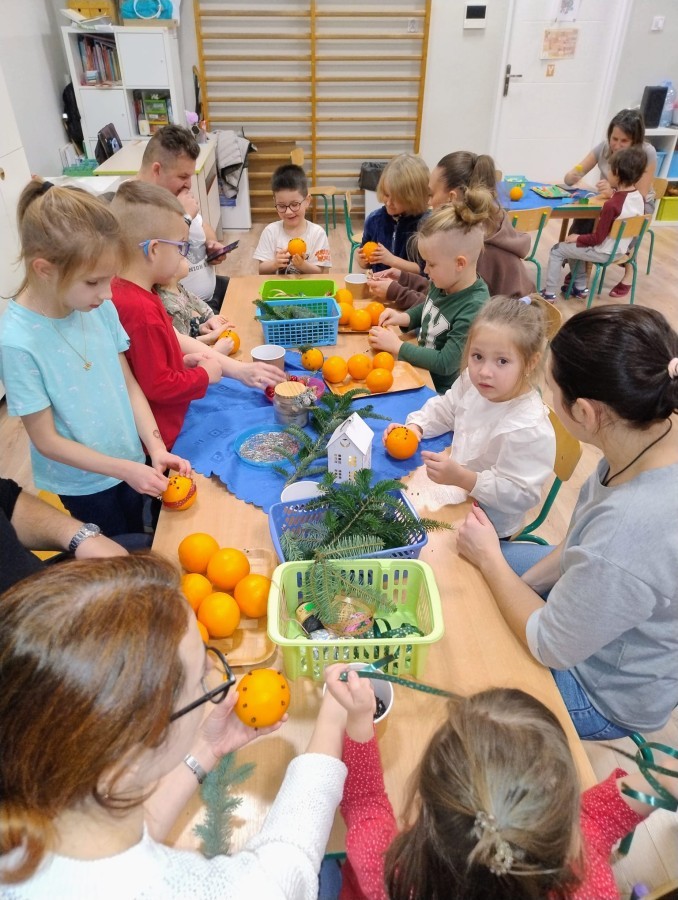 W naszej placówce odbyły się świąteczne warsztaty, które na długo pozostaną w pamięci dzieci i rodziców. Spotkanie rozpoczęło się wspólnym śpiewaniem piosenek i kolęd, tworząc ciepłą, świąteczną atmosferę. Następnie uczestnicy wzięli udział w twórczych aktywnościach – ozdabiali pomarańcze goździkami, dekorowali pierniczki, malowali gipsowe choinki oraz wykonywali papierowe łańcuchy i ludziki z szyszek. Był to czas radości, rozmów i wspólnego tworzenia, który sprzyjał integracji i pozwolił poczuć prawdziwego ducha nadchodzących świąt.