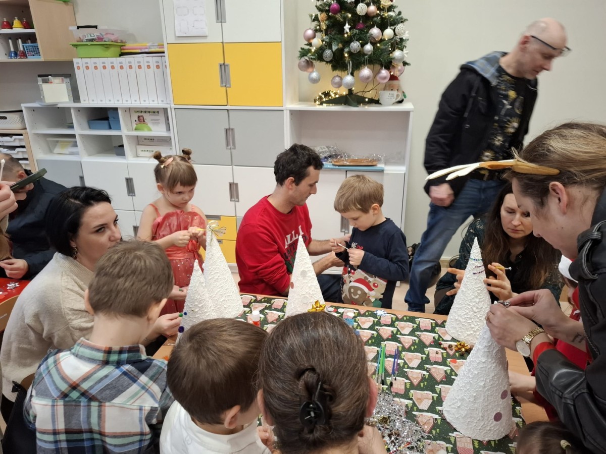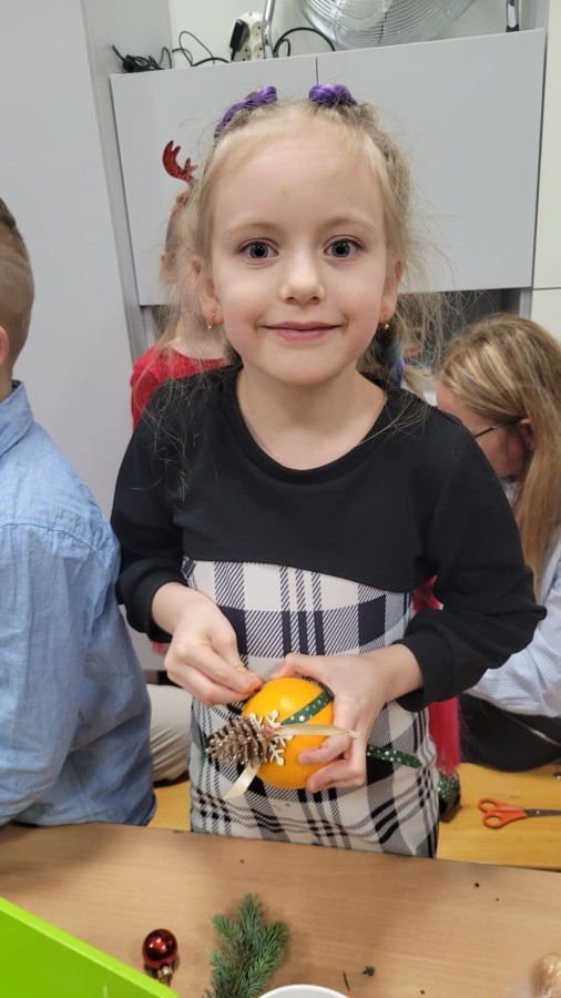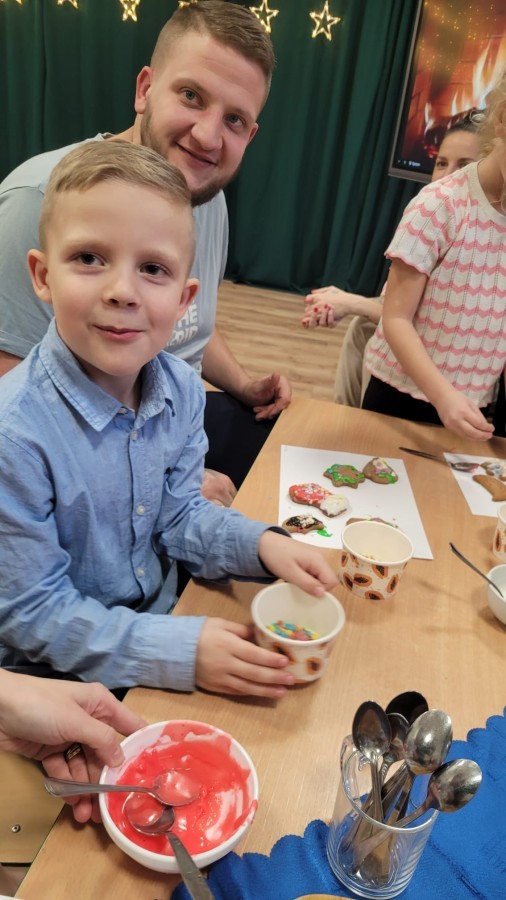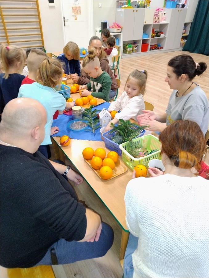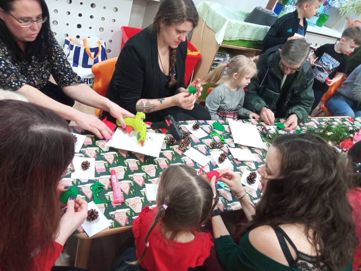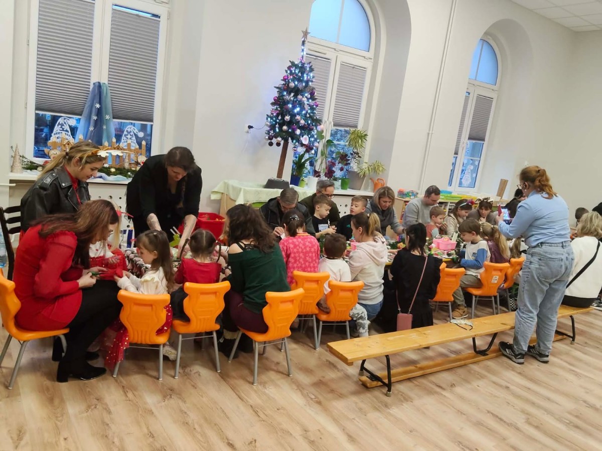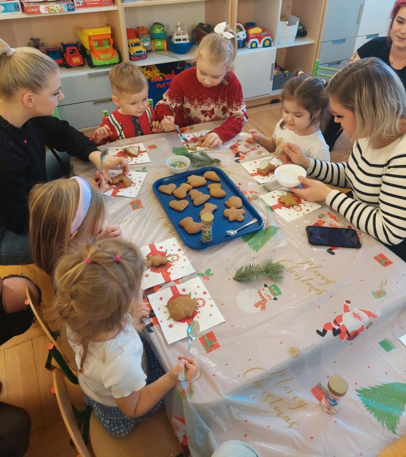 W naszej placówce odbyły się świąteczne warsztaty, które na długo pozostaną w pamięci dzieci i rodziców. Spotkanie rozpoczęło się wspólnym śpiewaniem piosenek i kolęd, tworząc ciepłą, świąteczną atmosferę. Następnie uczestnicy wzięli udział w twórczych aktywnościach – ozdabiali pomarańcze goździkami, dekorowali pierniczki, malowali gipsowe choinki oraz wykonywali papierowe łańcuchy i ludziki z szyszek. Był to czas radości, rozmów i wspólnego tworzenia, który sprzyjał integracji i pozwolił poczuć prawdziwego ducha nadchodzących świąt.