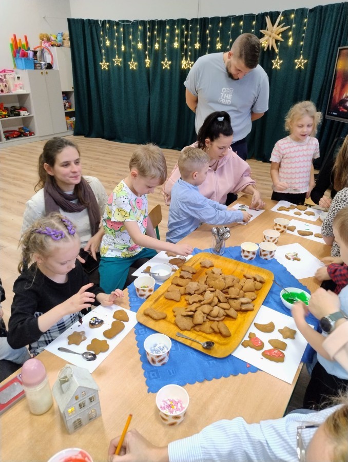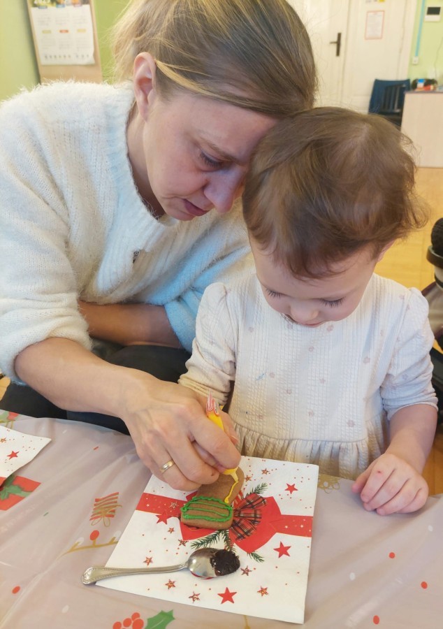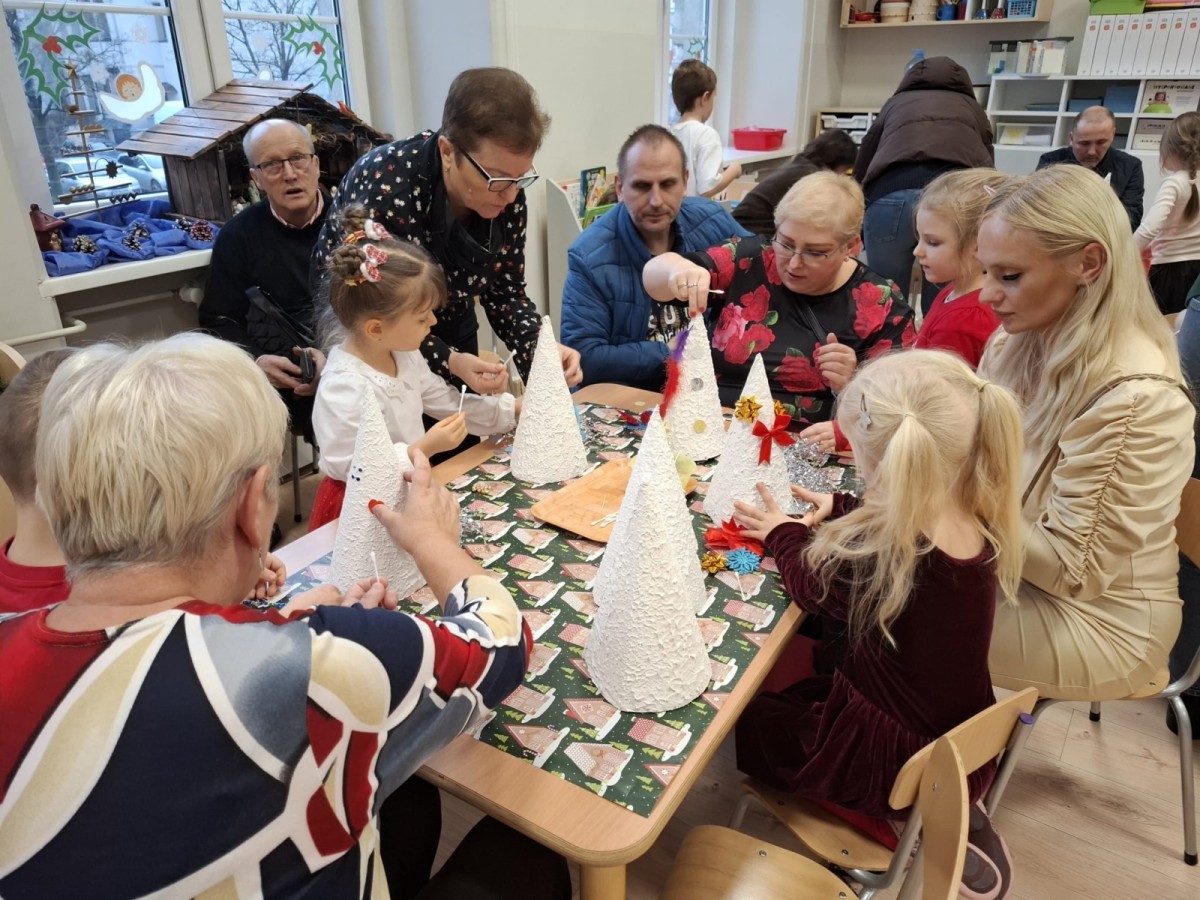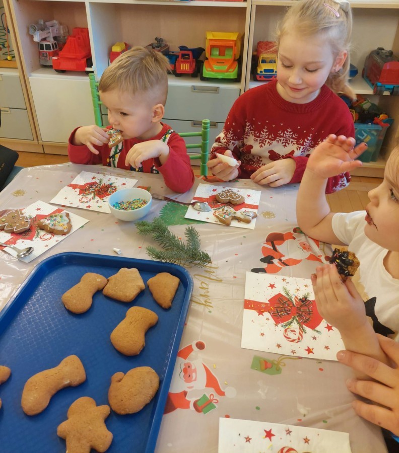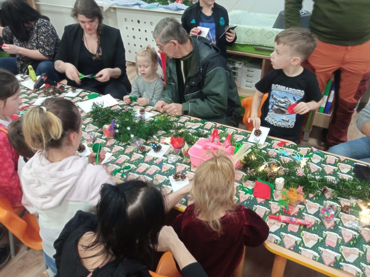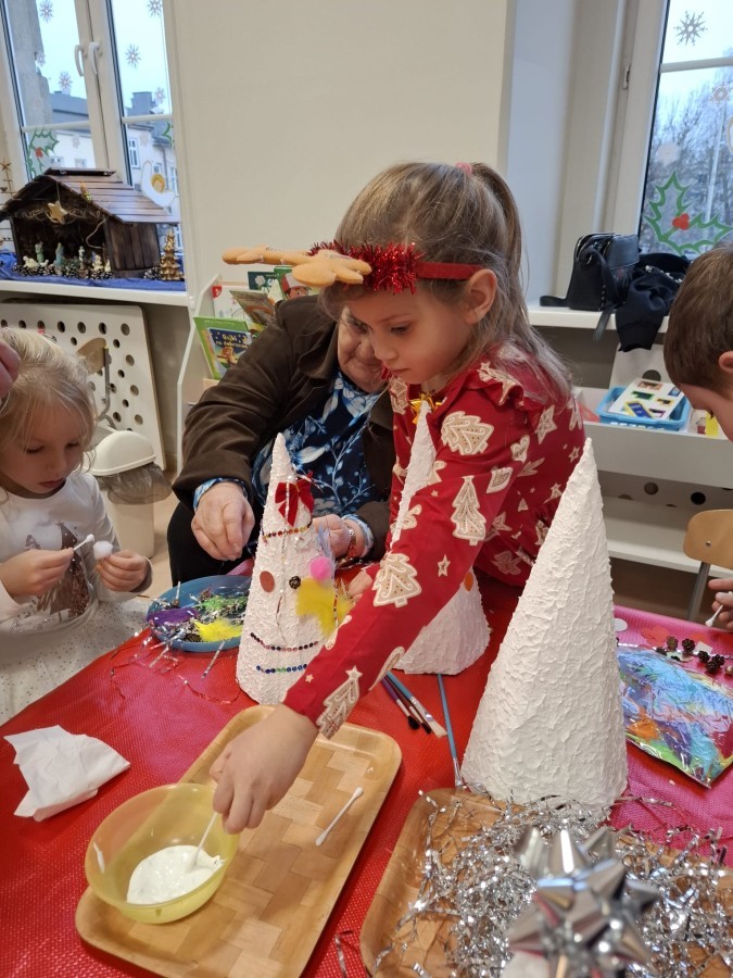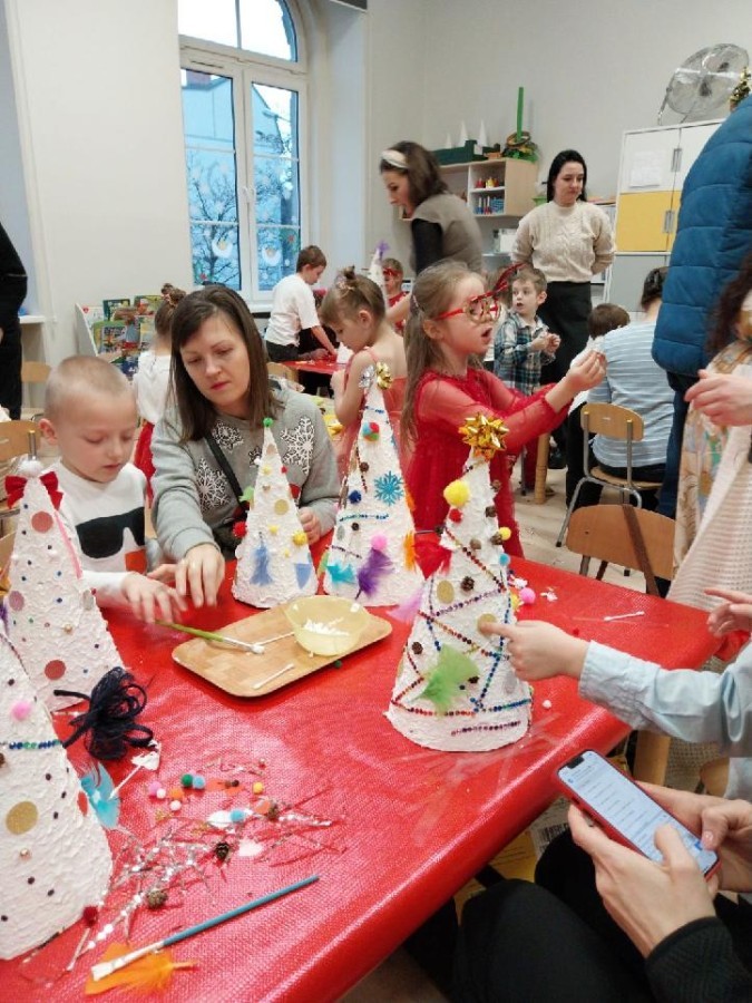 W naszej placówce odbyły się świąteczne warsztaty, które na długo pozostaną w pamięci dzieci i rodziców. Spotkanie rozpoczęło się wspólnym śpiewaniem piosenek i kolęd, tworząc ciepłą, świąteczną atmosferę. Następnie uczestnicy wzięli udział w twórczych aktywnościach – ozdabiali pomarańcze goździkami, dekorowali pierniczki, malowali gipsowe choinki oraz wykonywali papierowe łańcuchy i ludziki z szyszek. Był to czas radości, rozmów i wspólnego tworzenia, który sprzyjał integracji i pozwolił poczuć prawdziwego ducha nadchodzących świąt.