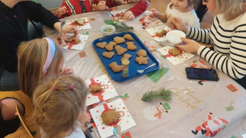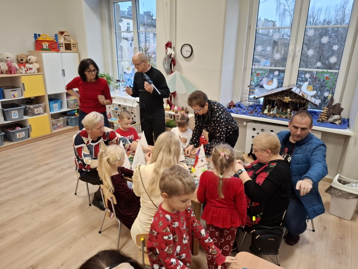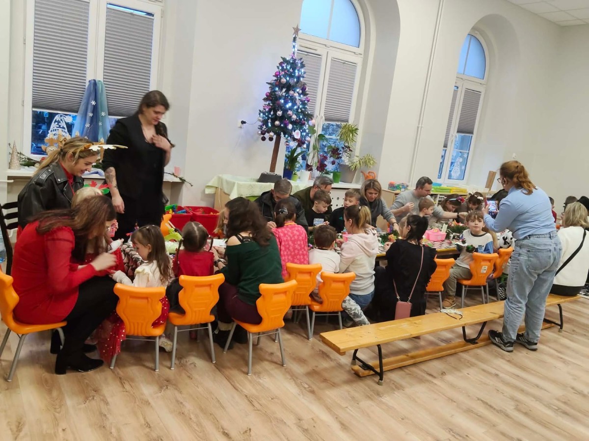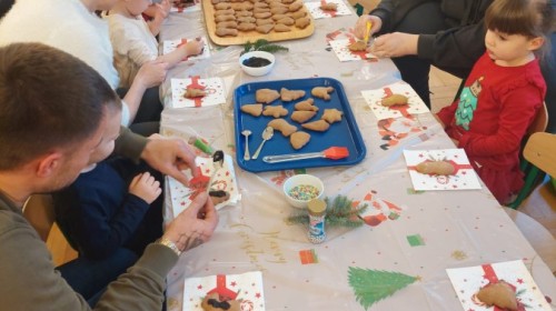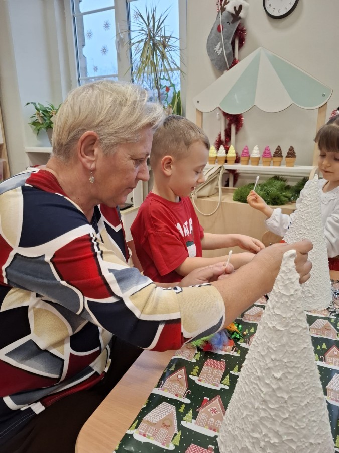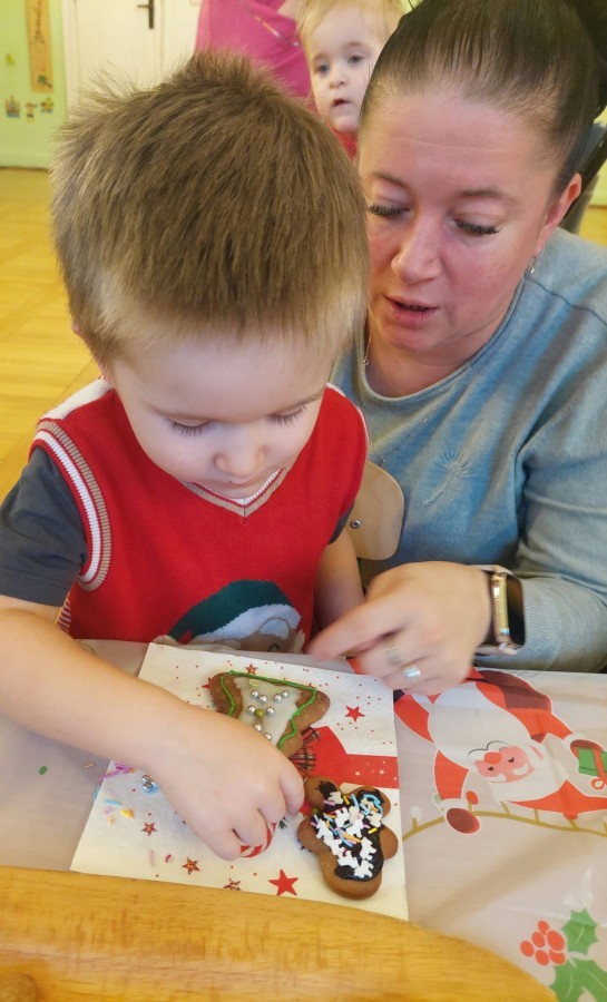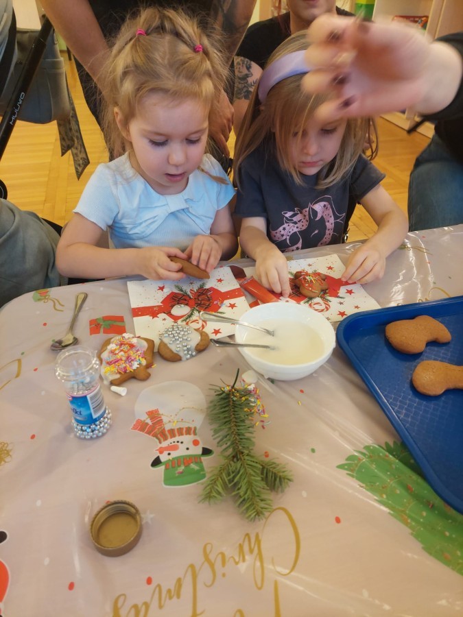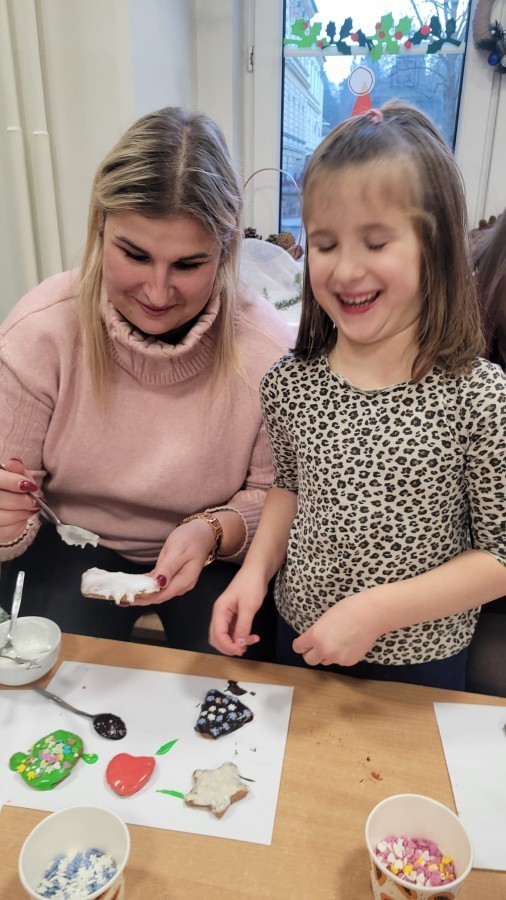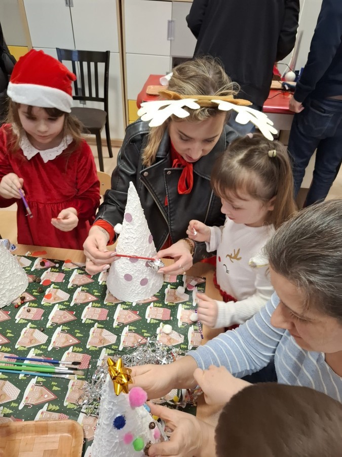 W naszej placówce odbyły się świąteczne warsztaty, które na długo pozostaną w pamięci dzieci i rodziców. Spotkanie rozpoczęło się wspólnym śpiewaniem piosenek i kolęd, tworząc ciepłą, świąteczną atmosferę. Następnie uczestnicy wzięli udział w twórczych aktywnościach – ozdabiali pomarańcze goździkami, dekorowali pierniczki, malowali gipsowe choinki oraz wykonywali papierowe łańcuchy i ludziki z szyszek. Był to czas radości, rozmów i wspólnego tworzenia, który sprzyjał integracji i pozwolił poczuć prawdziwego ducha nadchodzących świąt.