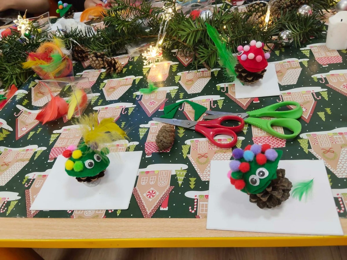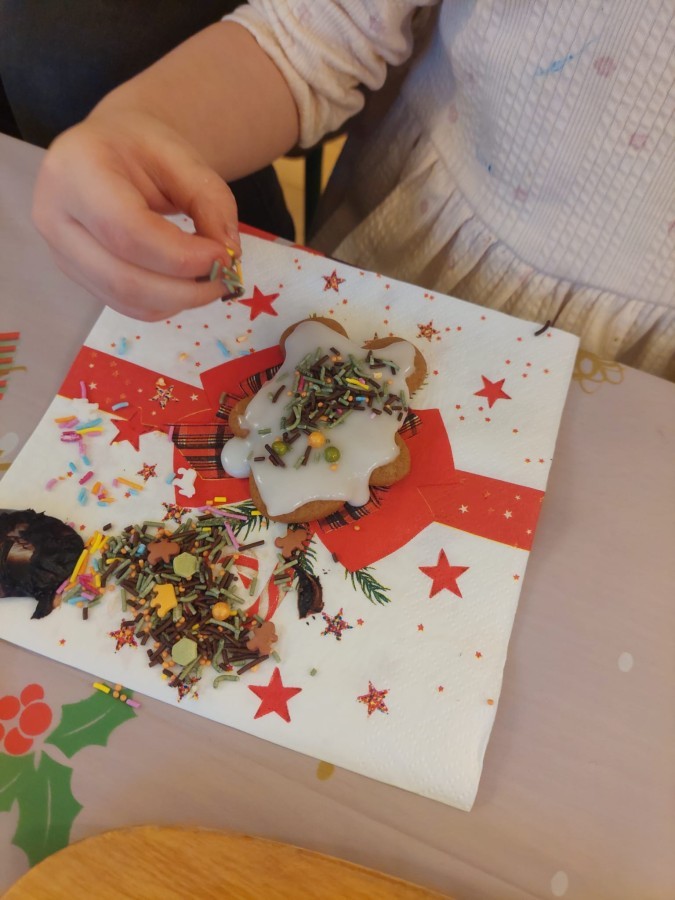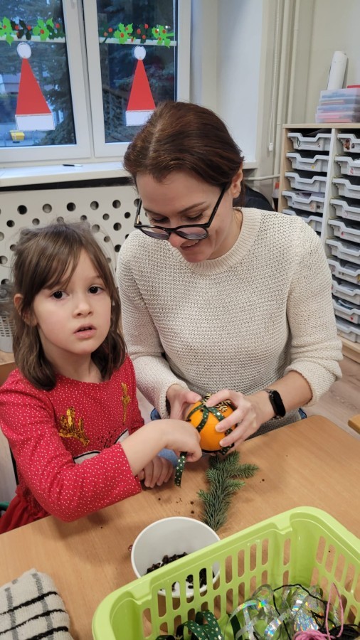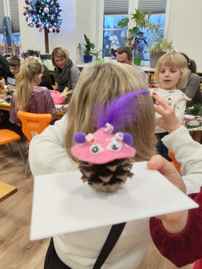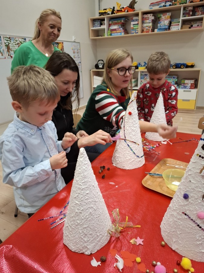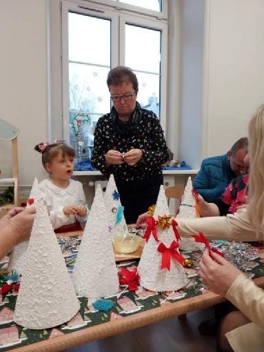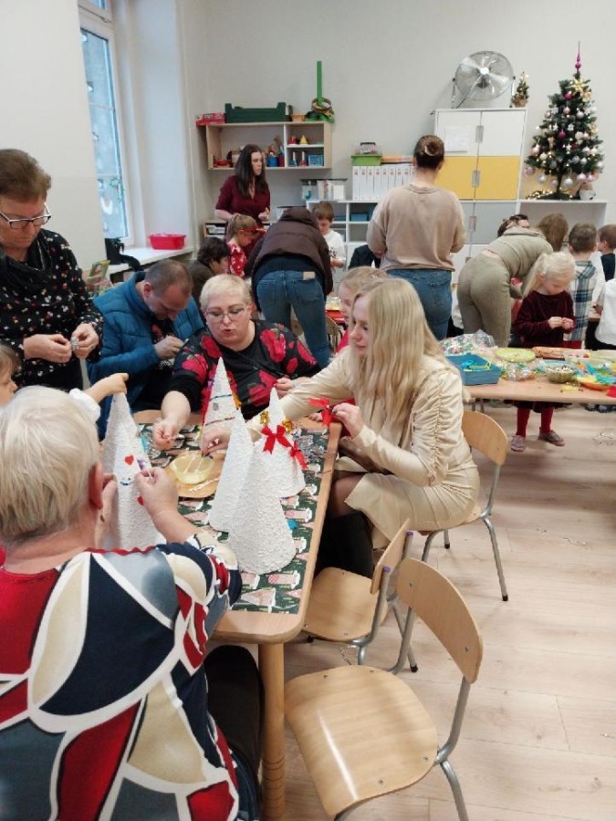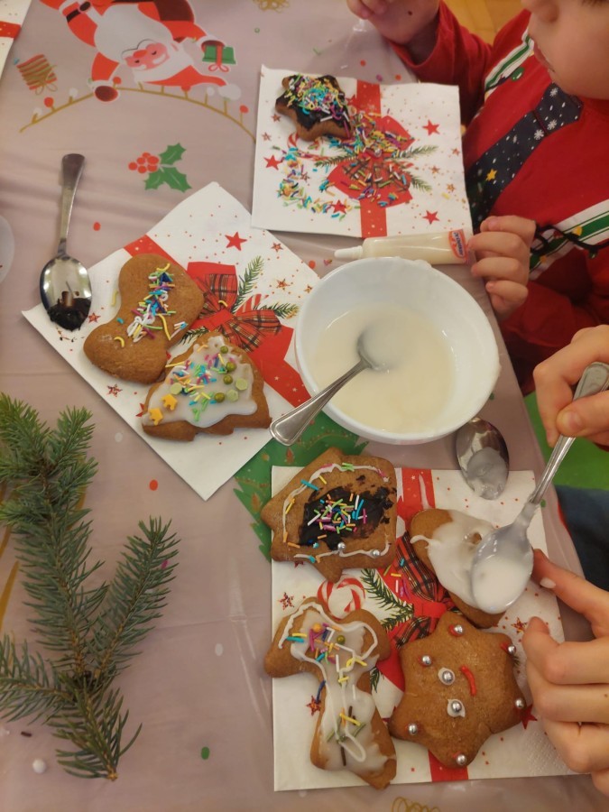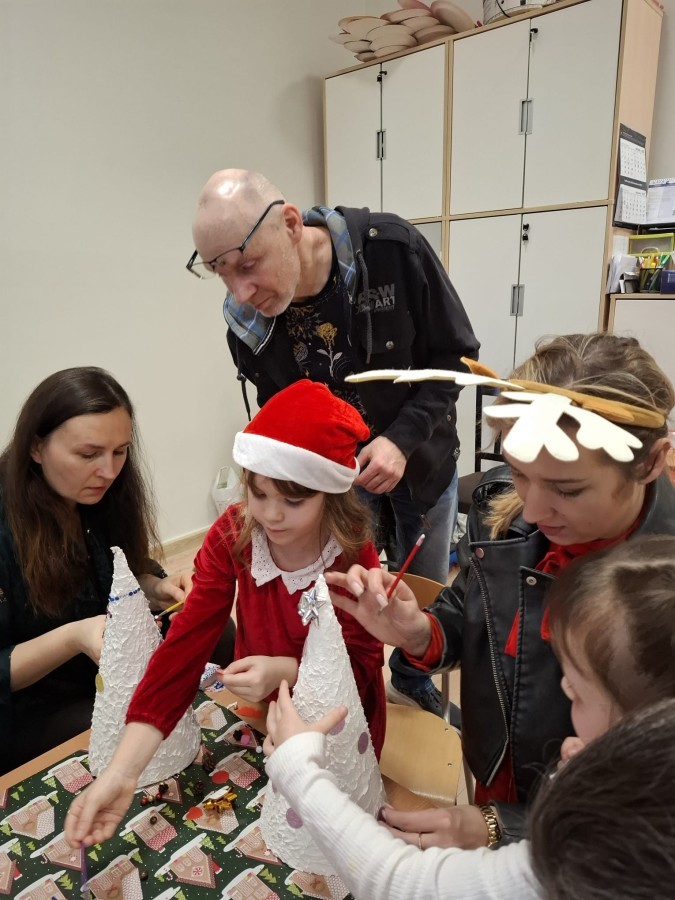 W naszej placówce odbyły się świąteczne warsztaty, które na długo pozostaną w pamięci dzieci i rodziców. Spotkanie rozpoczęło się wspólnym śpiewaniem piosenek i kolęd, tworząc ciepłą, świąteczną atmosferę. Następnie uczestnicy wzięli udział w twórczych aktywnościach – ozdabiali pomarańcze goździkami, dekorowali pierniczki, malowali gipsowe choinki oraz wykonywali papierowe łańcuchy i ludziki z szyszek. Był to czas radości, rozmów i wspólnego tworzenia, który sprzyjał integracji i pozwolił poczuć prawdziwego ducha nadchodzących świąt.