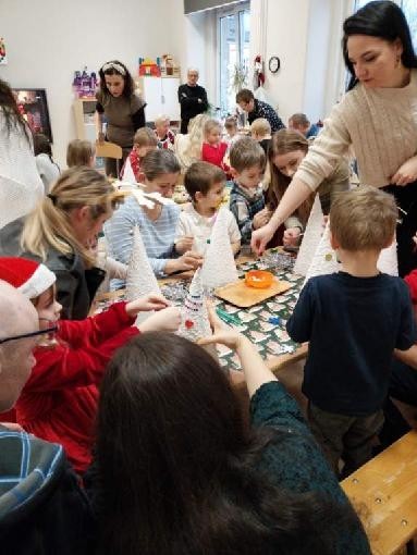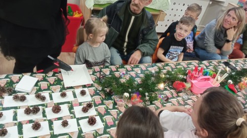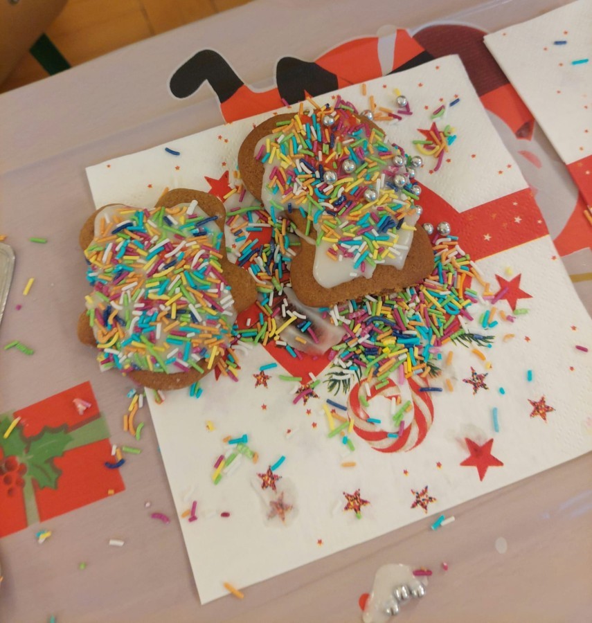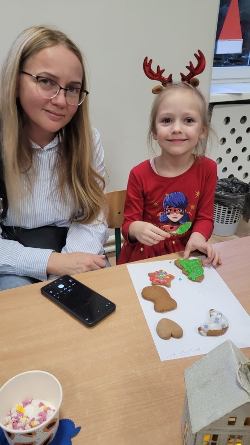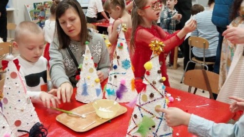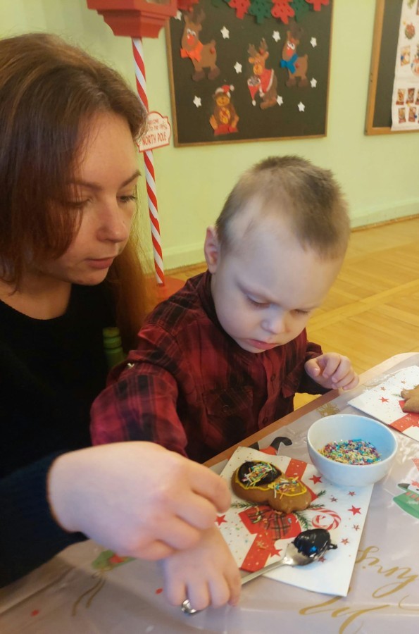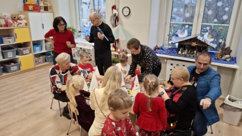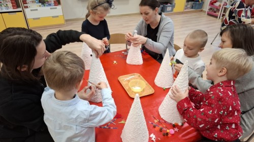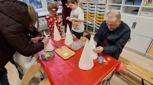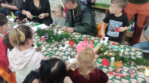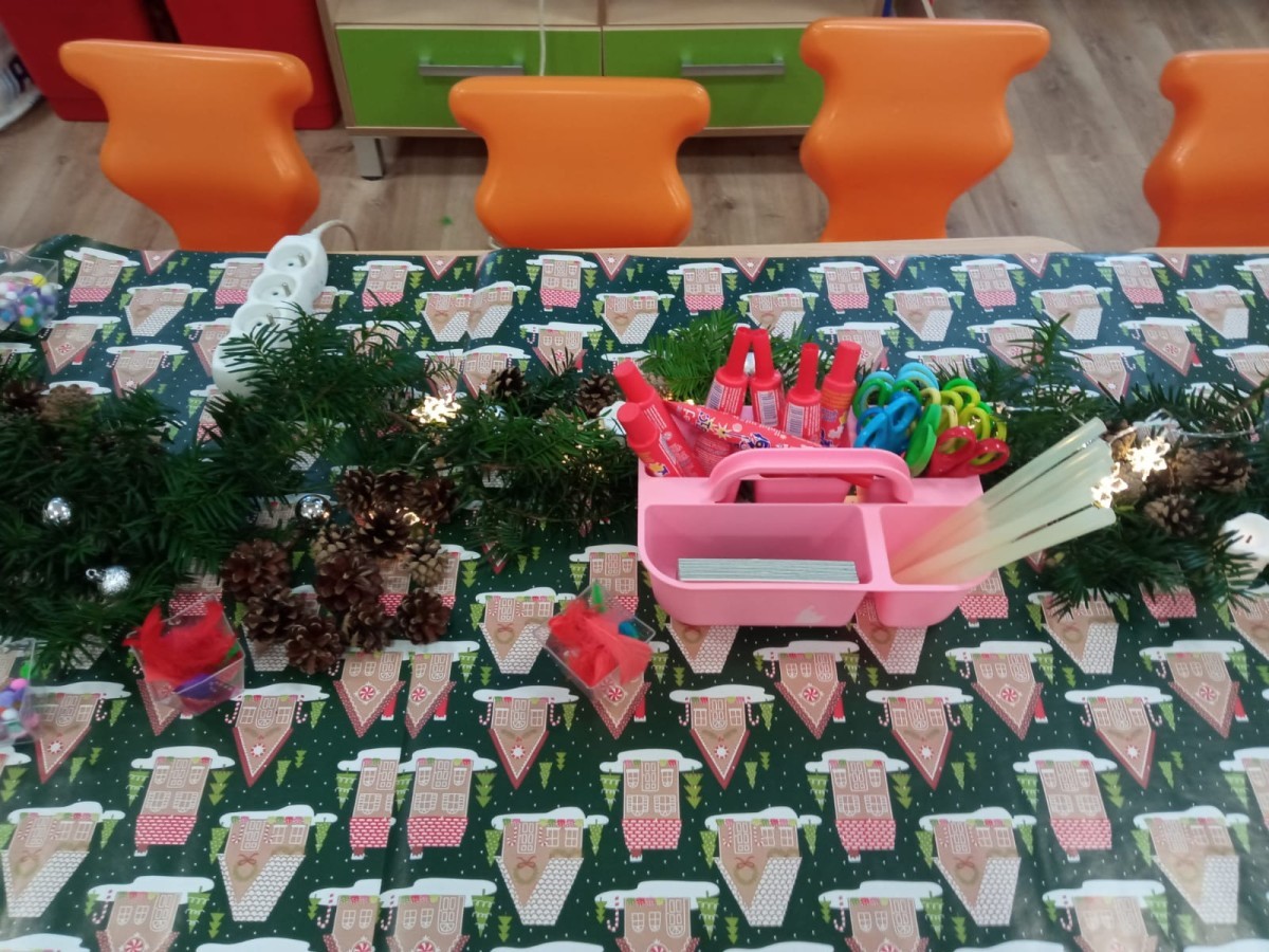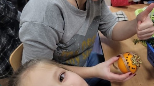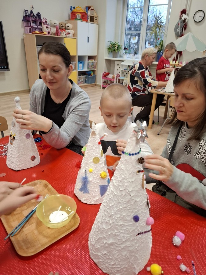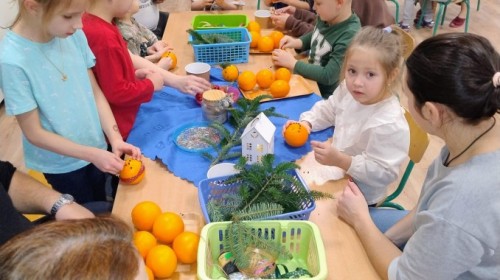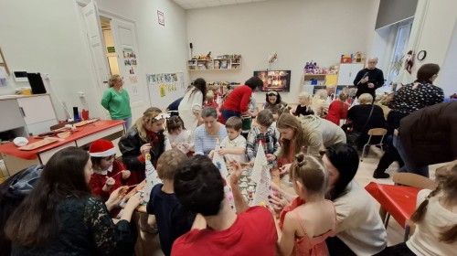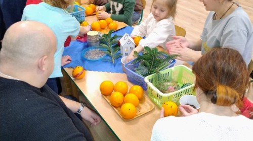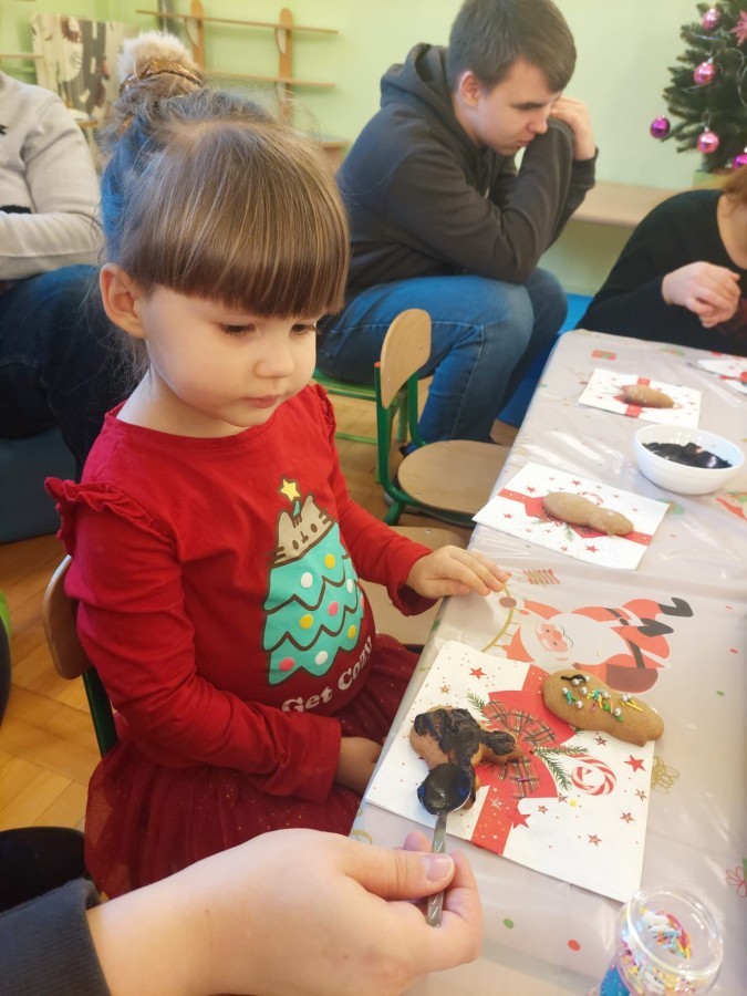 W naszej placówce odbyły się świąteczne warsztaty, które na długo pozostaną w pamięci dzieci i rodziców. Spotkanie rozpoczęło się wspólnym śpiewaniem piosenek i kolęd, tworząc ciepłą, świąteczną atmosferę. Następnie uczestnicy wzięli udział w twórczych aktywnościach – ozdabiali pomarańcze goździkami, dekorowali pierniczki, malowali gipsowe choinki oraz wykonywali papierowe łańcuchy i ludziki z szyszek. Był to czas radości, rozmów i wspólnego tworzenia, który sprzyjał integracji i pozwolił poczuć prawdziwego ducha nadchodzących świąt.