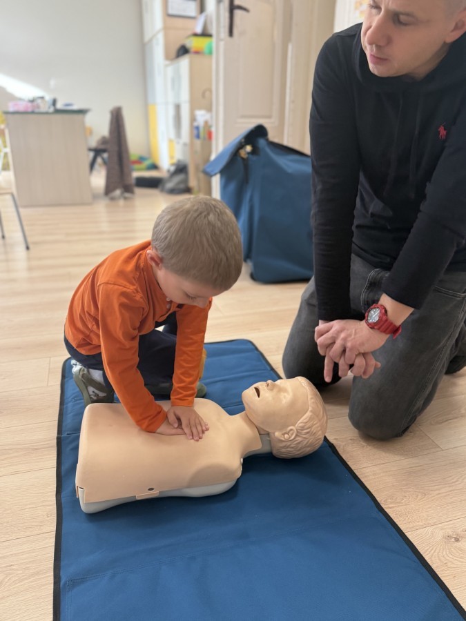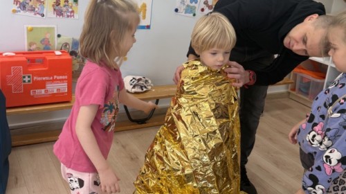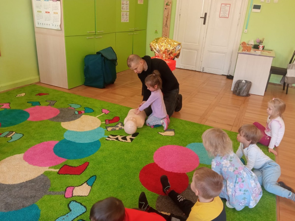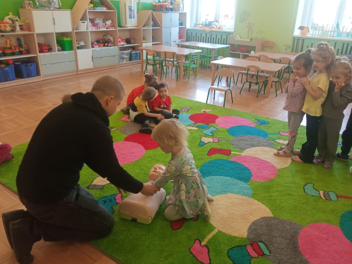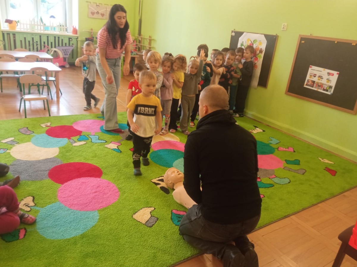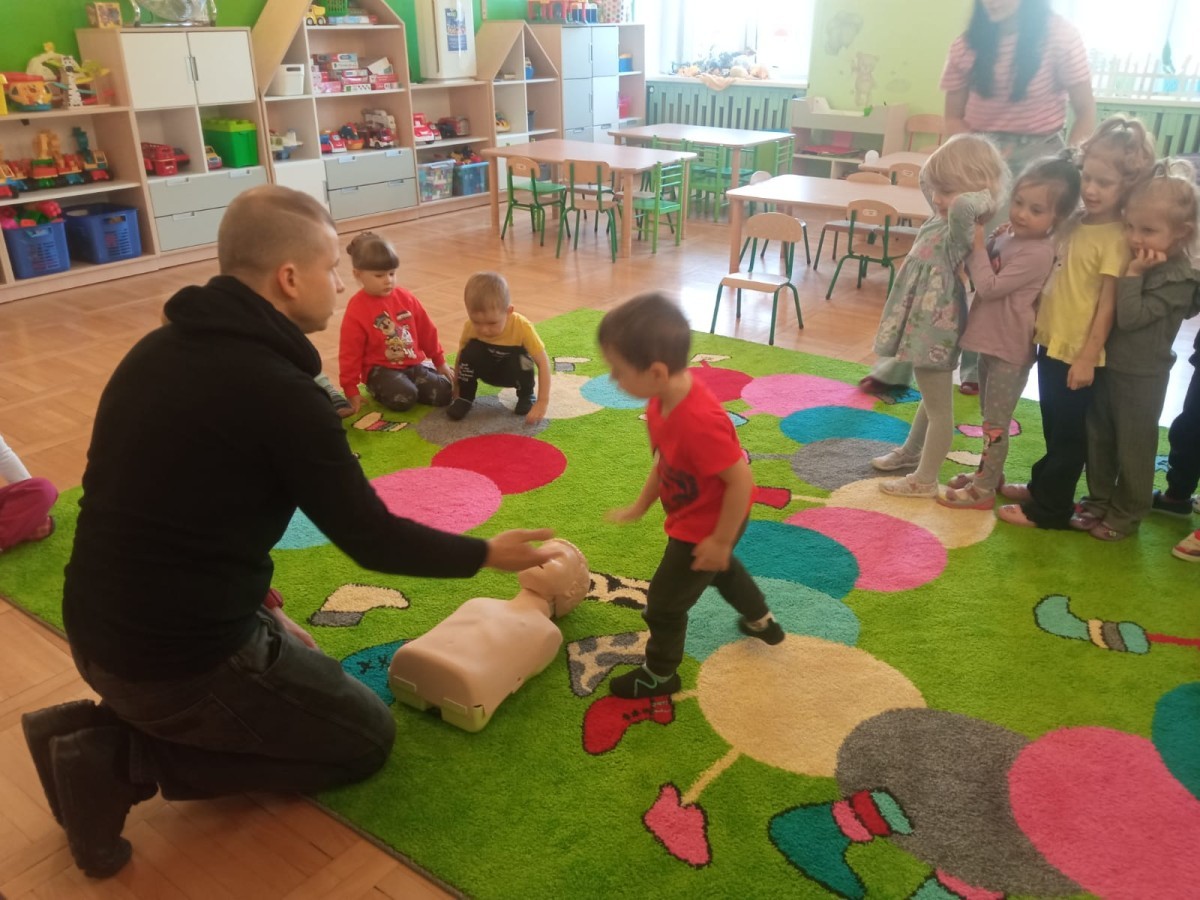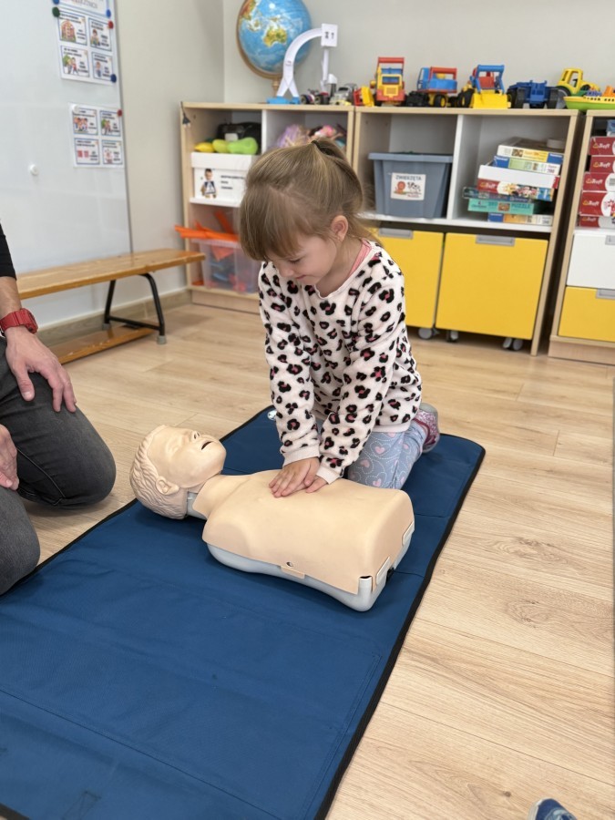Podczas warsztatów przedszkolaki dowiedziały się, jak wezwać pomoc, co powiedzieć, dzwoniąc pod numer alarmowy 112, oraz jak zachować się, gdy ktoś potrzebuje pomocy. Dzieci z ogromnym zaangażowaniem ćwiczyły udzielanie pierwszej pomocy na fantomie, a także uczyły się, jak okryć poszkodowaną osobę kocem termicznym.