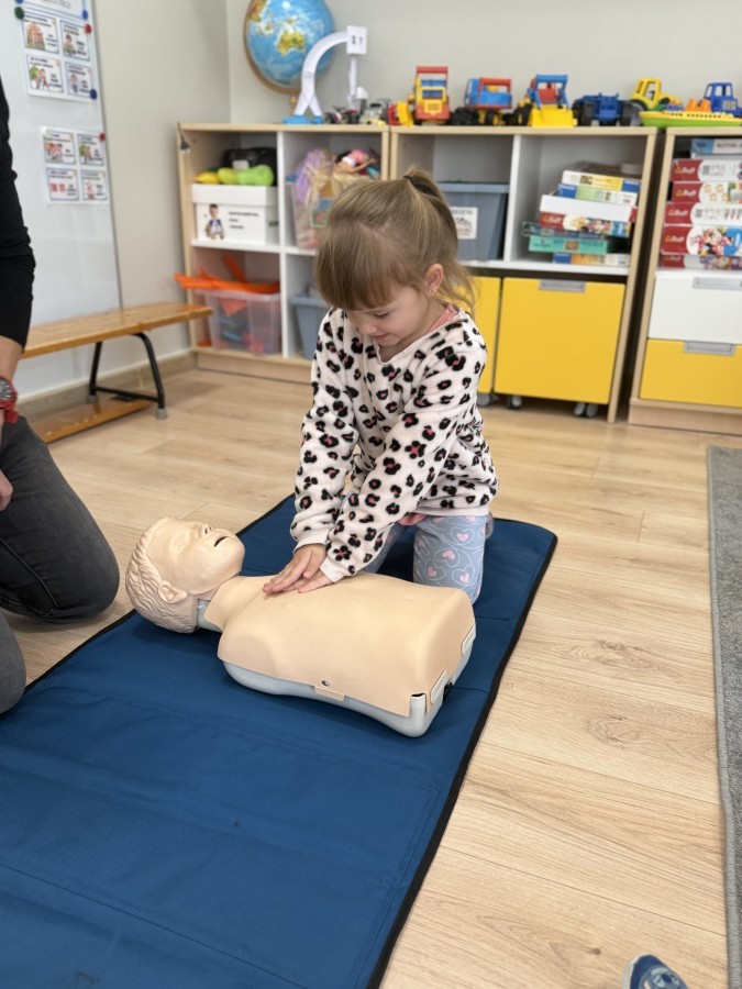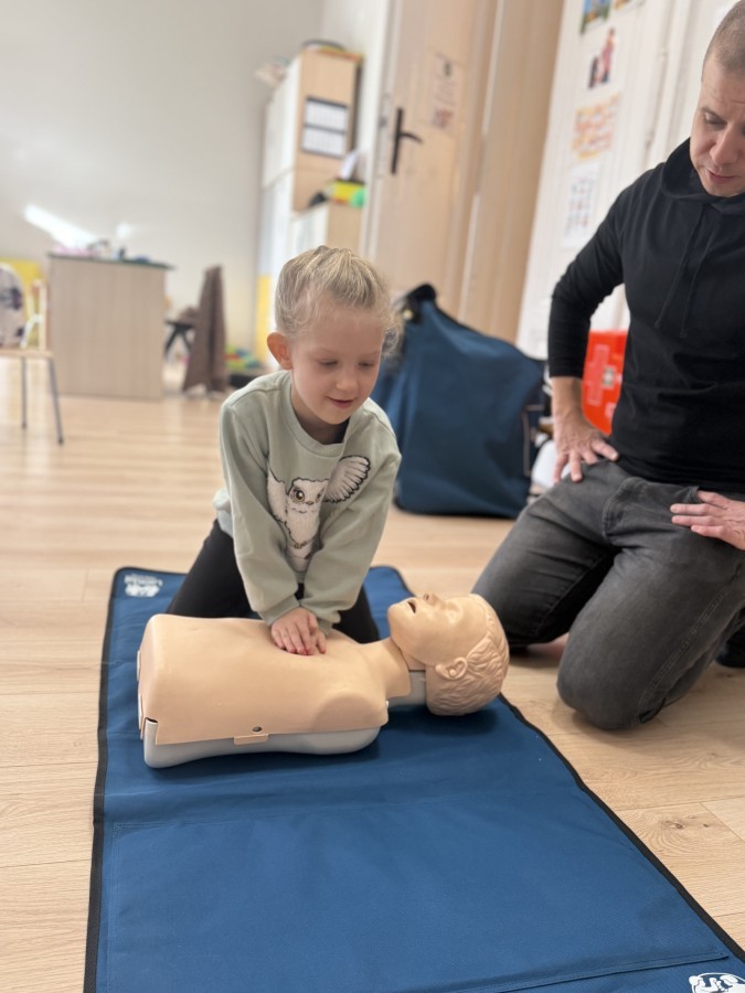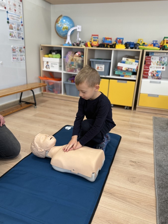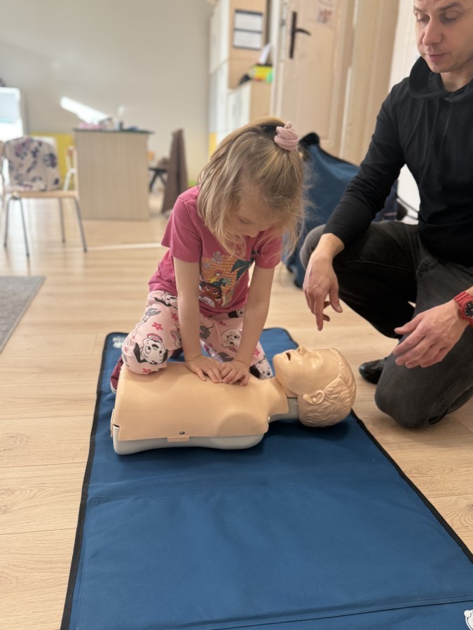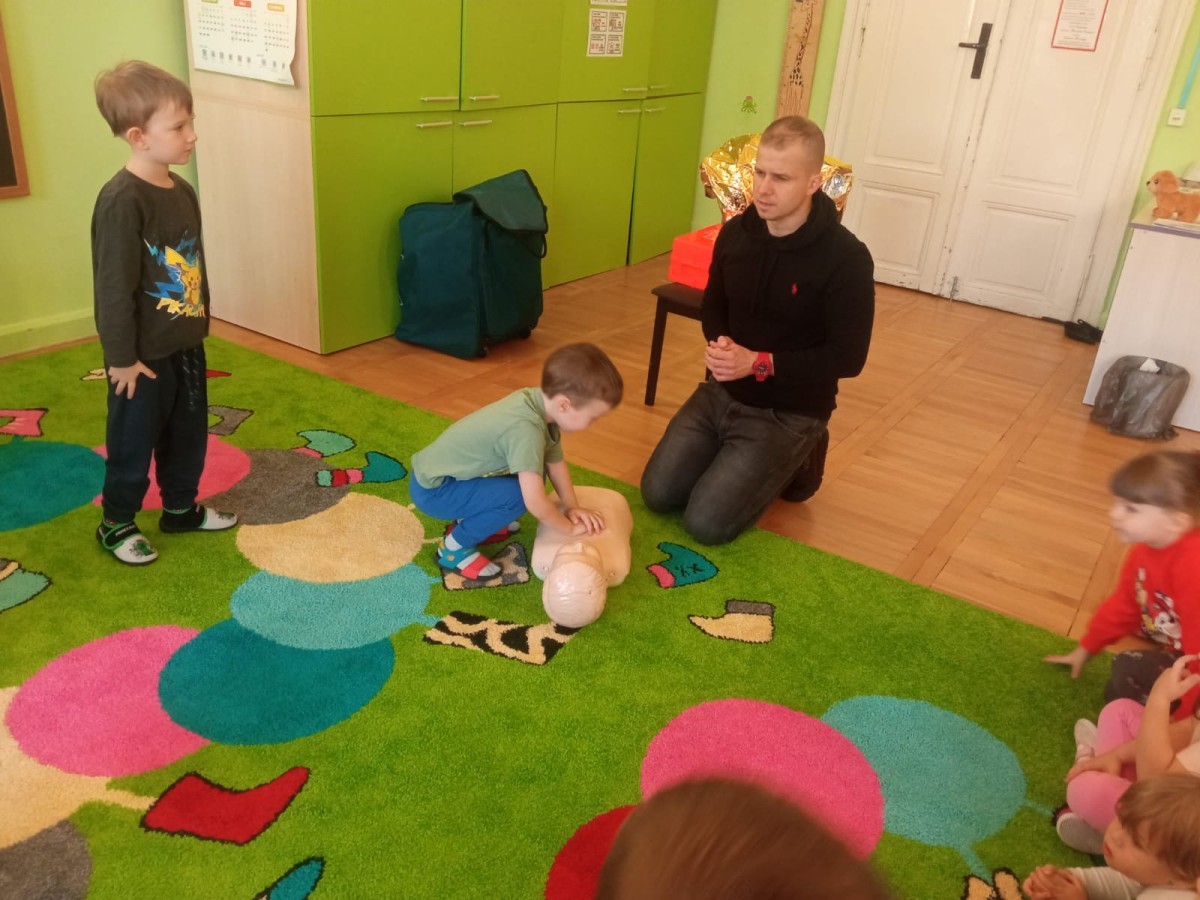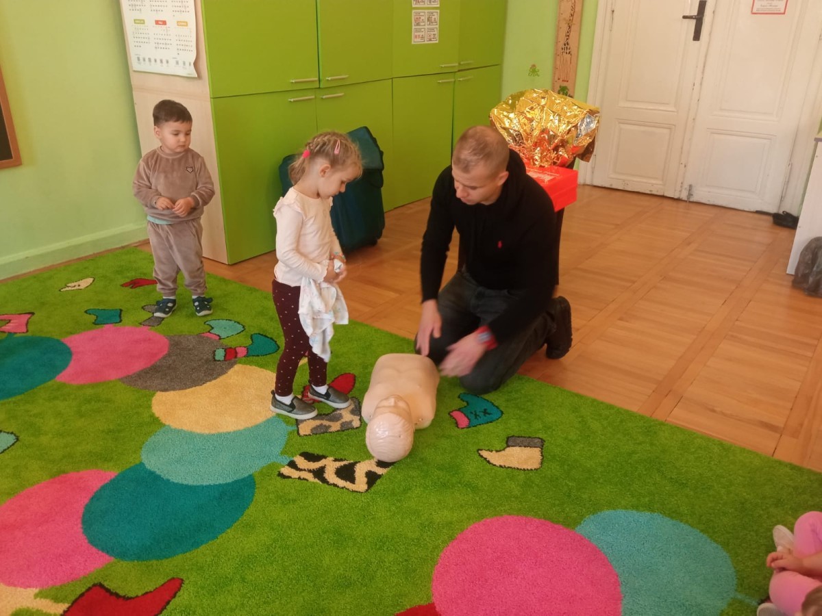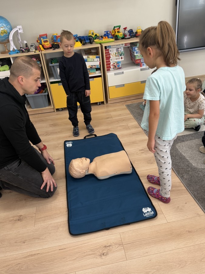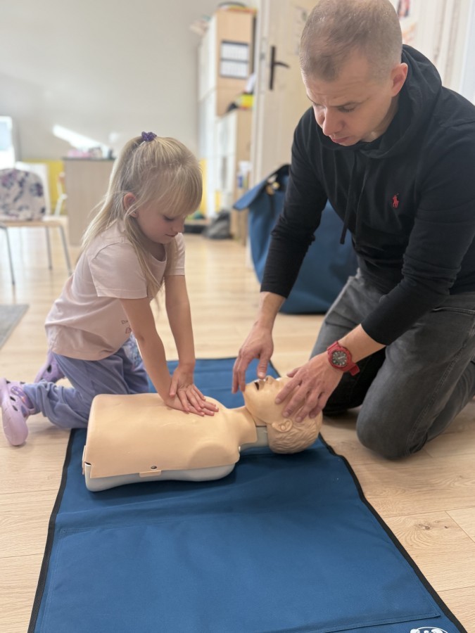 Podczas warsztatów przedszkolaki dowiedziały się, jak wezwać pomoc, co powiedzieć, dzwoniąc pod numer alarmowy 112, oraz jak zachować się, gdy ktoś potrzebuje pomocy. Dzieci z ogromnym zaangażowaniem ćwiczyły udzielanie pierwszej pomocy na fantomie, a także uczyły się, jak okryć poszkodowaną osobę kocem termicznym.