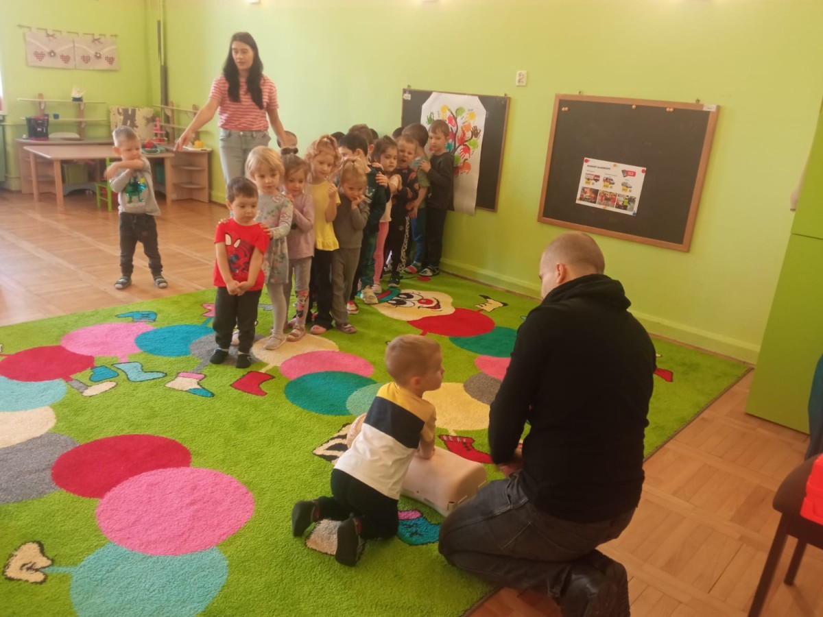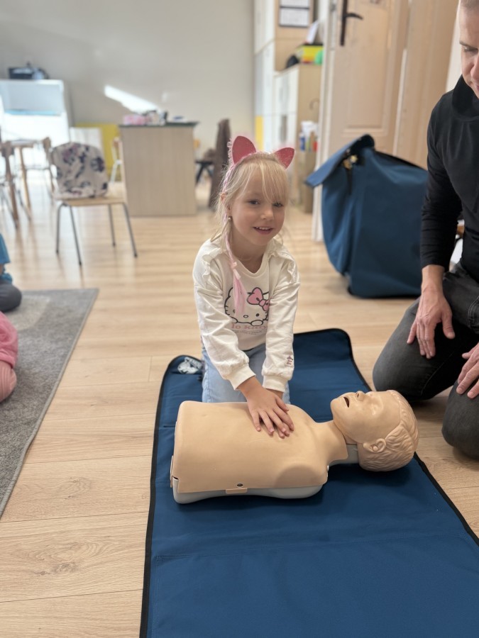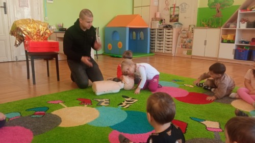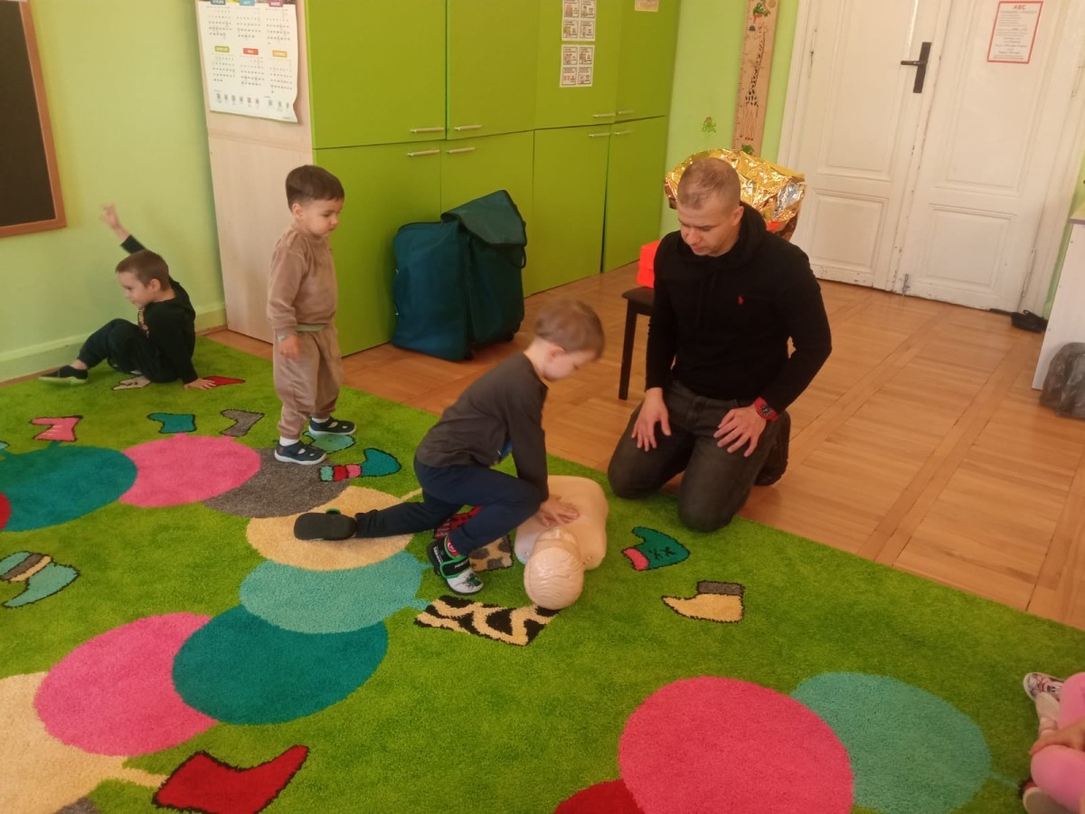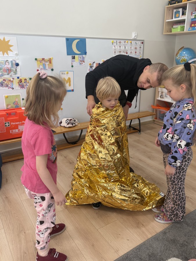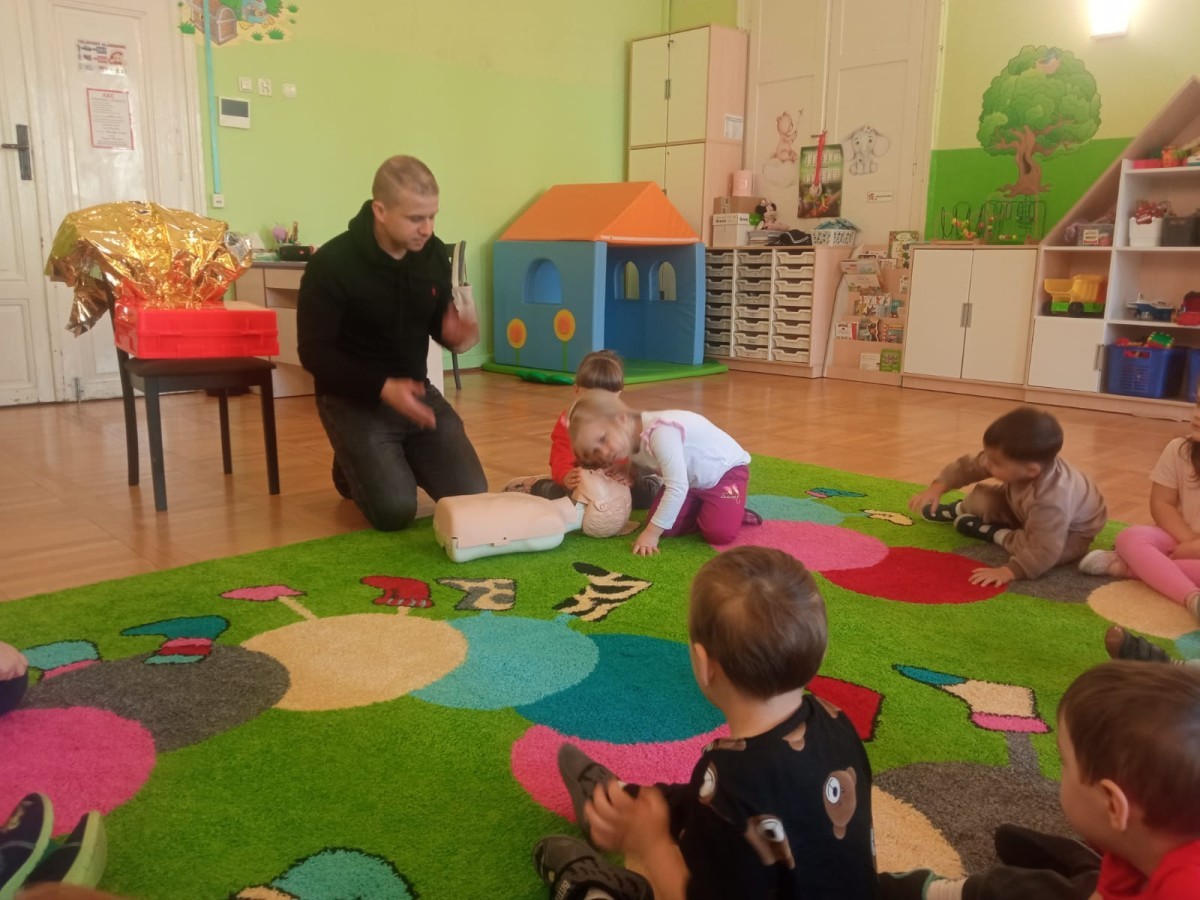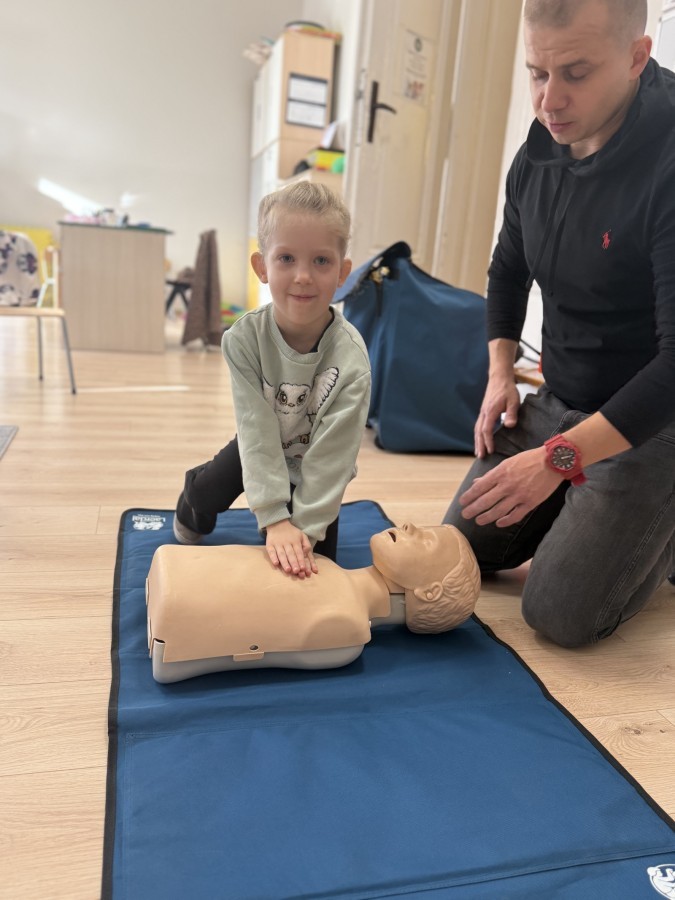 Podczas warsztatów przedszkolaki dowiedziały się, jak wezwać pomoc, co powiedzieć, dzwoniąc pod numer alarmowy 112, oraz jak zachować się, gdy ktoś potrzebuje pomocy. Dzieci z ogromnym zaangażowaniem ćwiczyły udzielanie pierwszej pomocy na fantomie, a także uczyły się, jak okryć poszkodowaną osobę kocem termicznym.