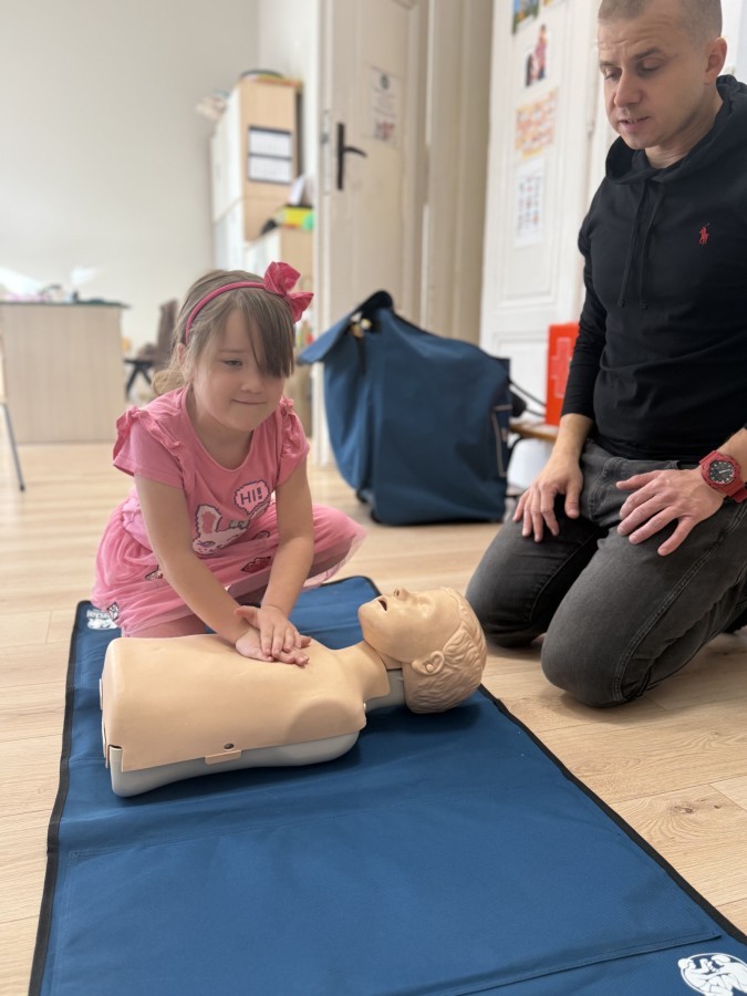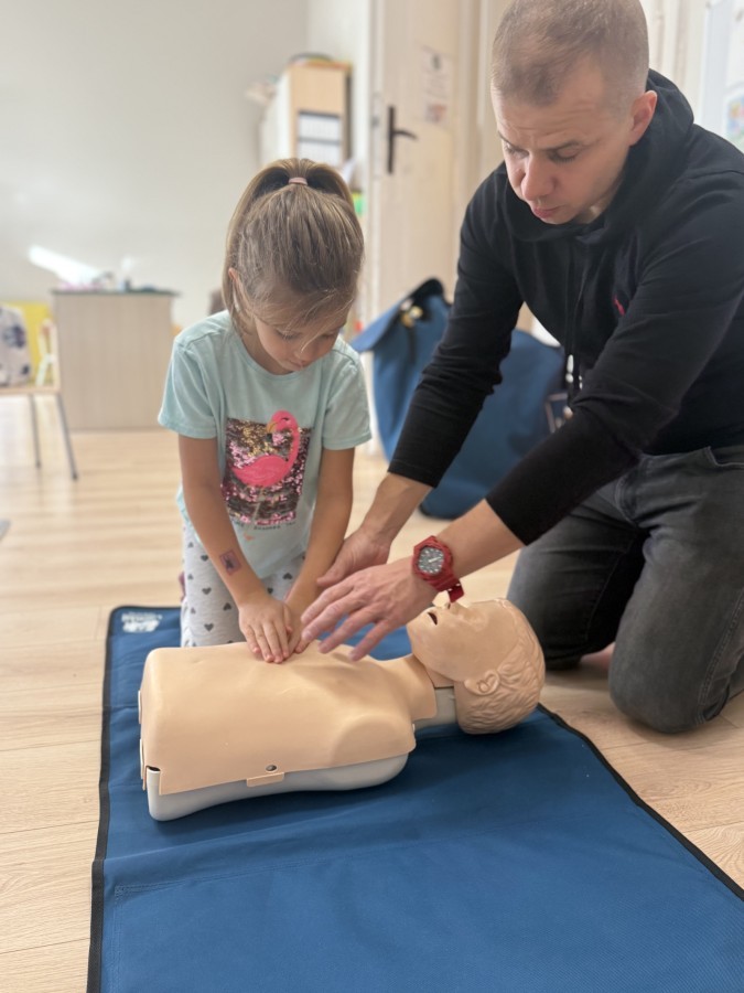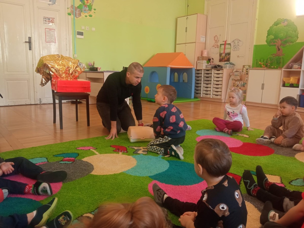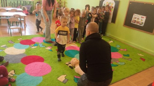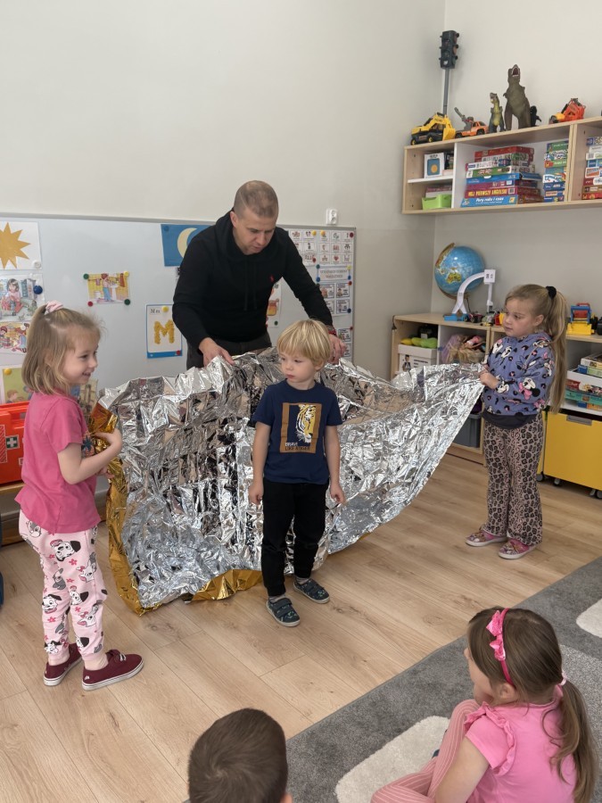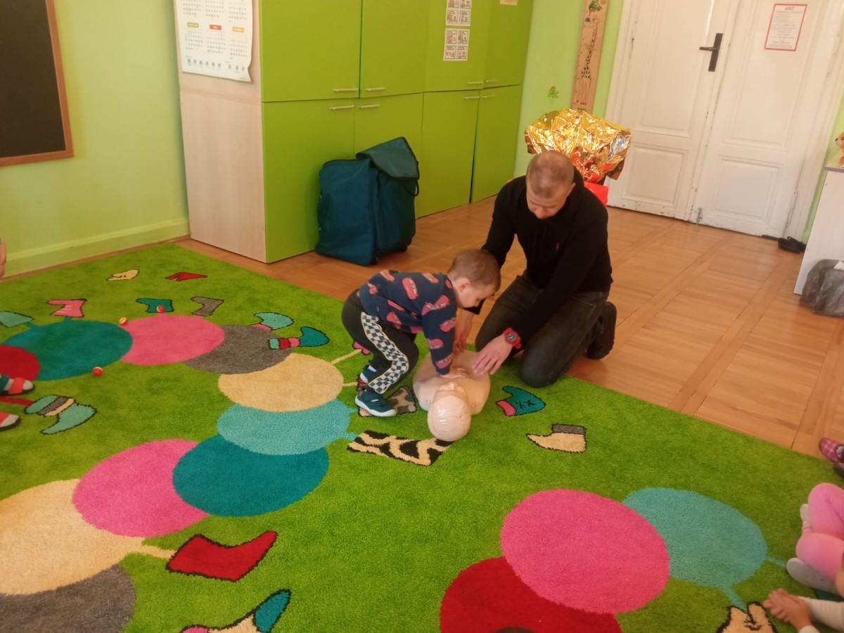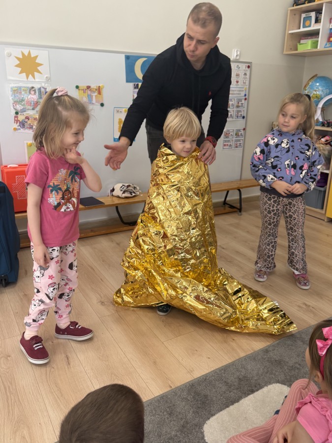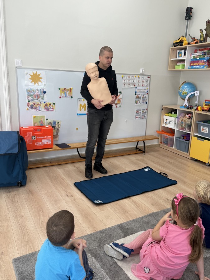 Podczas warsztatów przedszkolaki dowiedziały się, jak wezwać pomoc, co powiedzieć, dzwoniąc pod numer alarmowy 112, oraz jak zachować się, gdy ktoś potrzebuje pomocy. Dzieci z ogromnym zaangażowaniem ćwiczyły udzielanie pierwszej pomocy na fantomie, a także uczyły się, jak okryć poszkodowaną osobę kocem termicznym.