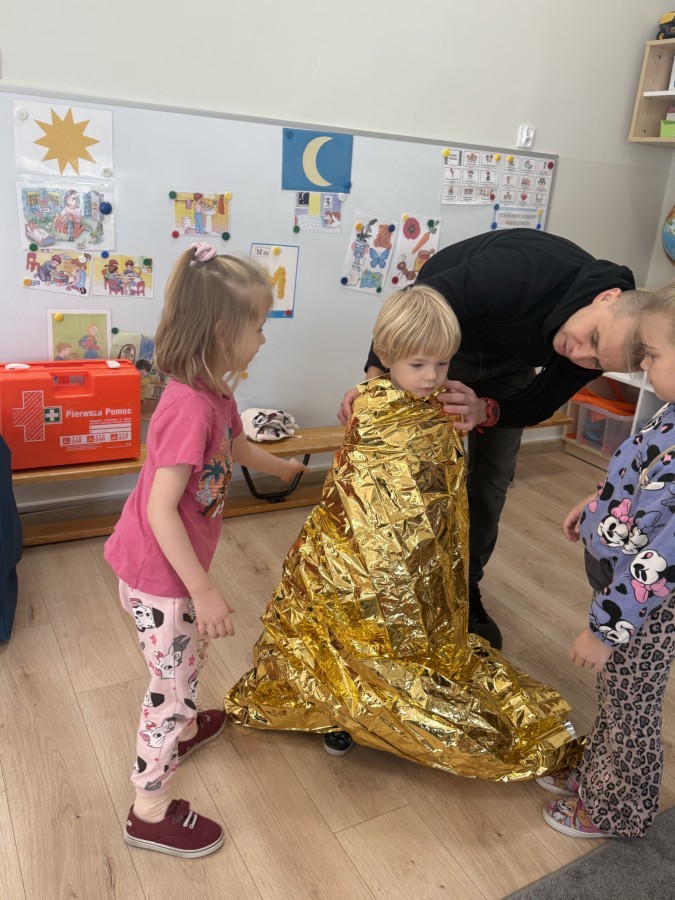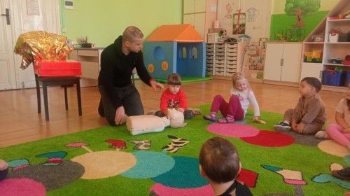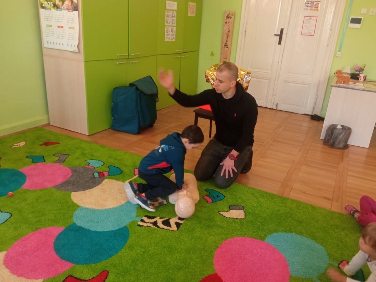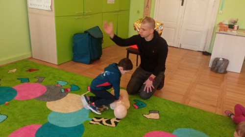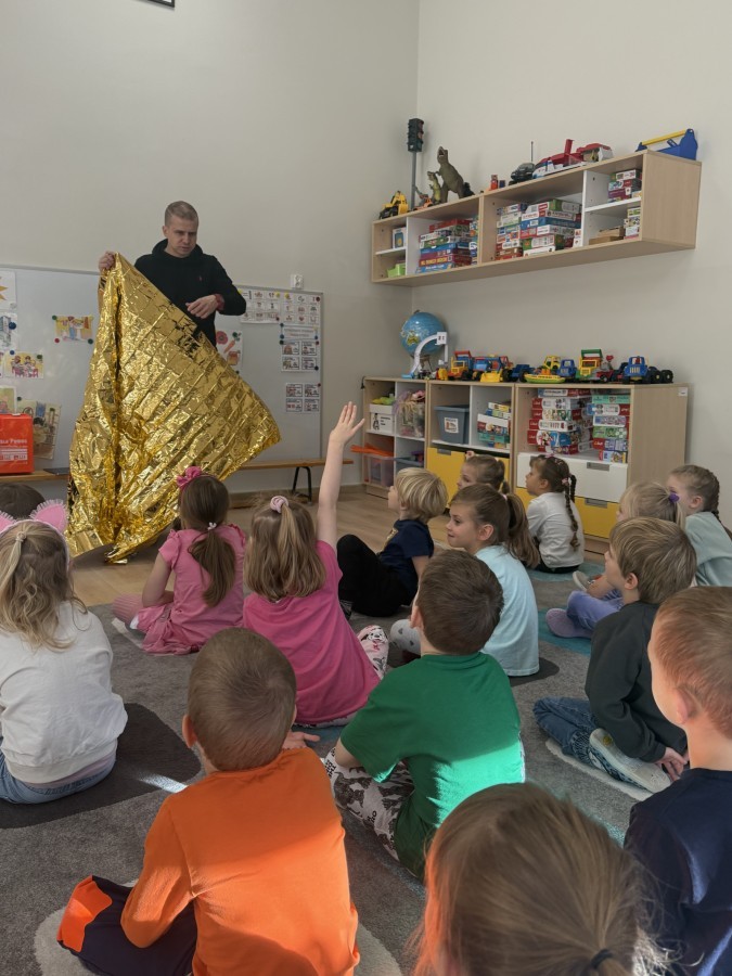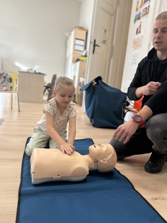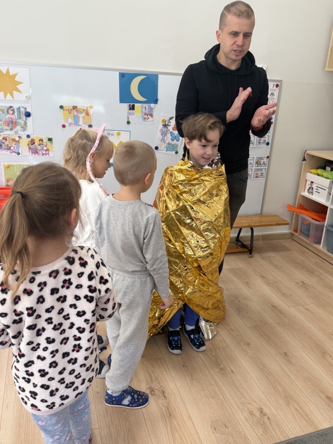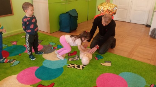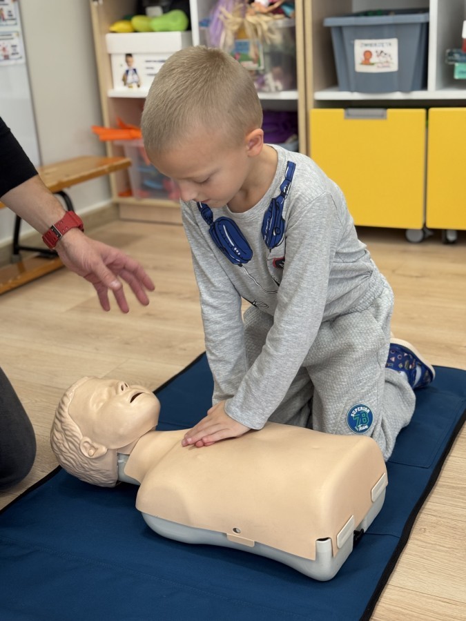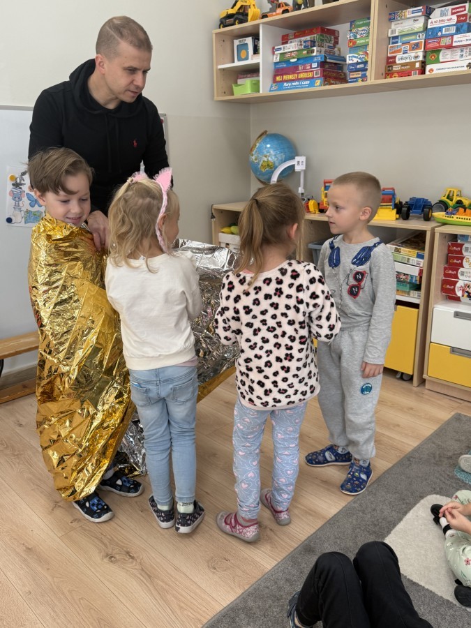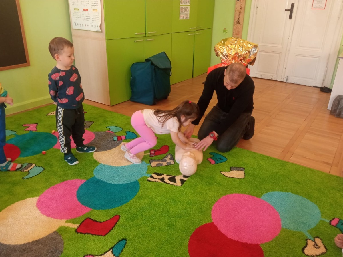 Podczas warsztatów przedszkolaki dowiedziały się, jak wezwać pomoc, co powiedzieć, dzwoniąc pod numer alarmowy 112, oraz jak zachować się, gdy ktoś potrzebuje pomocy. Dzieci z ogromnym zaangażowaniem ćwiczyły udzielanie pierwszej pomocy na fantomie, a także uczyły się, jak okryć poszkodowaną osobę kocem termicznym.