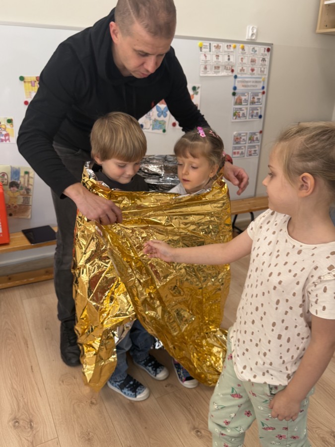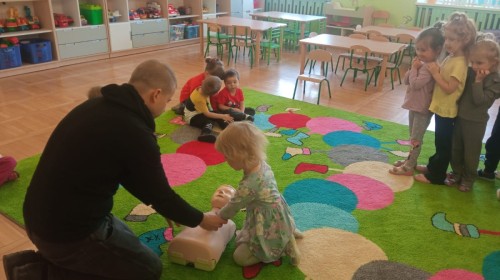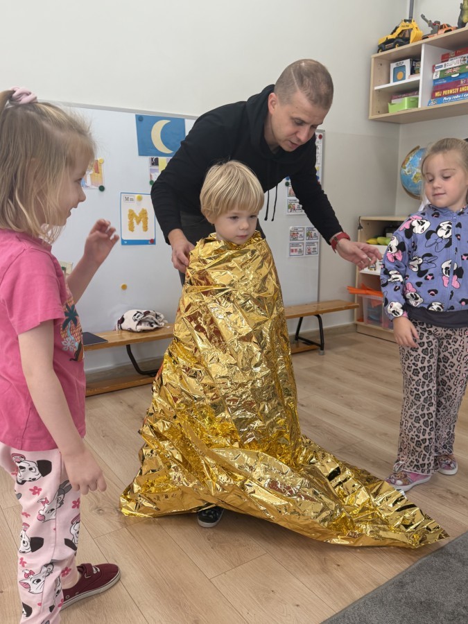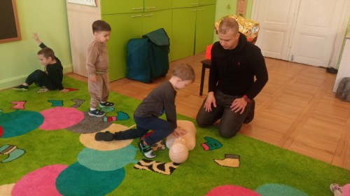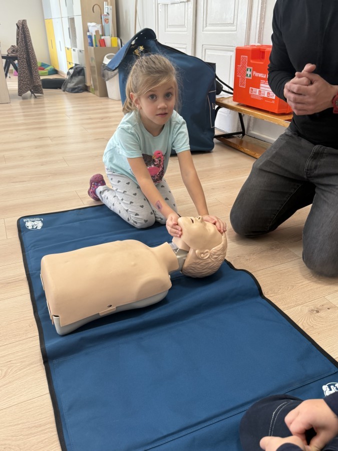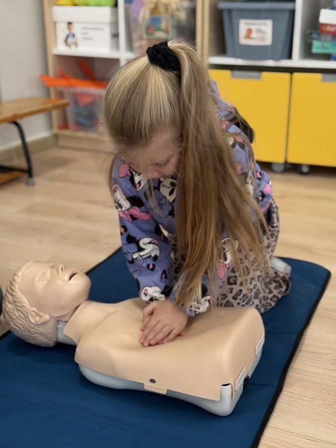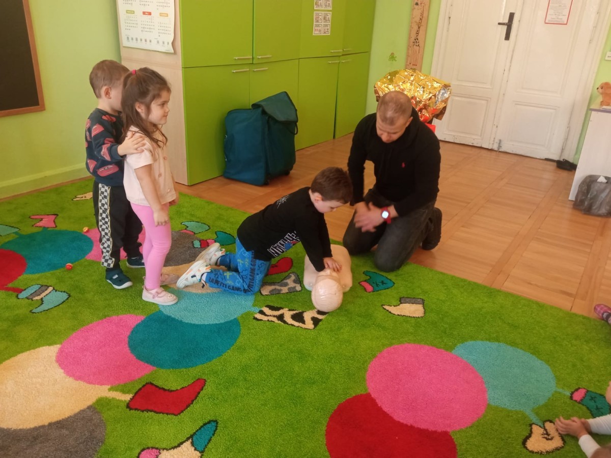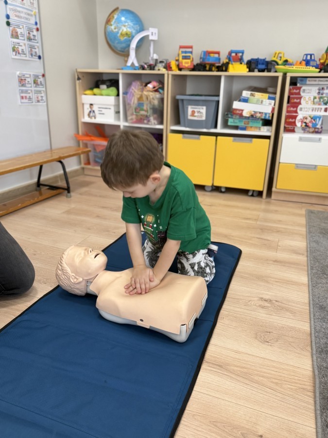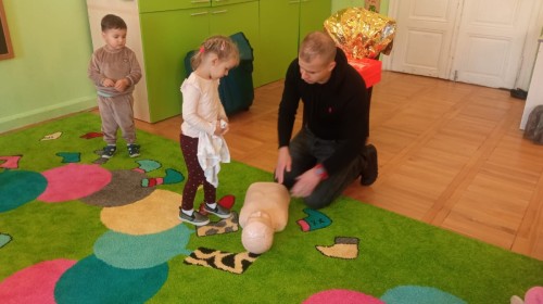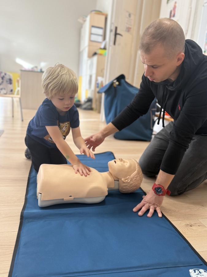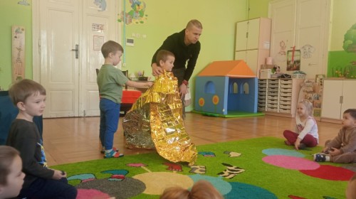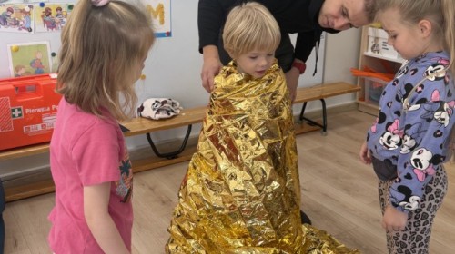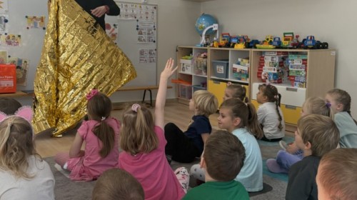 Podczas warsztatów przedszkolaki dowiedziały się, jak wezwać pomoc, co powiedzieć, dzwoniąc pod numer alarmowy 112, oraz jak zachować się, gdy ktoś potrzebuje pomocy. Dzieci z ogromnym zaangażowaniem ćwiczyły udzielanie pierwszej pomocy na fantomie, a także uczyły się, jak okryć poszkodowaną osobę kocem termicznym.