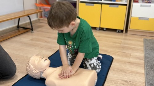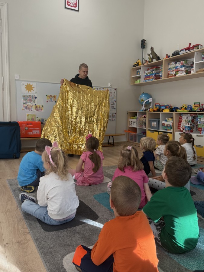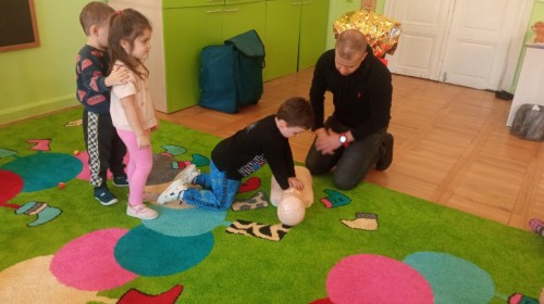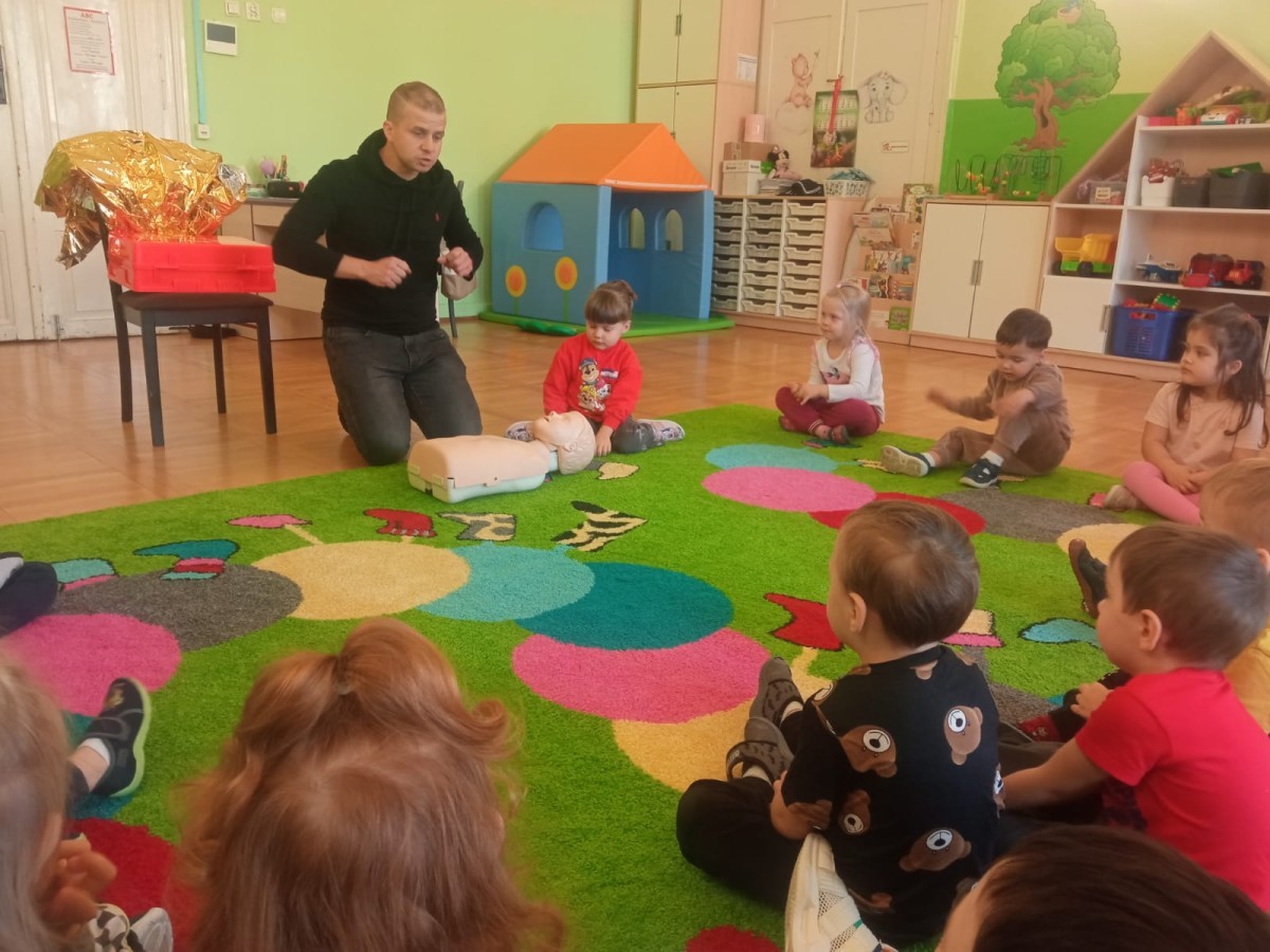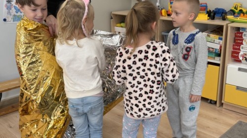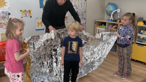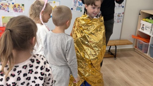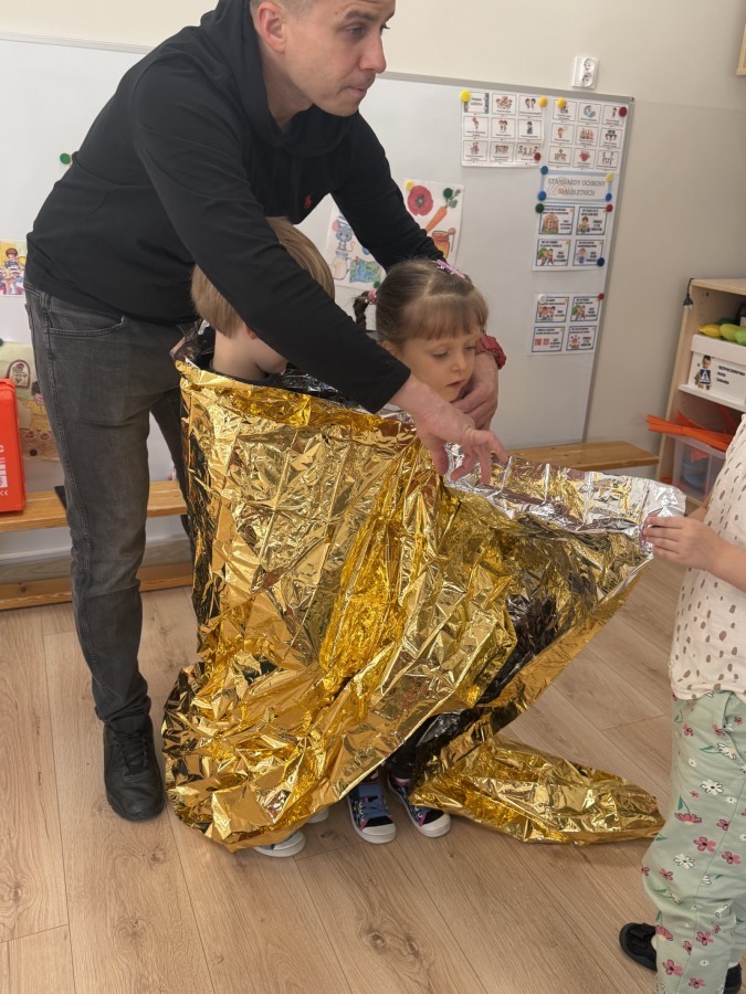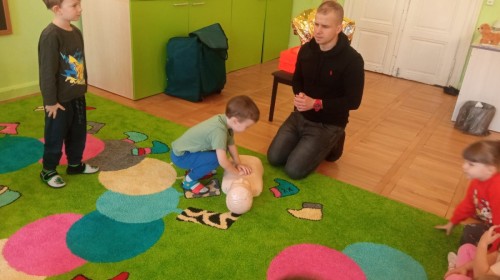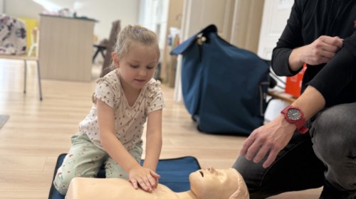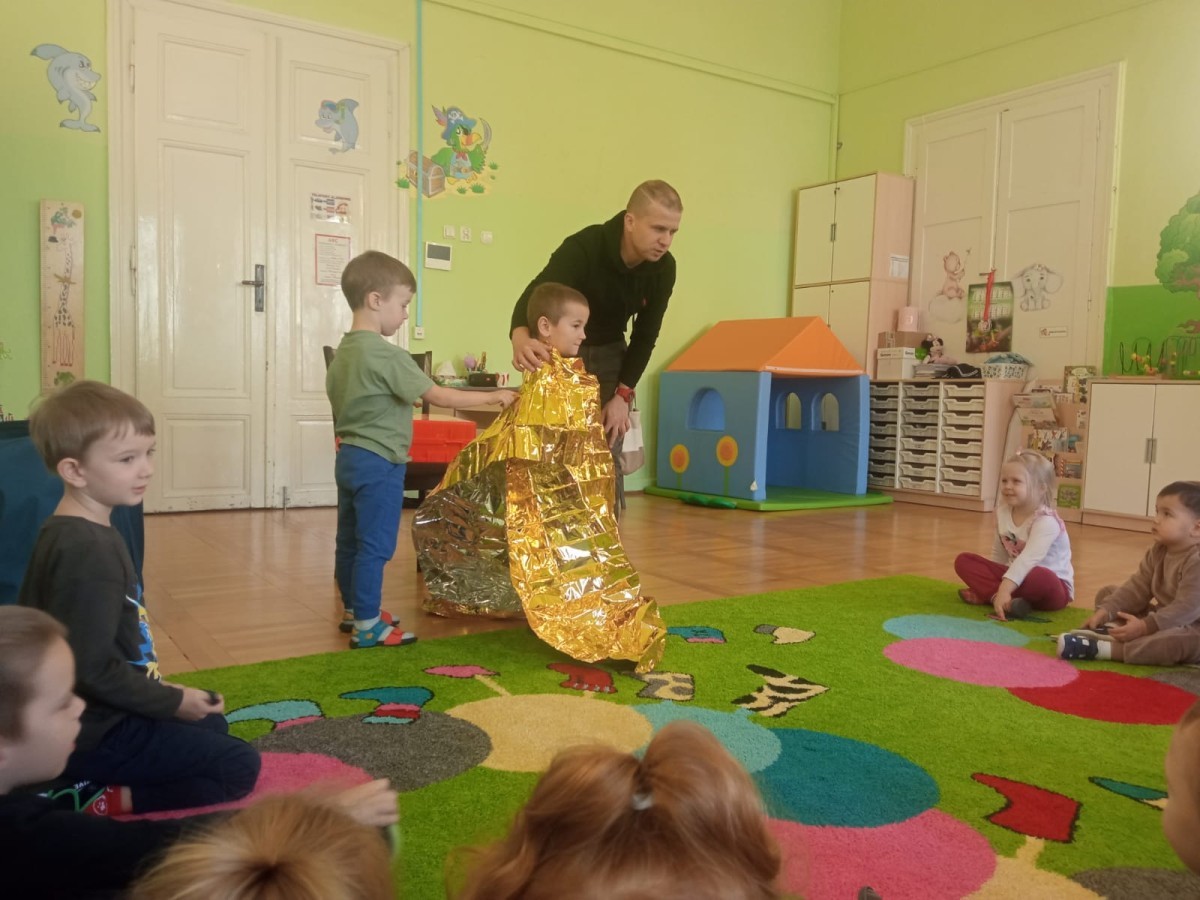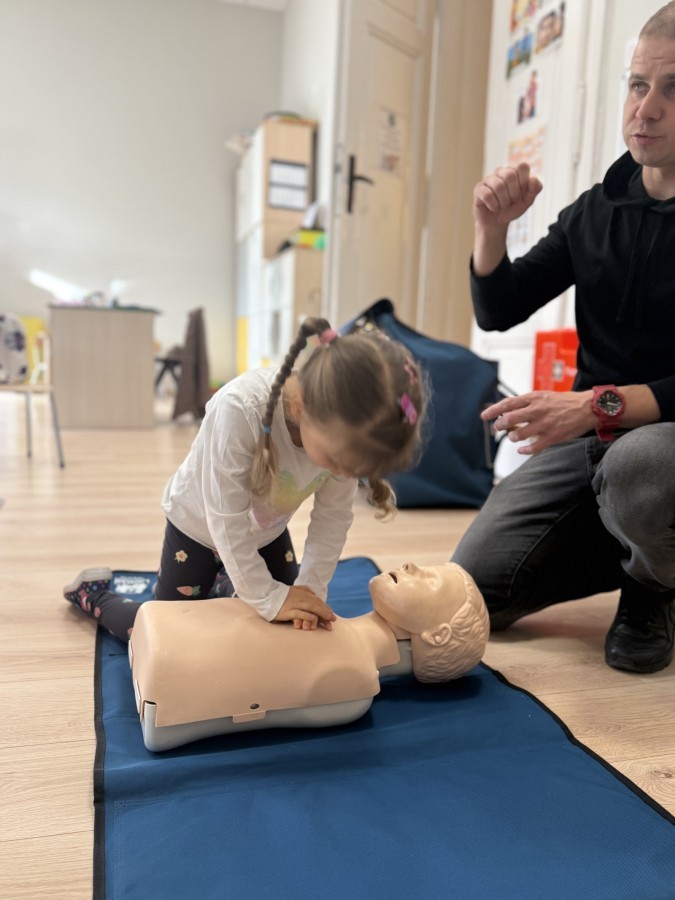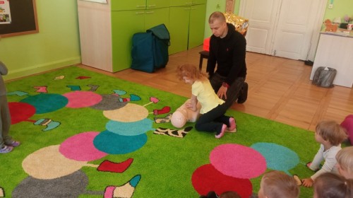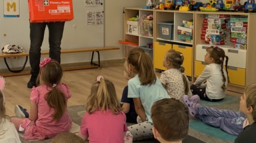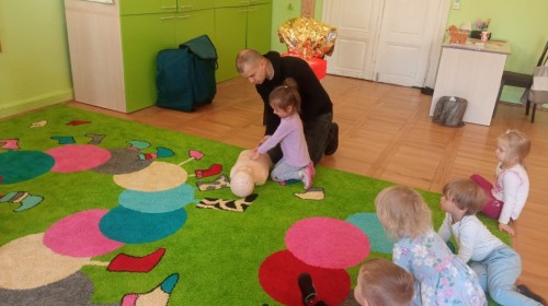 Podczas warsztatów przedszkolaki dowiedziały się, jak wezwać pomoc, co powiedzieć, dzwoniąc pod numer alarmowy 112, oraz jak zachować się, gdy ktoś potrzebuje pomocy. Dzieci z ogromnym zaangażowaniem ćwiczyły udzielanie pierwszej pomocy na fantomie, a także uczyły się, jak okryć poszkodowaną osobę kocem termicznym.