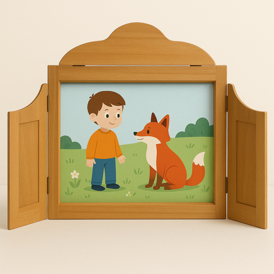Taki drewniany teatrzyk z wysuwanymi kartami książki nazywa się teatrzyk kamishibai.