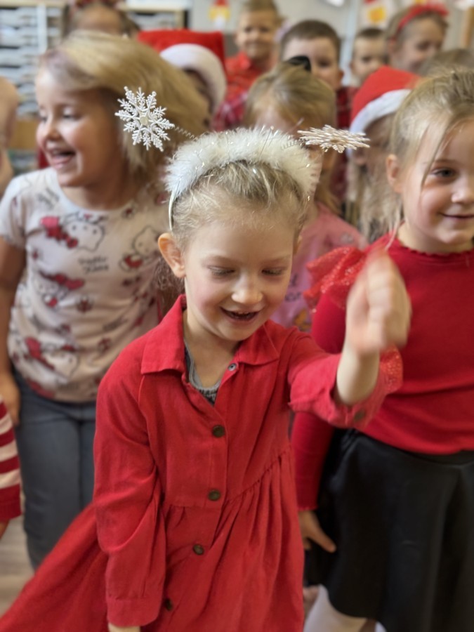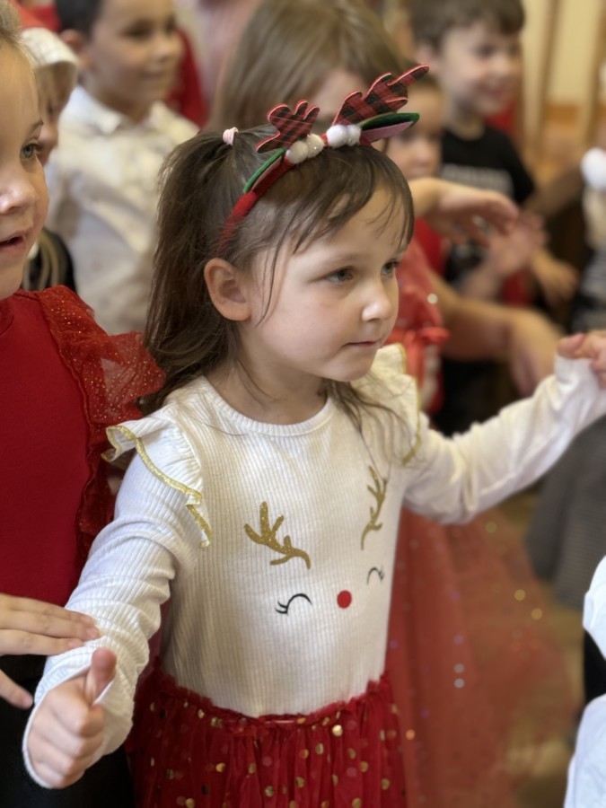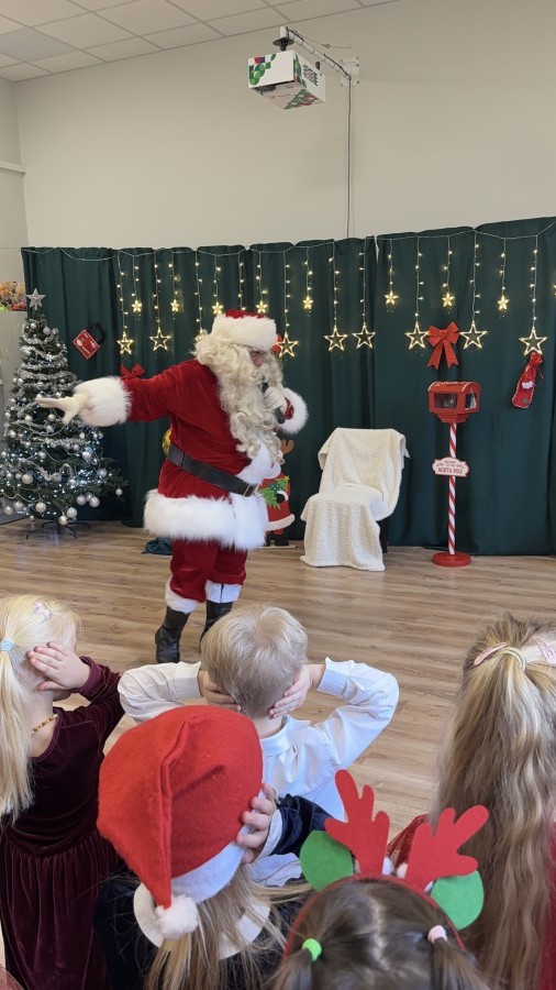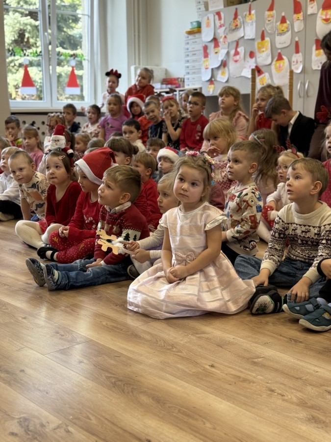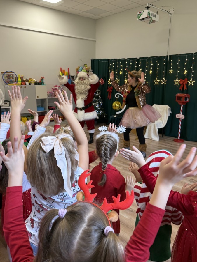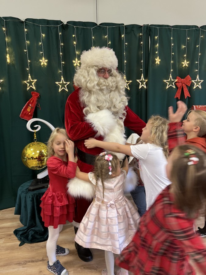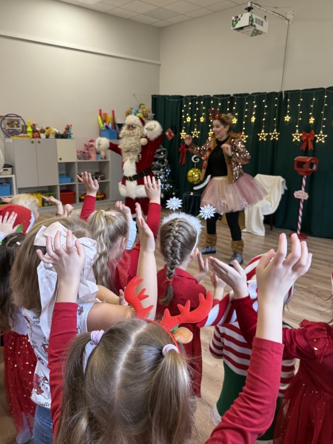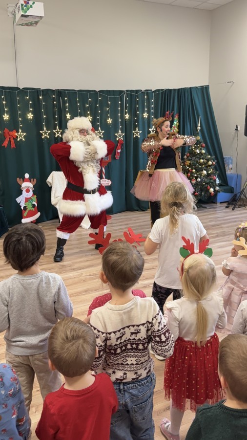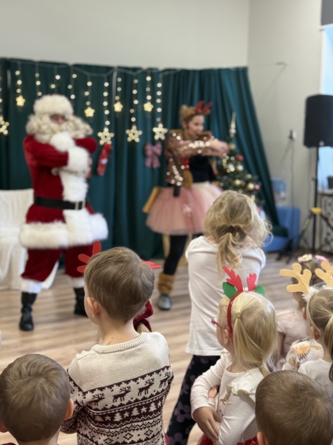 04.12 w naszym przedszkolu wydarzyło się coś naprawdę magicznego! Od samego rana dzieci z niecierpliwością wypatrywały wyjątkowego gościa – i wreszcie przybył Święty Mikołaj! Towarzyszył mu niezwykły przyjaciel – renifer, który okazał się prawdziwą gwiazdą disco! Spotkanie rozpoczęło się od radosnych okrzyków i świątecznych piosenek. Renifer rozkręcił zabawę niczym prawdziwy DJ – były taneczne animacje, wesoła muzyka i zabawy, w których dzieci brały udział z ogromnym entuzjazmem. Wspólnie tańczyliśmy, klaskaliśmy w rytm muzyki i uczyliśmy się śmiesznych układów tanecznych, które wywoływały salwy śmiechu. Nie zabrakło również mikołajkowych upominków.