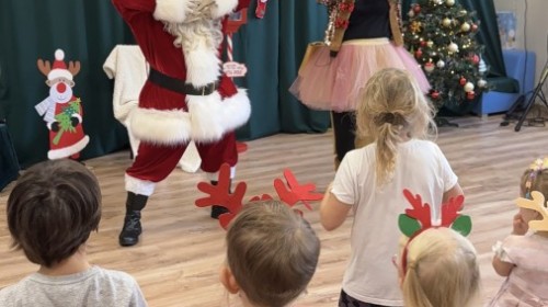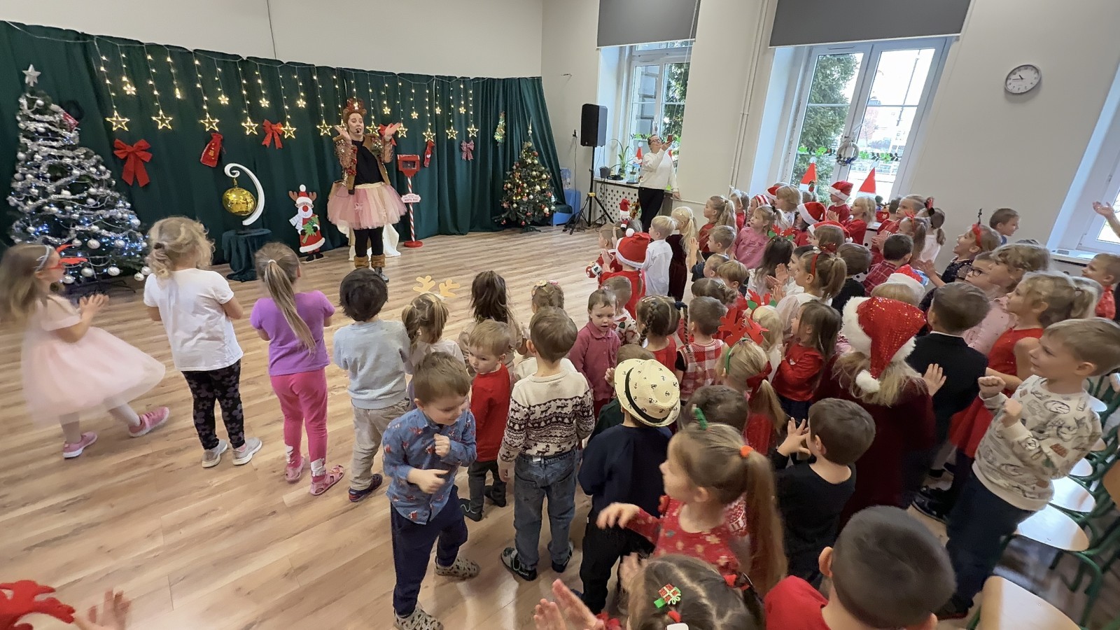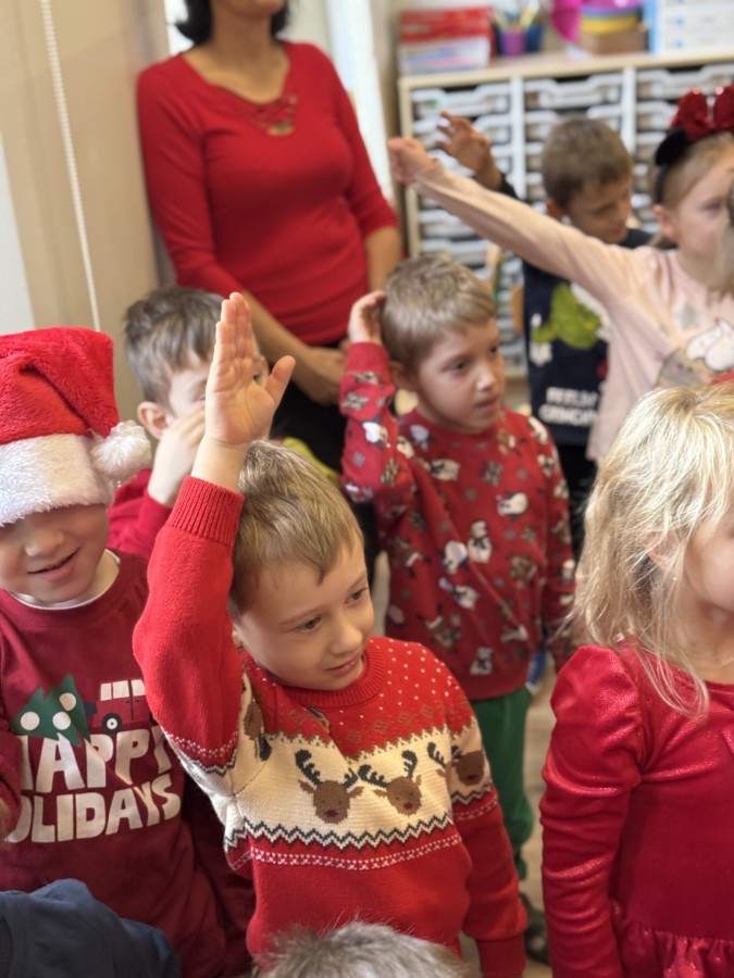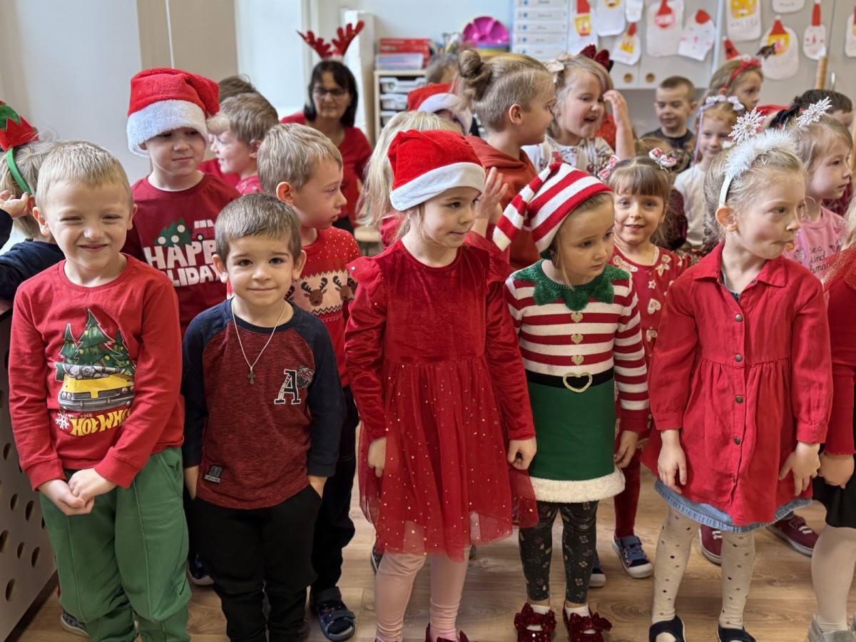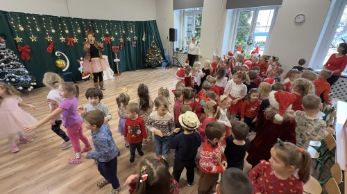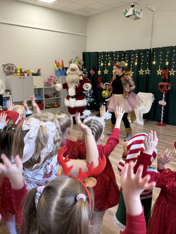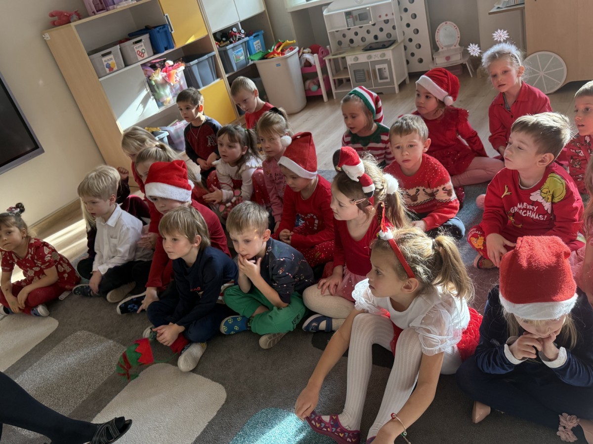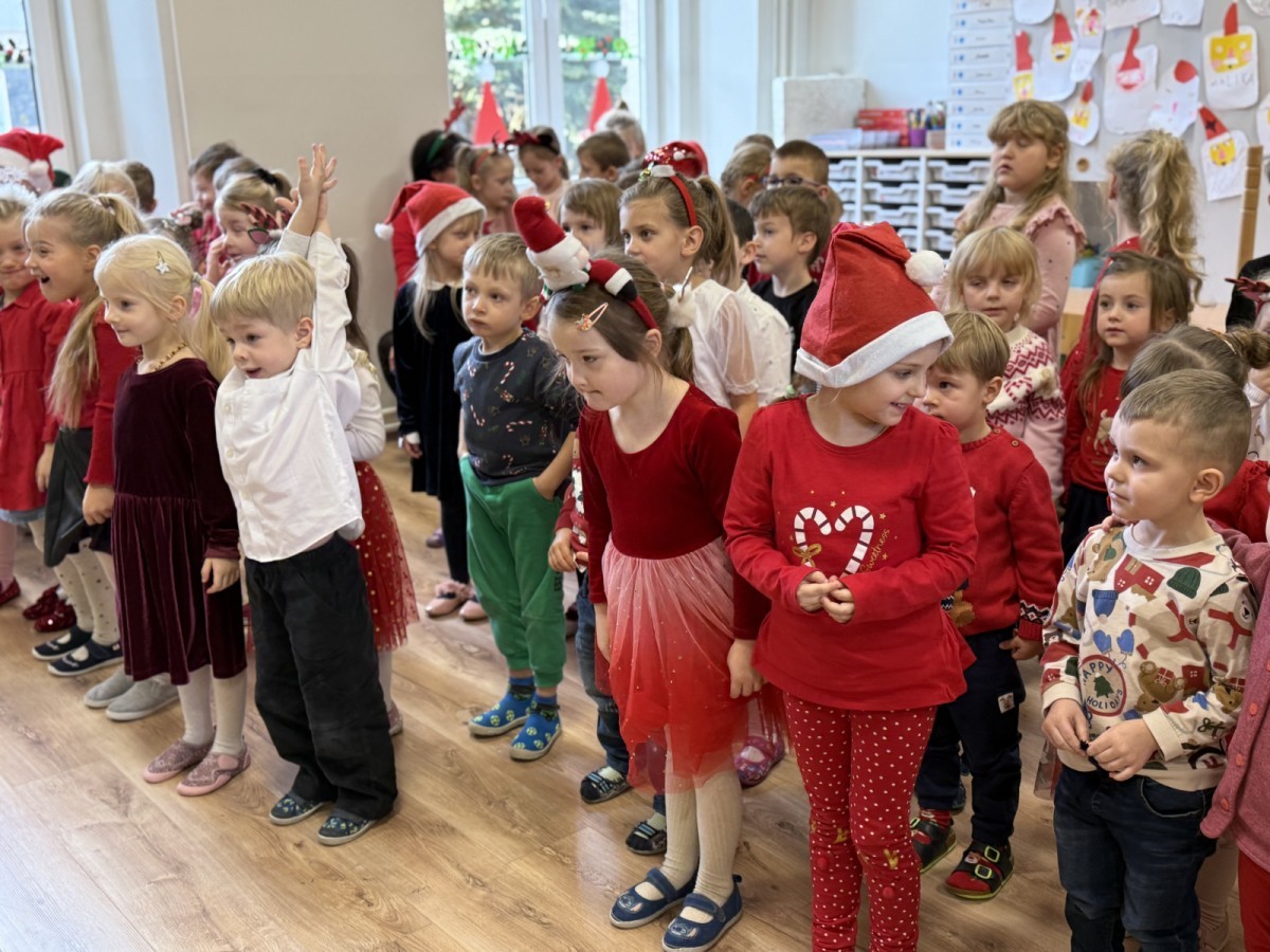 04.12 w naszym przedszkolu wydarzyło się coś naprawdę magicznego! Od samego rana dzieci z niecierpliwością wypatrywały wyjątkowego gościa – i wreszcie przybył Święty Mikołaj! Towarzyszył mu niezwykły przyjaciel – renifer, który okazał się prawdziwą gwiazdą disco! Spotkanie rozpoczęło się od radosnych okrzyków i świątecznych piosenek. Renifer rozkręcił zabawę niczym prawdziwy DJ – były taneczne animacje, wesoła muzyka i zabawy, w których dzieci brały udział z ogromnym entuzjazmem. Wspólnie tańczyliśmy, klaskaliśmy w rytm muzyki i uczyliśmy się śmiesznych układów tanecznych, które wywoływały salwy śmiechu. Nie zabrakło również mikołajkowych upominków.