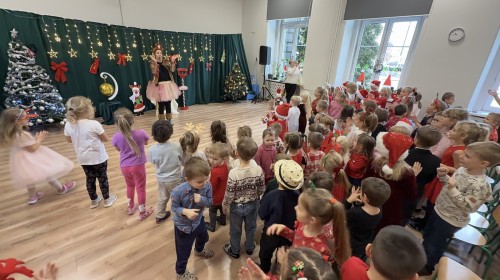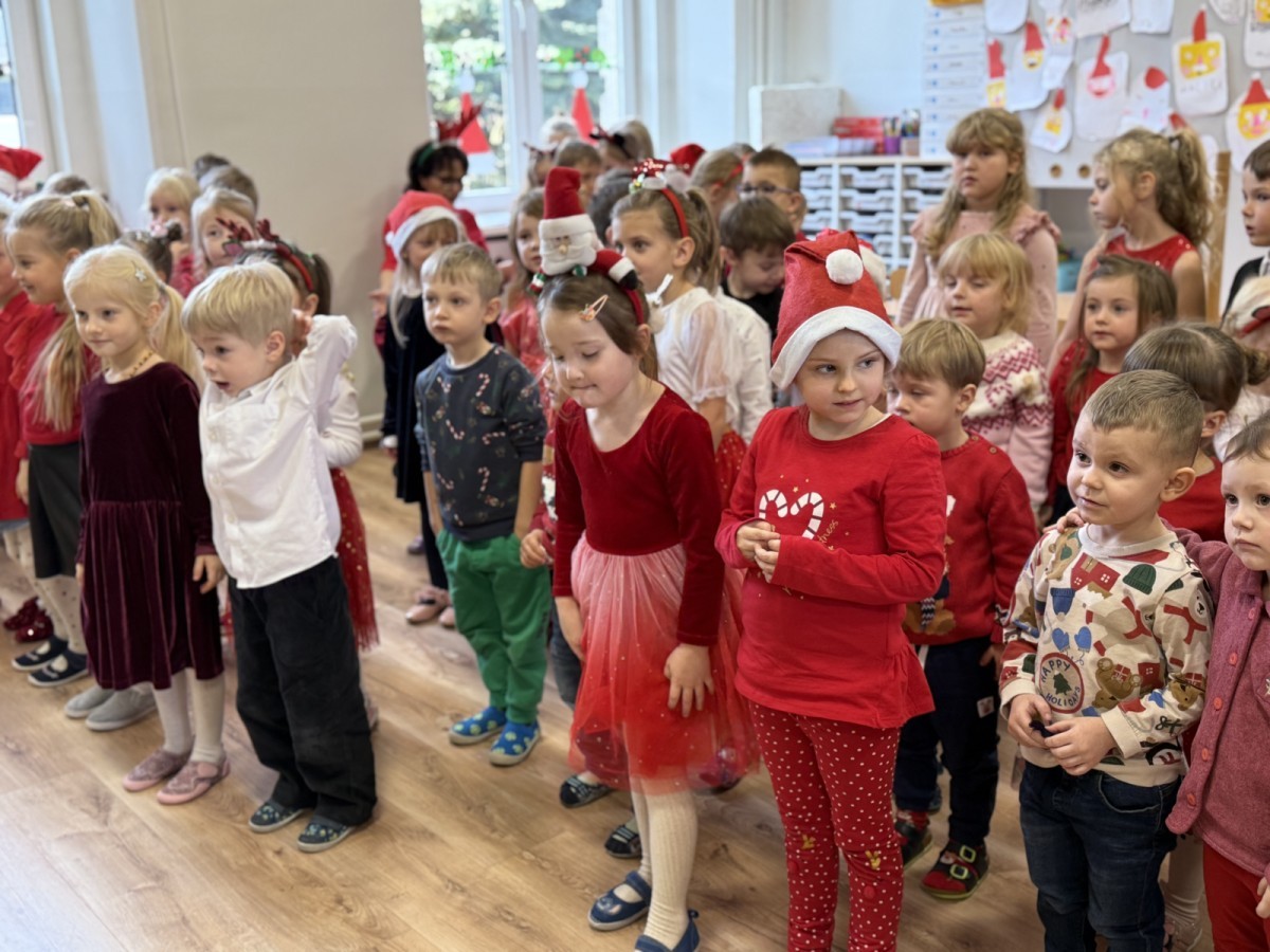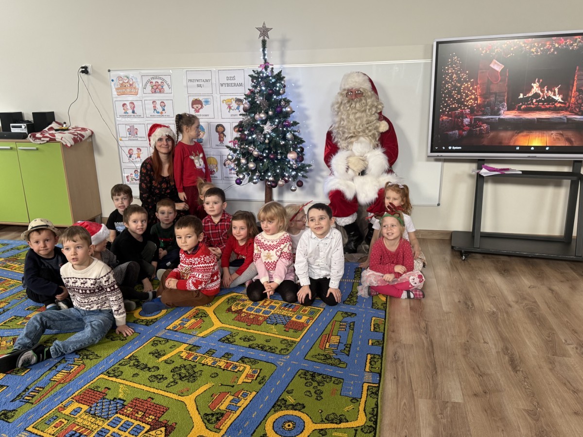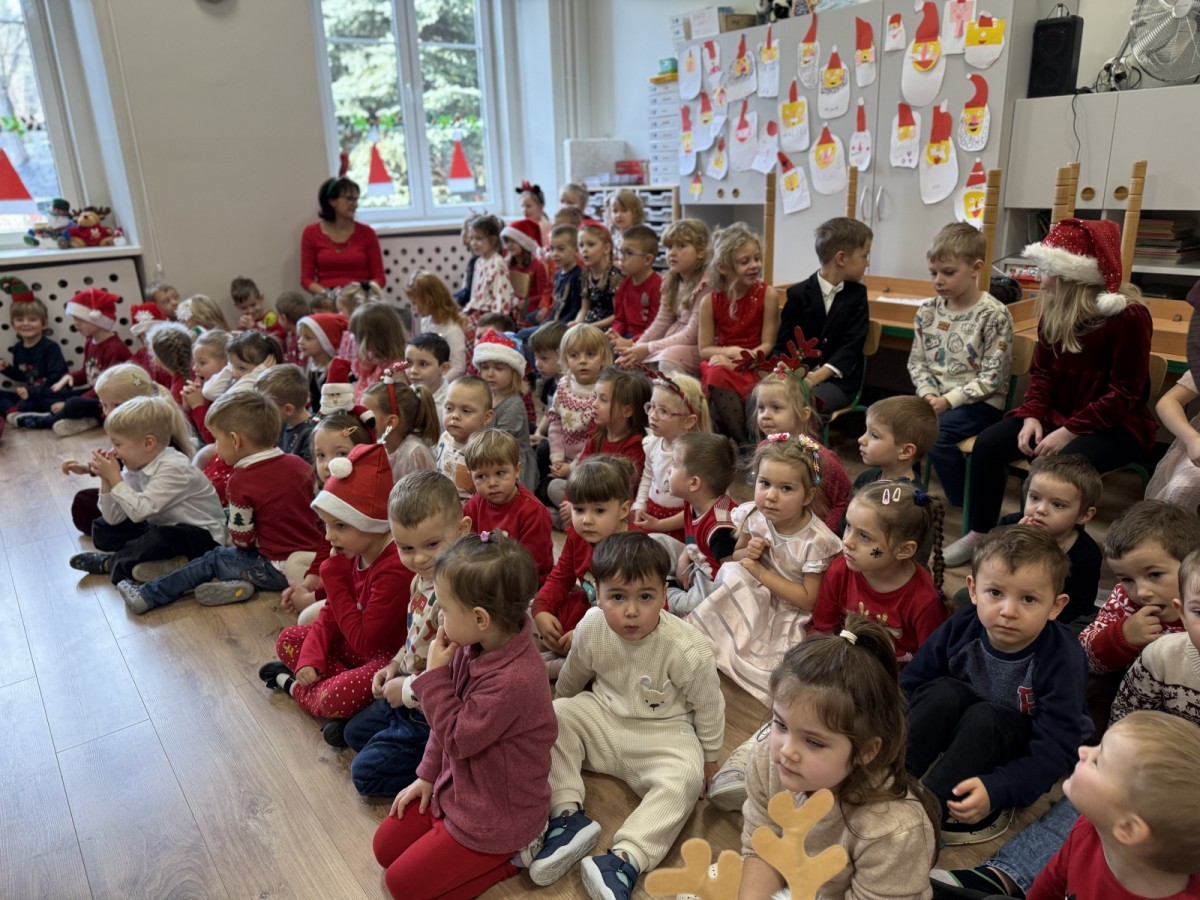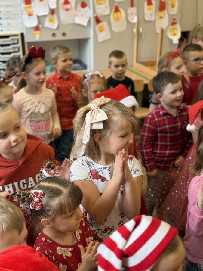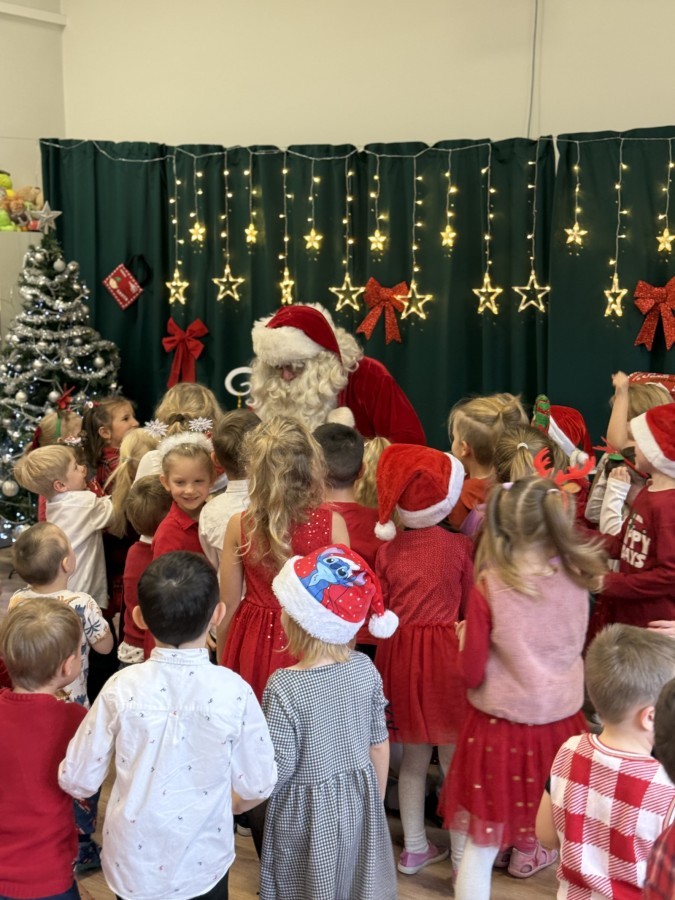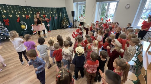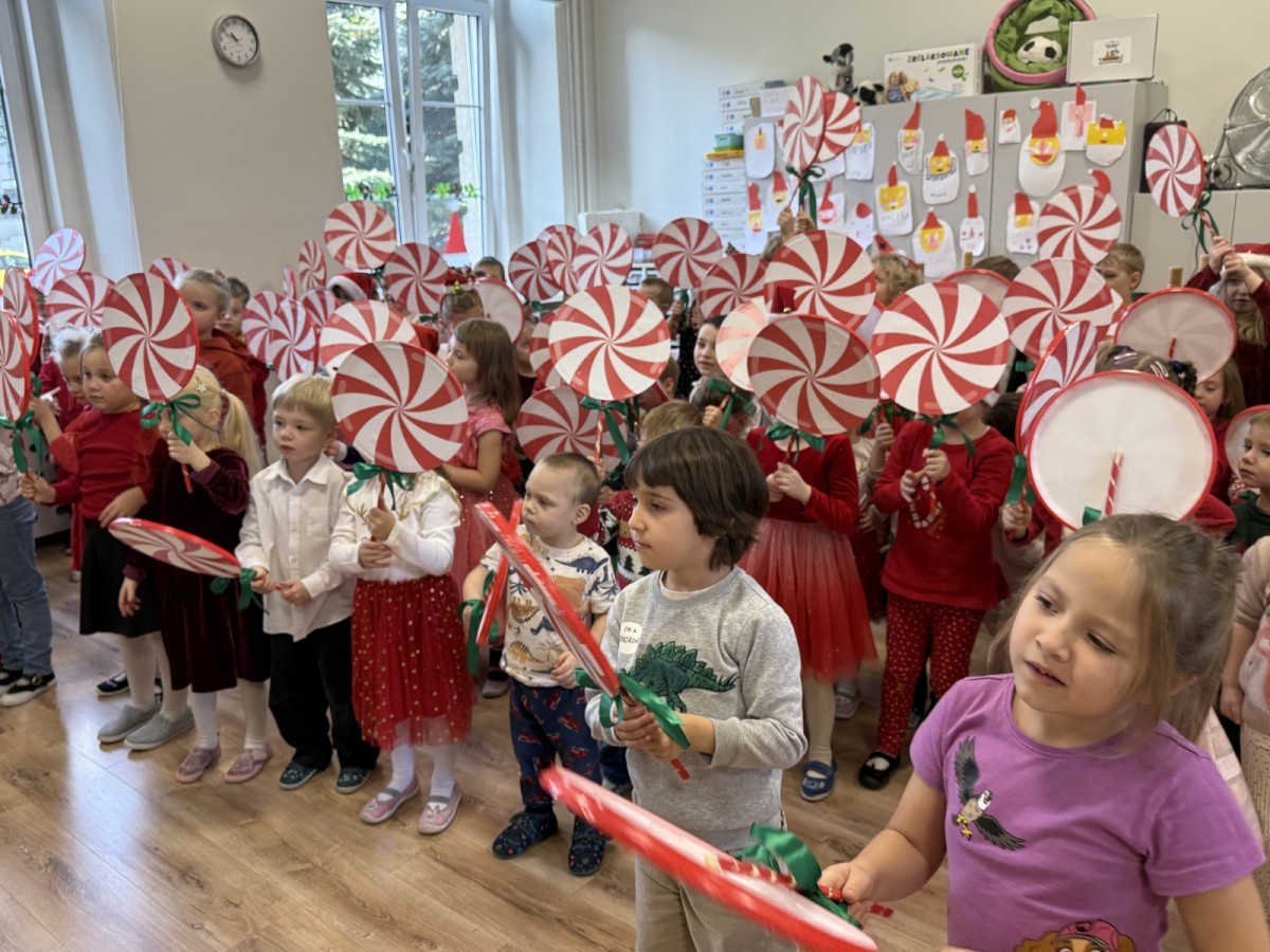 04.12 w naszym przedszkolu wydarzyło się coś naprawdę magicznego! Od samego rana dzieci z niecierpliwością wypatrywały wyjątkowego gościa – i wreszcie przybył Święty Mikołaj! Towarzyszył mu niezwykły przyjaciel – renifer, który okazał się prawdziwą gwiazdą disco! Spotkanie rozpoczęło się od radosnych okrzyków i świątecznych piosenek. Renifer rozkręcił zabawę niczym prawdziwy DJ – były taneczne animacje, wesoła muzyka i zabawy, w których dzieci brały udział z ogromnym entuzjazmem. Wspólnie tańczyliśmy, klaskaliśmy w rytm muzyki i uczyliśmy się śmiesznych układów tanecznych, które wywoływały salwy śmiechu. Nie zabrakło również mikołajkowych upominków.