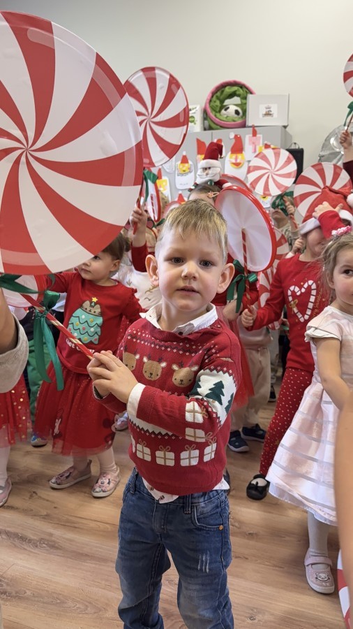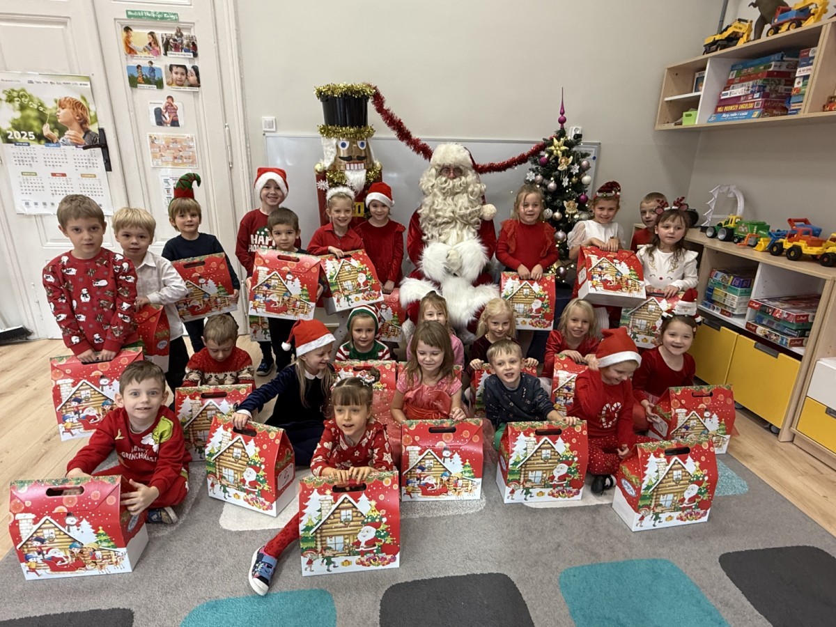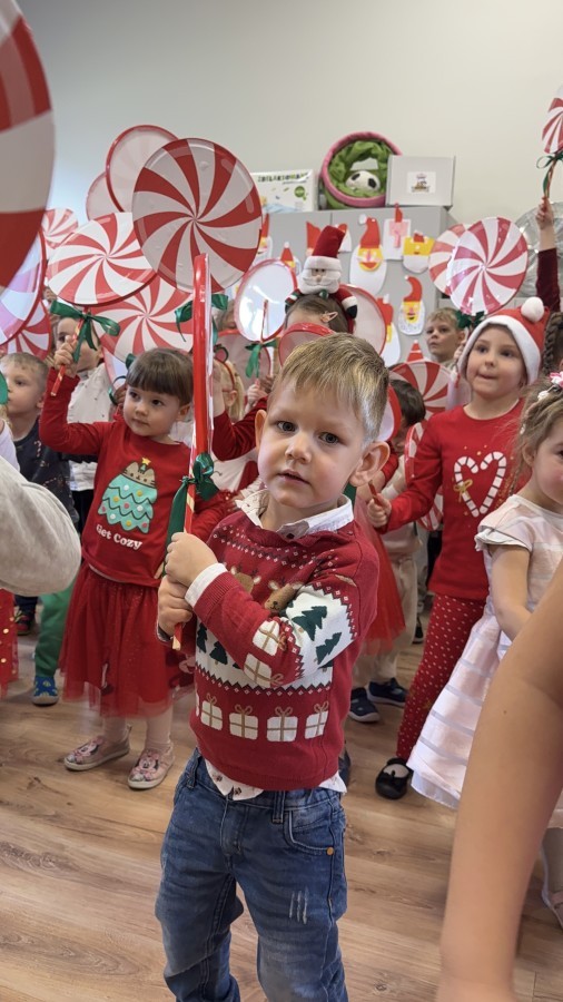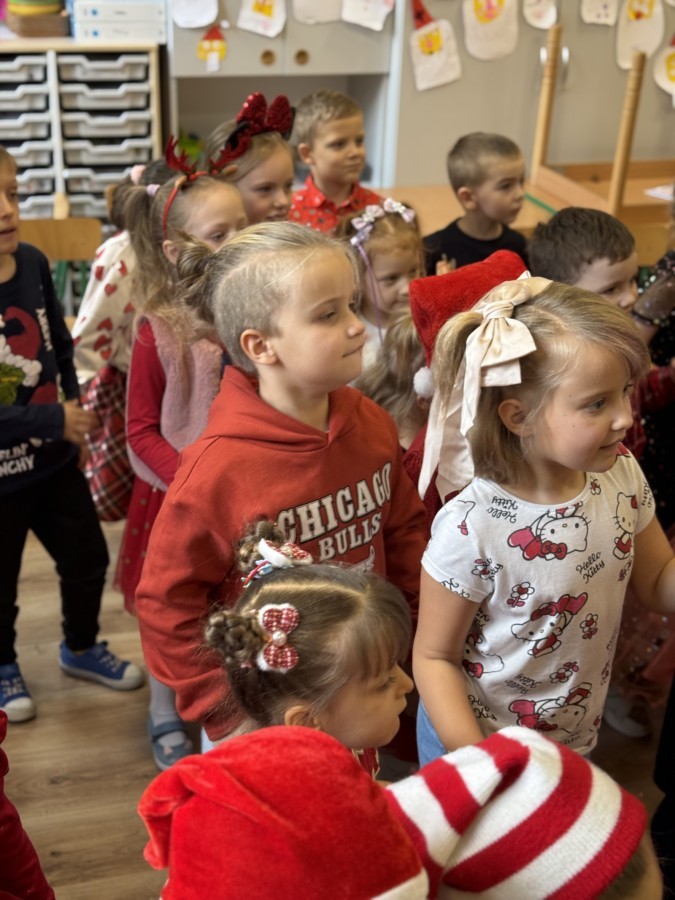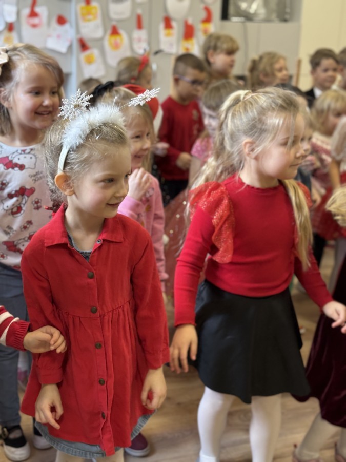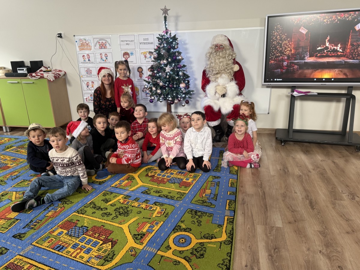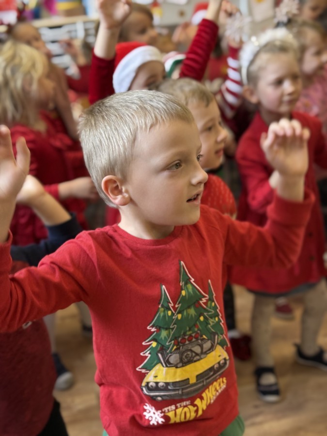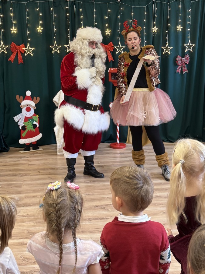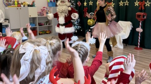 04.12 w naszym przedszkolu wydarzyło się coś naprawdę magicznego! Od samego rana dzieci z niecierpliwością wypatrywały wyjątkowego gościa – i wreszcie przybył Święty Mikołaj! Towarzyszył mu niezwykły przyjaciel – renifer, który okazał się prawdziwą gwiazdą disco! Spotkanie rozpoczęło się od radosnych okrzyków i świątecznych piosenek. Renifer rozkręcił zabawę niczym prawdziwy DJ – były taneczne animacje, wesoła muzyka i zabawy, w których dzieci brały udział z ogromnym entuzjazmem. Wspólnie tańczyliśmy, klaskaliśmy w rytm muzyki i uczyliśmy się śmiesznych układów tanecznych, które wywoływały salwy śmiechu. Nie zabrakło również mikołajkowych upominków.