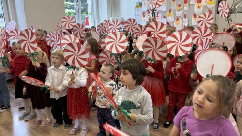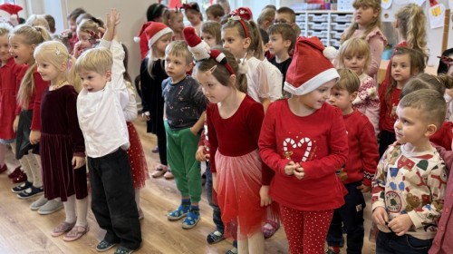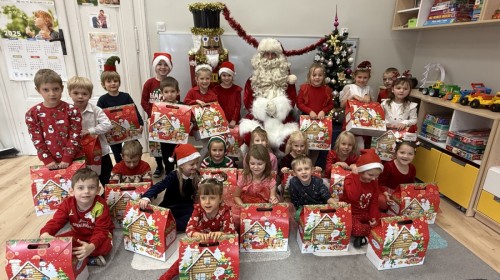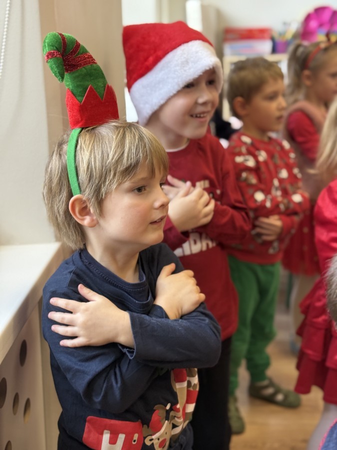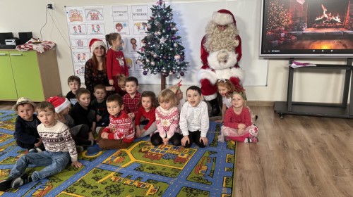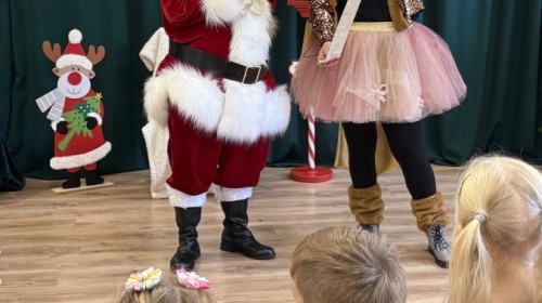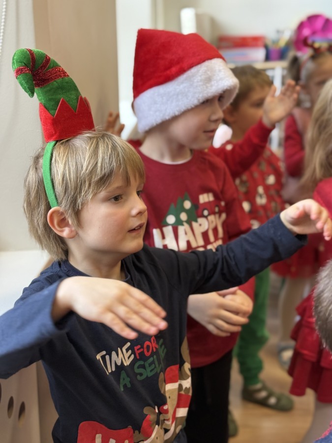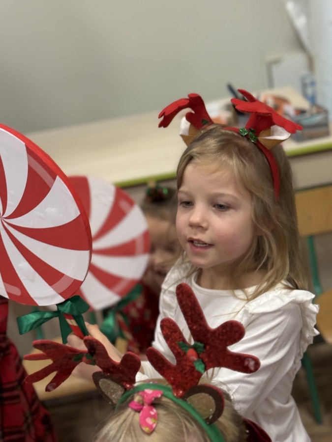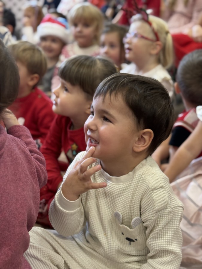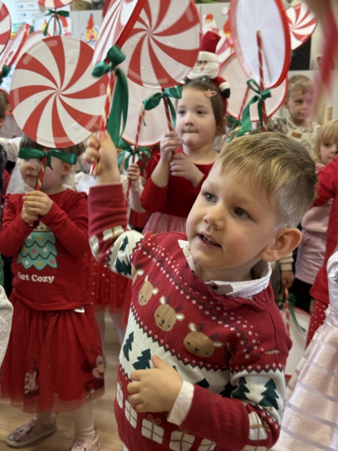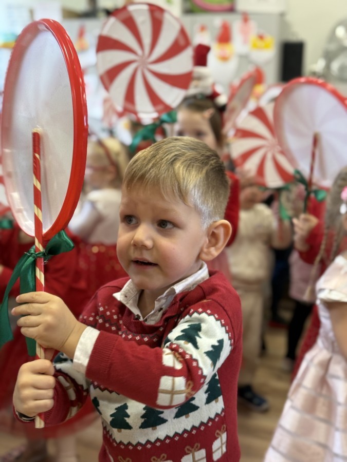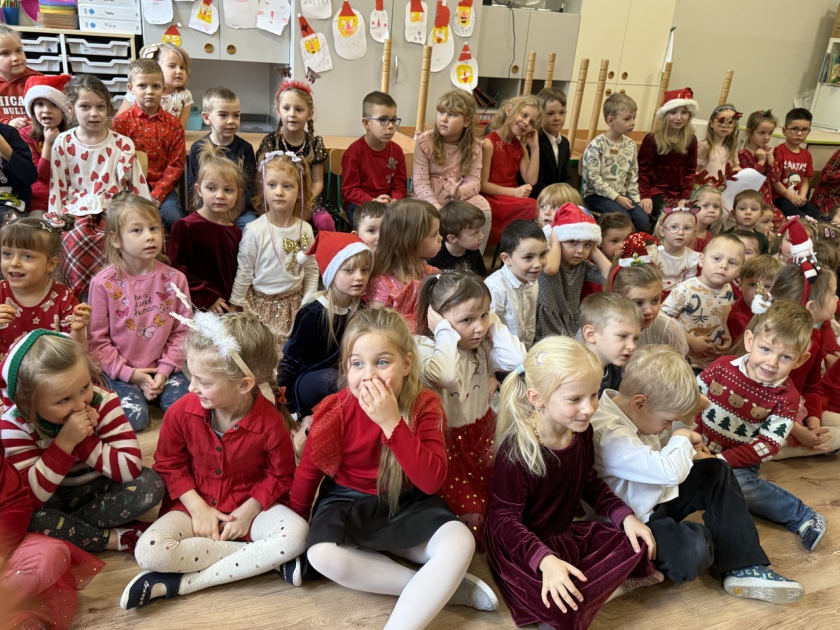 04.12 w naszym przedszkolu wydarzyło się coś naprawdę magicznego! Od samego rana dzieci z niecierpliwością wypatrywały wyjątkowego gościa – i wreszcie przybył Święty Mikołaj! Towarzyszył mu niezwykły przyjaciel – renifer, który okazał się prawdziwą gwiazdą disco! Spotkanie rozpoczęło się od radosnych okrzyków i świątecznych piosenek. Renifer rozkręcił zabawę niczym prawdziwy DJ – były taneczne animacje, wesoła muzyka i zabawy, w których dzieci brały udział z ogromnym entuzjazmem. Wspólnie tańczyliśmy, klaskaliśmy w rytm muzyki i uczyliśmy się śmiesznych układów tanecznych, które wywoływały salwy śmiechu. Nie zabrakło również mikołajkowych upominków.